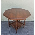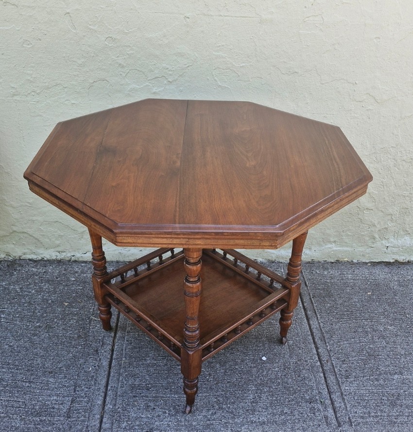 A 1800s walnut octagonal occasional table with a gallery shelf, bearing the stamp