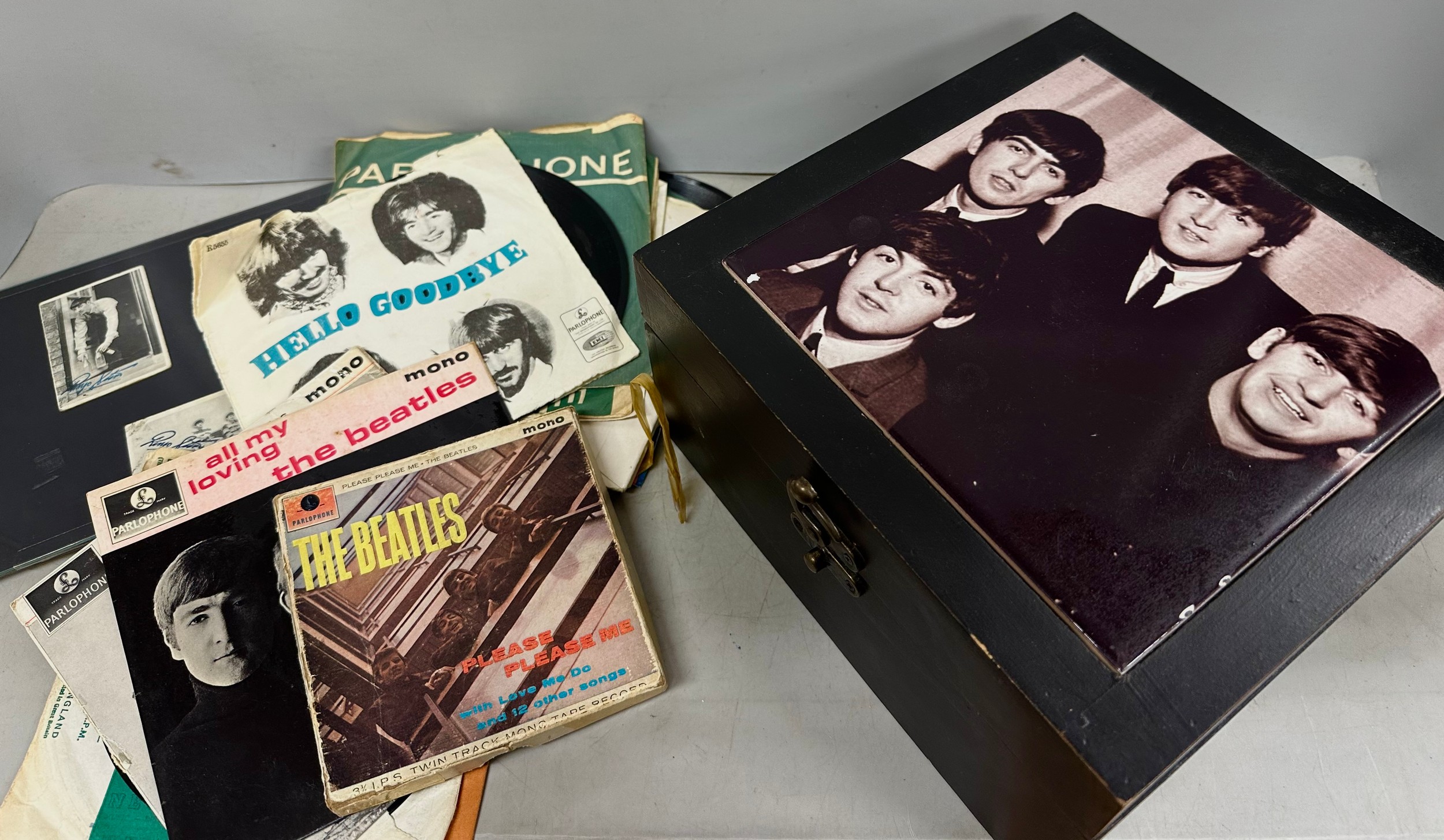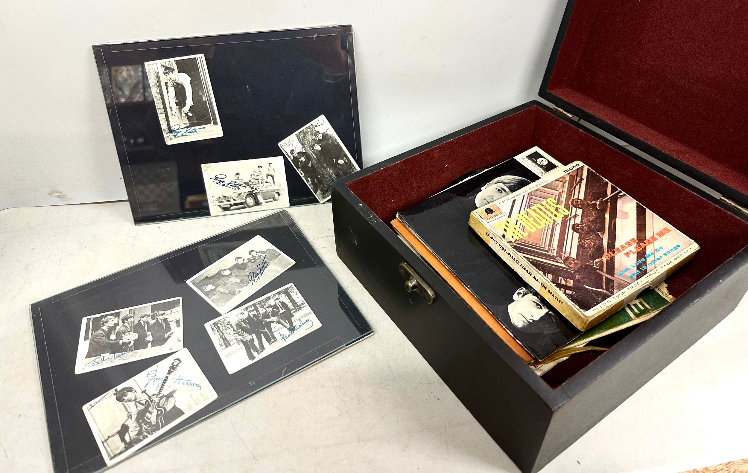 The Beatles; seven vintage The Beatles collectors cards photographs signed, with collection of 45rpm singles and a 'Please Please Me' tape record