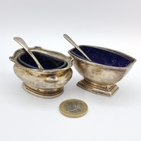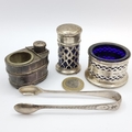 A collection of silver items, the first a Japanese silver example of a salt and pepper cruet in the form of a tub, maker 'K. Uyeda' stamped to base. Also a sterling silver pepper cruet with Bristol blue liner and lattice design to body, hallmarked Birmingham 1923, maker Docker & Burn Ltd, total weight 33.8g. An open top mustard pot with Bristol blue liner and lattice designed body, hallmarked Birmingham 1932, maker William Suckling Ltd, weight of silver 14.75g. Together with a pair of sterling silver sugar nips, hallmarked Sheffield 1926, maker Cooper Brothers & Sons Ltd, weight 14.45g.