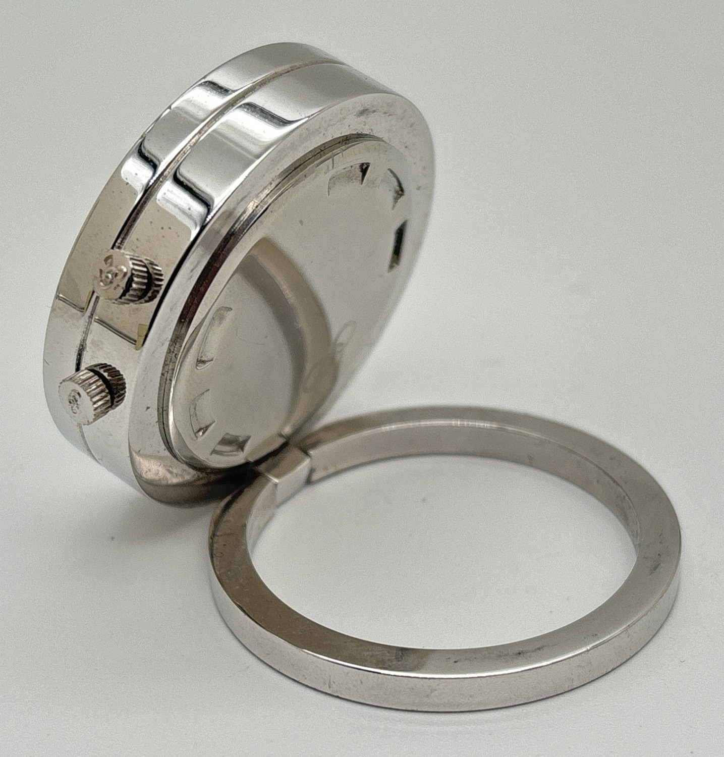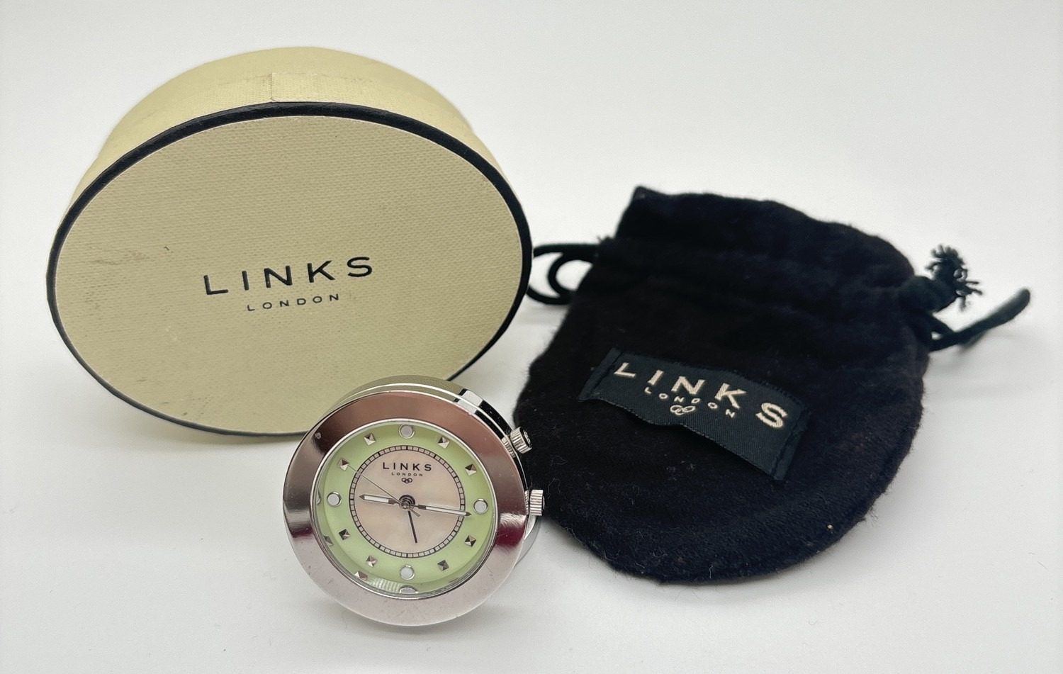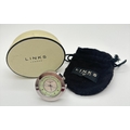 A small circular travel alarm clock by Links Of London. Stainless steel silver finish case and fixed ring stand. Pale green and mother of pearl face with silver tone hour markers and luminous hands. Working order, complete with pouch bad and box. Approx. 4cm diameter.