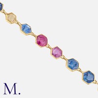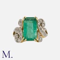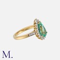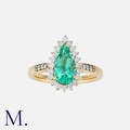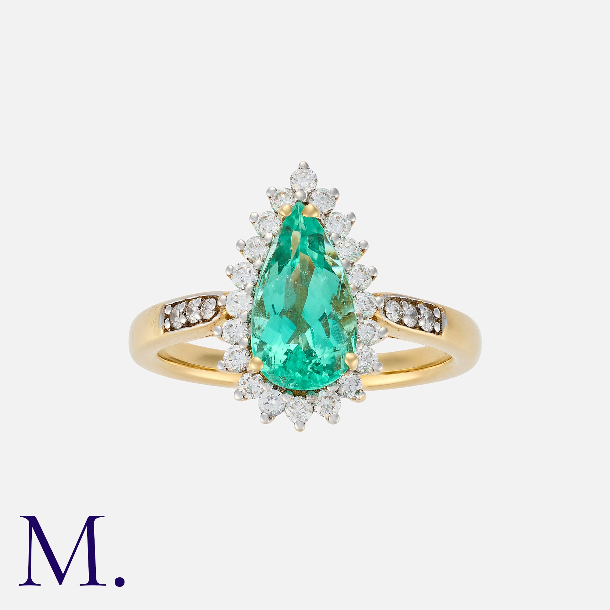 An Emerald and Diamond Cluster Ring in 18K yellow gold, set with a pear-cut emerald weighing approx. 1.8ct with round cut diamonds in surround and to the shoulders. Engraved '750' and tests indicate 18ct gold.