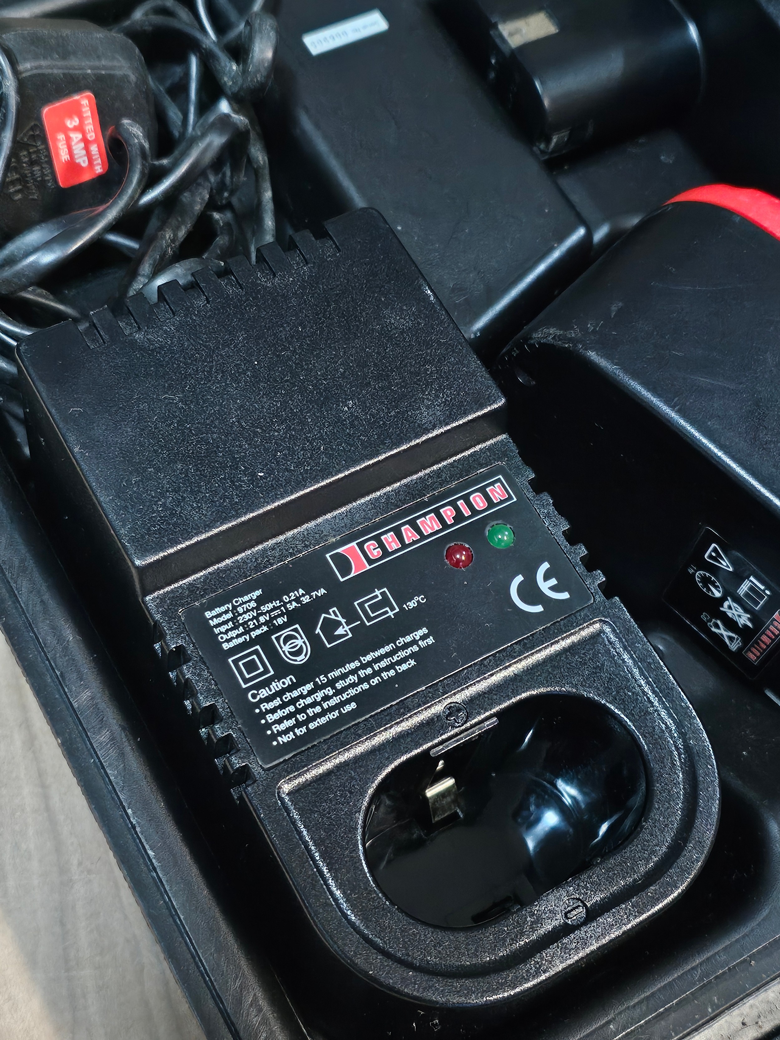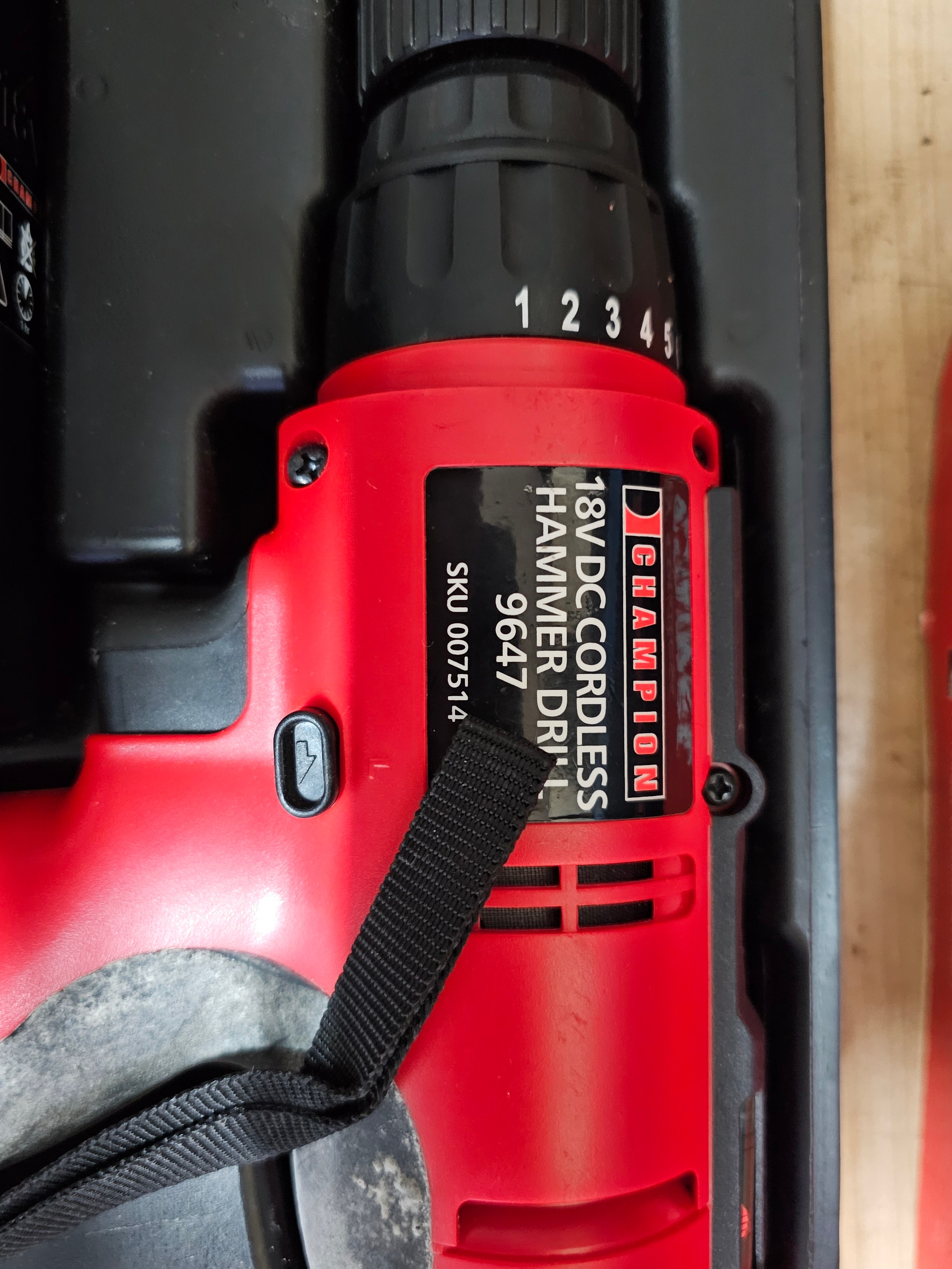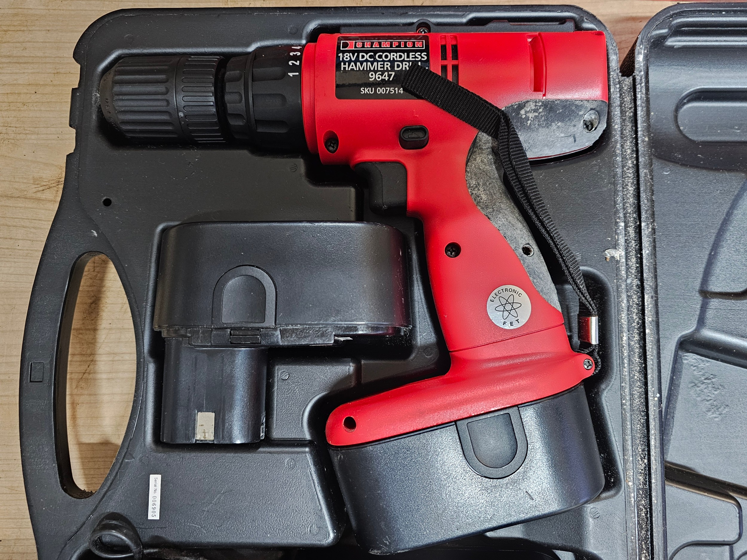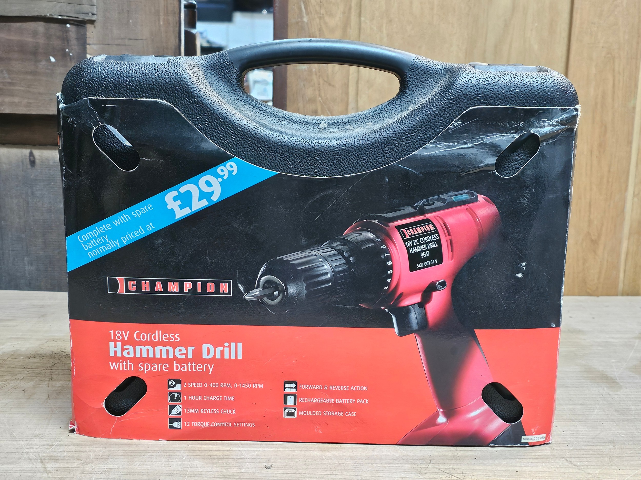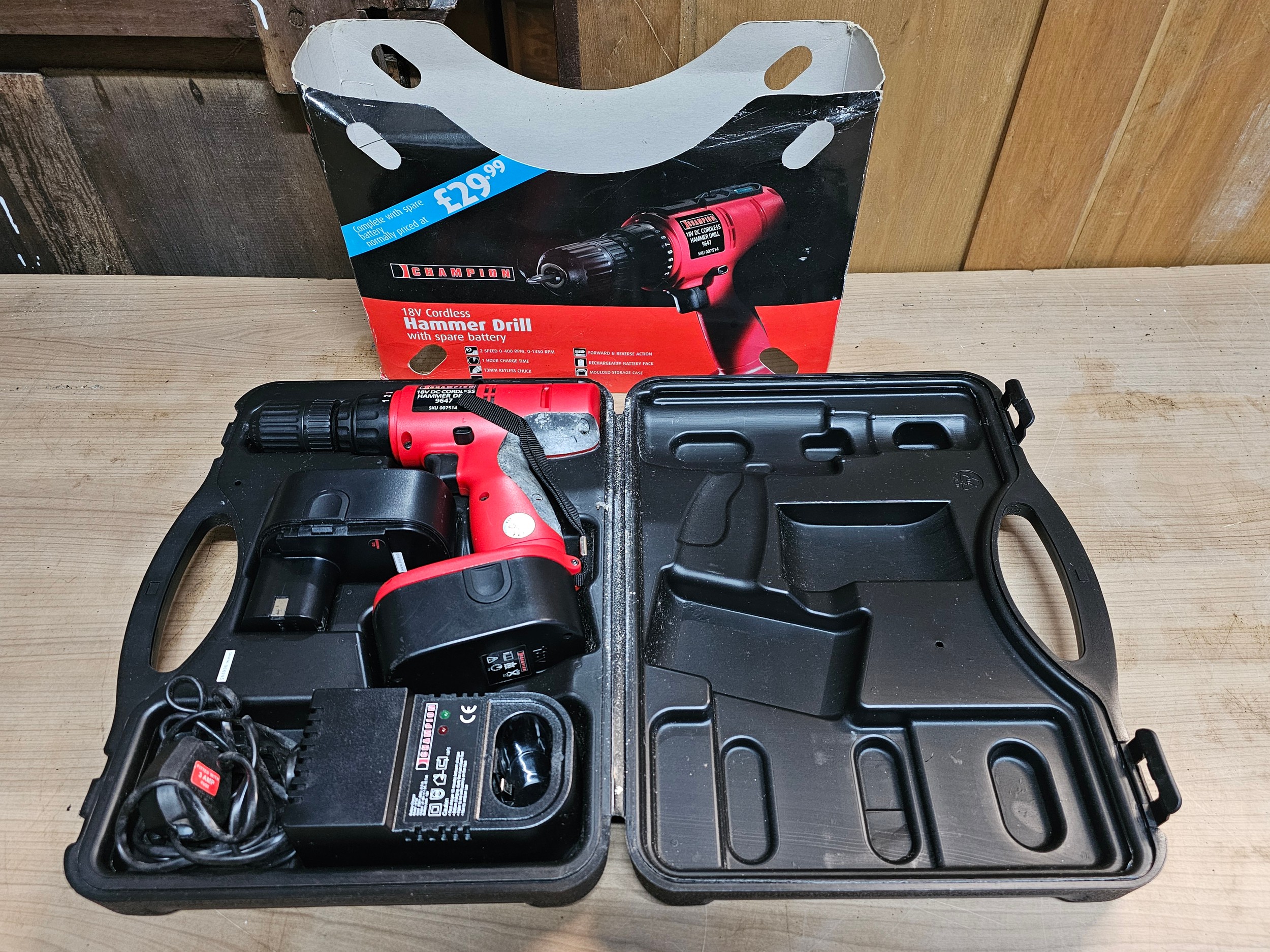 Champion 18v cordless hammer drill 9647 complete with 2x batteries and charging dock - model SKU007514 in orginal case ad outer sleeve.