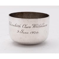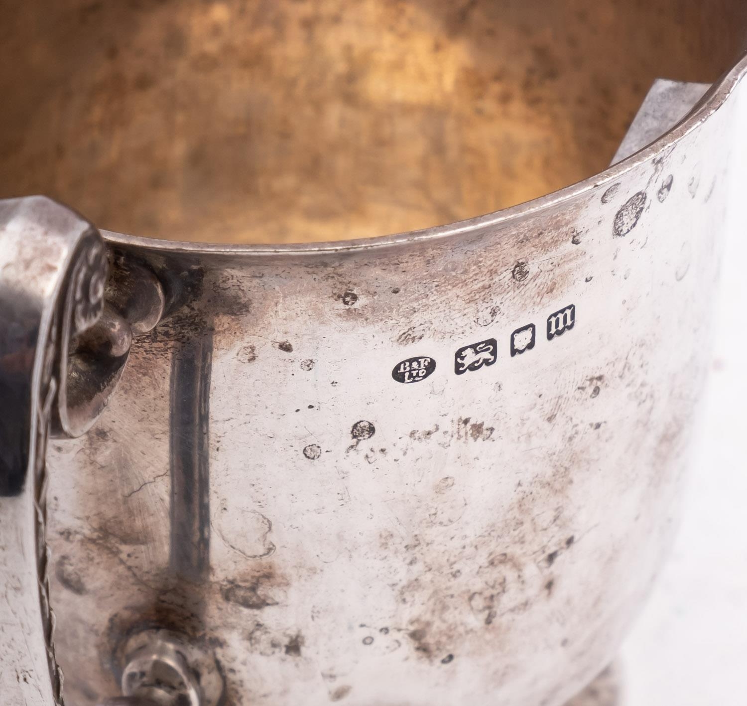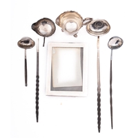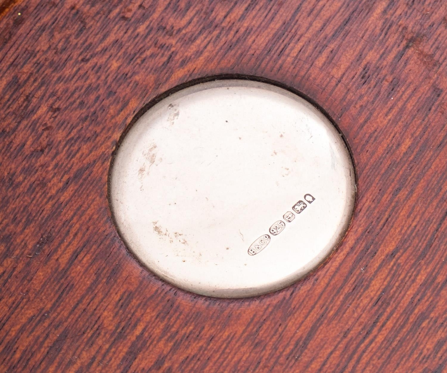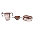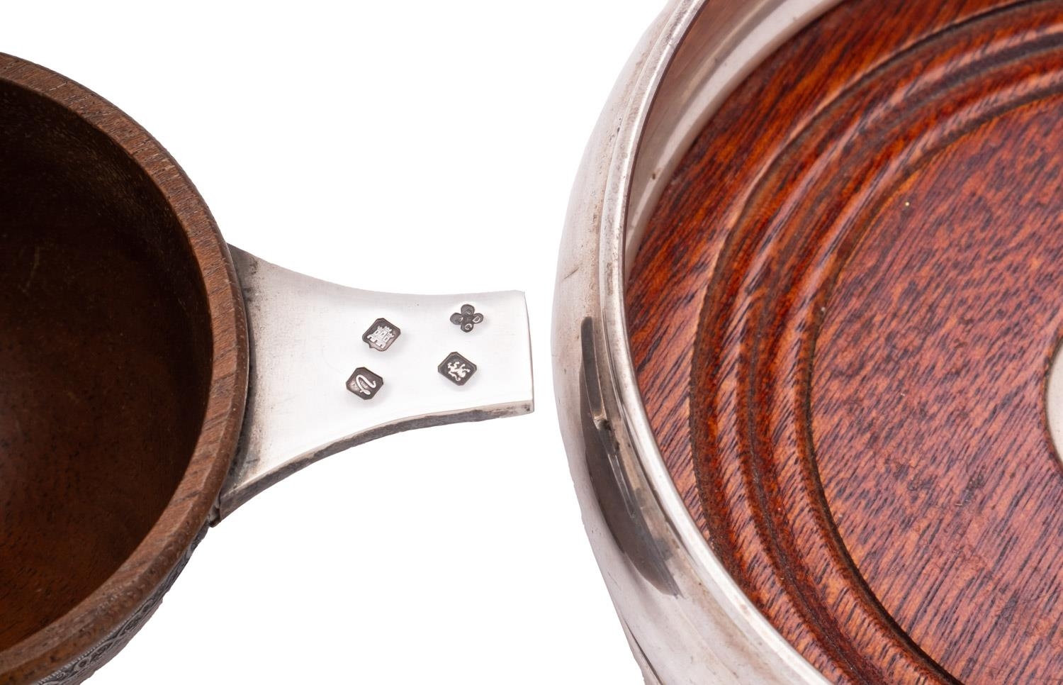 A mixed group of silver including; an Elizabeth II silver and mahogany quaiche by Isle of Mull Silver Co, Edinburgh 1995, decorated with celtic bands, 13cm. 5.1ins. diameter a Edward VII two handled cup by Blackmore & Fletcher Ltd, London 1907, a silver and mahogany decanter coaster and an Elizabeth II golf ball marker, 417gms., gross,(4)
