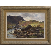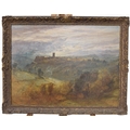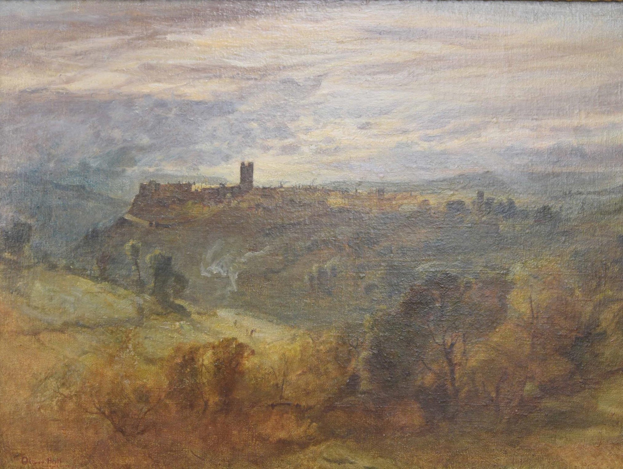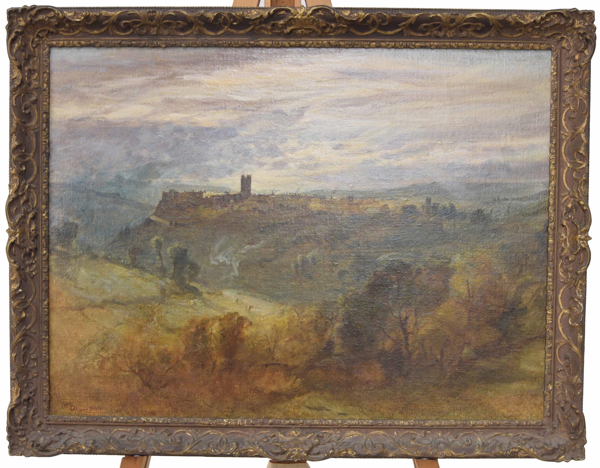 Oliver Hall RA., RWS., RE., (1869-1957) - A view of Richmond, North Yorkshire with figures on the river Swale, signed oil on canvas, 18" x 24"