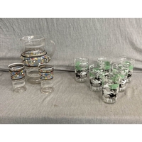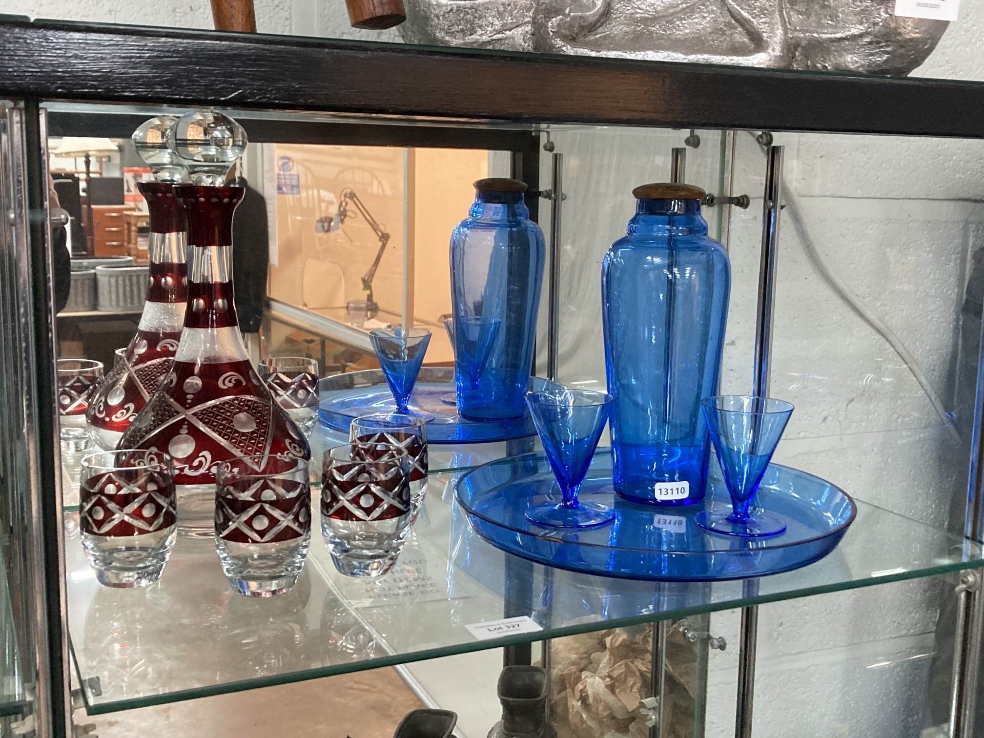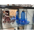 Blue glass cocktail shaker with a pair of matching glasses on tray & a Bohemia glass decanter & 4 matching glasses