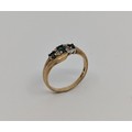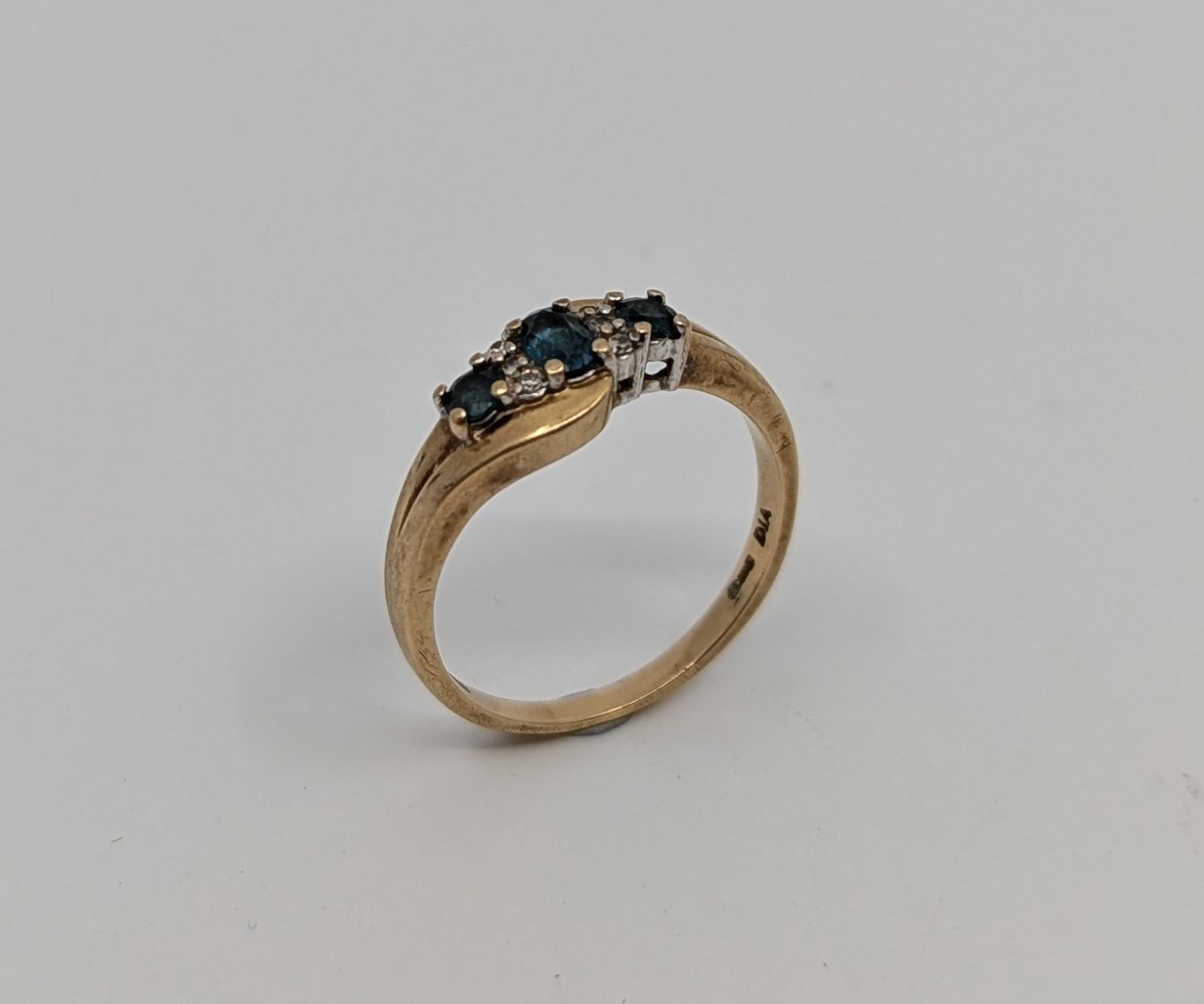 set with a central approx. 5mm x 3mm oval brilliant cut greenish blue paste stone and two approx. 3mm round brilliant cut greenish blue paste stone and six melee round brilliant cut diamonds, hallmarked "375" for 9ct gold and "DIA", size P 1/2, approx. 2.8g gross