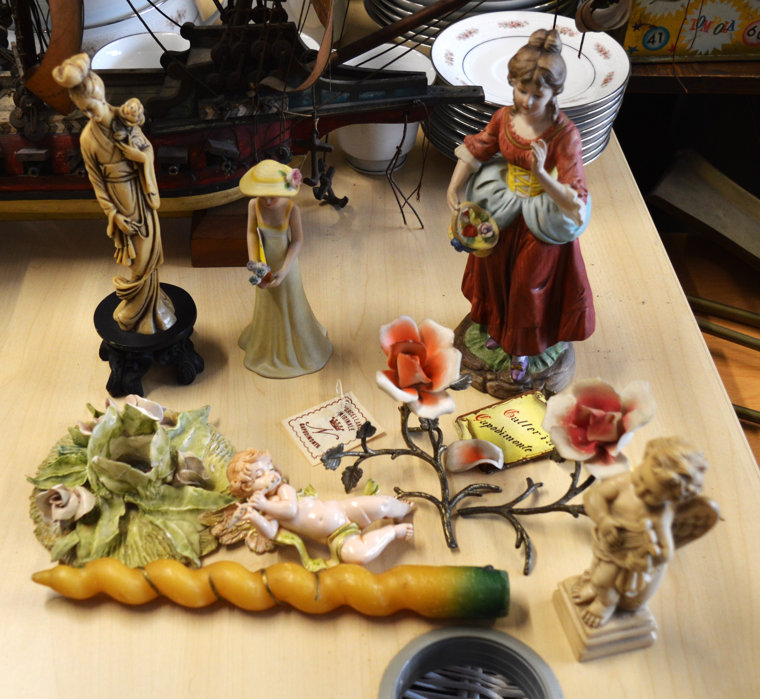 Selection of Ornamentation Including Two Capodimonte Flower Table Decorations (One Petal Break), Cherubs, etc