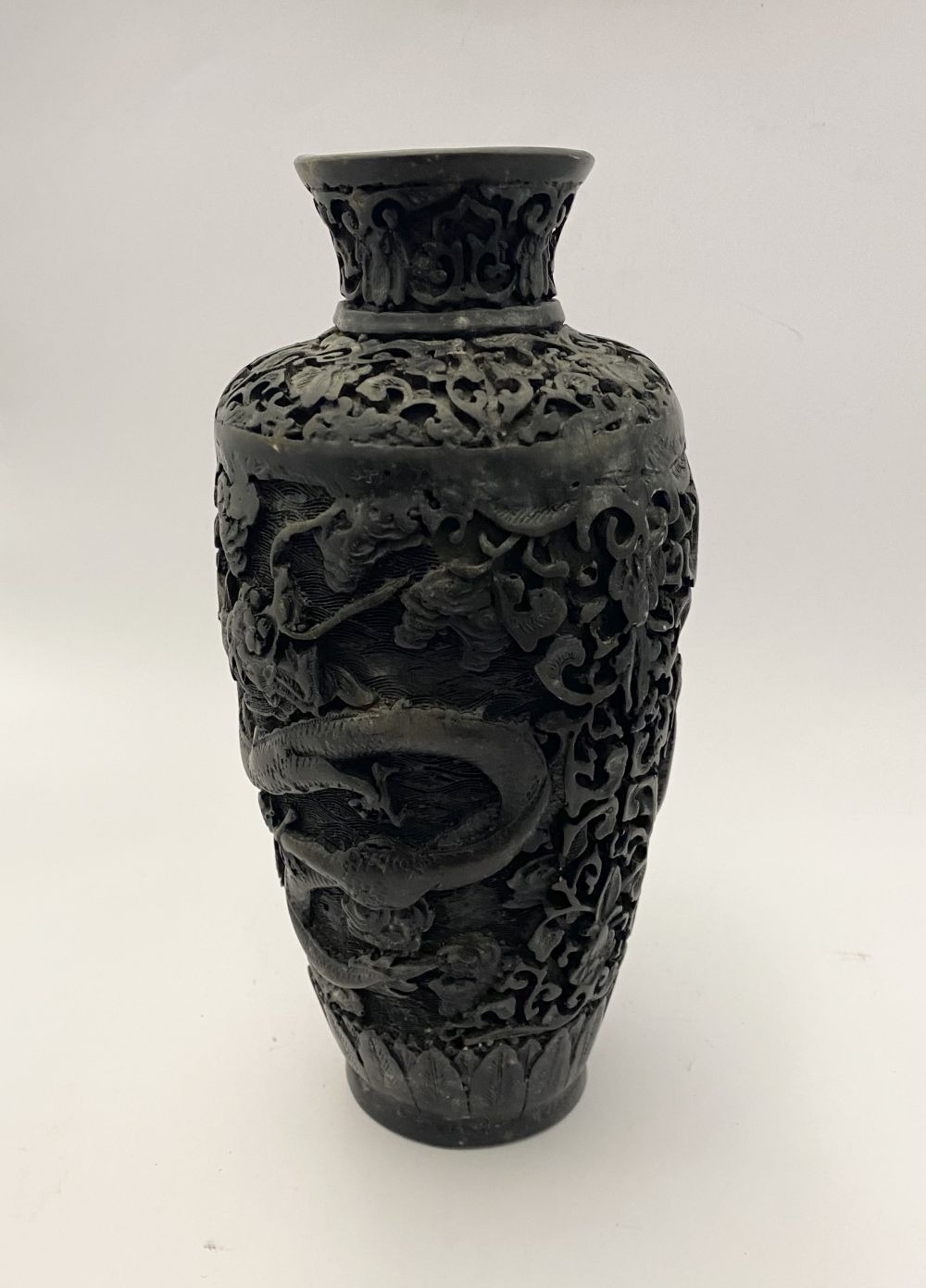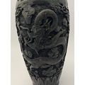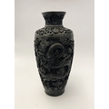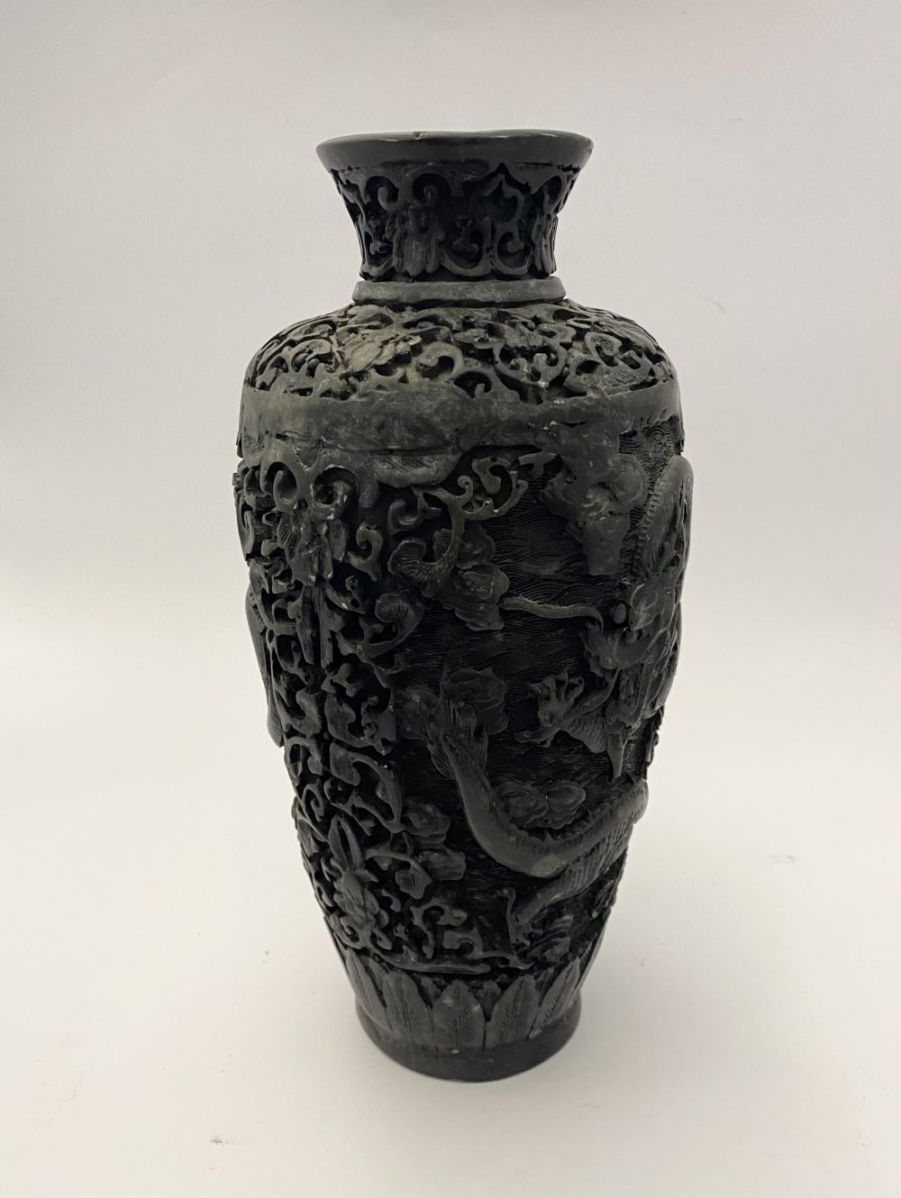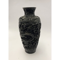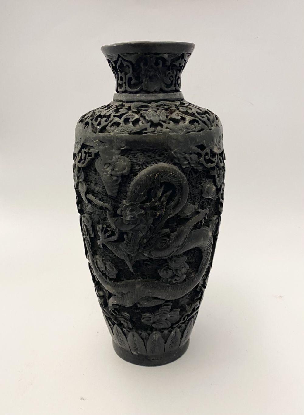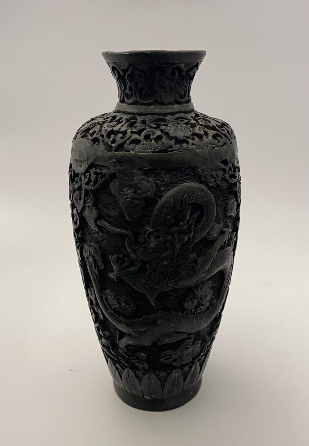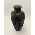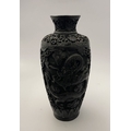 A CHINESE CARVED BLACK CINNABAR LACQUER VASE, the body decorated with incised dragon and smoke motif to front and reverse, surrounded by scrolls, with palmettos to base. Character marks to underside base. Dimensions: 24.5cm high approx.
