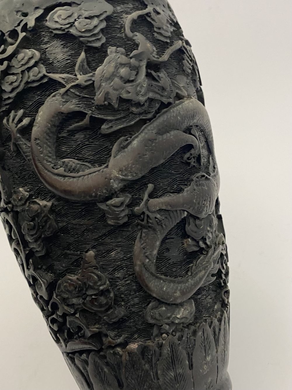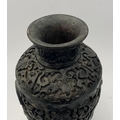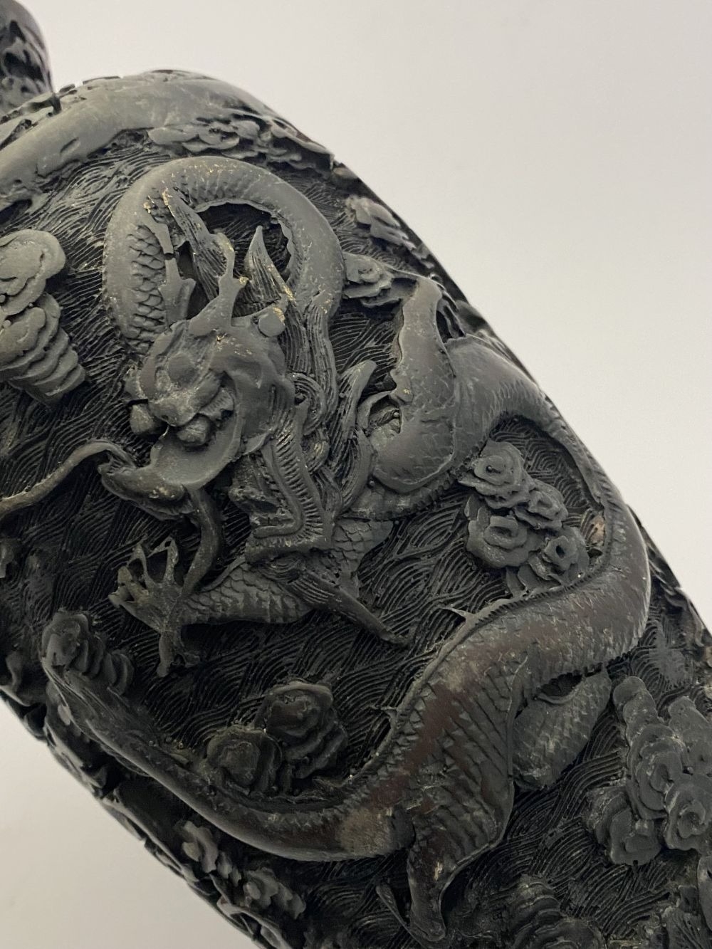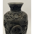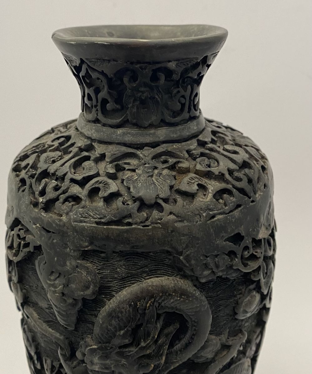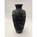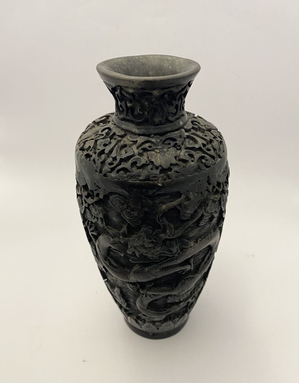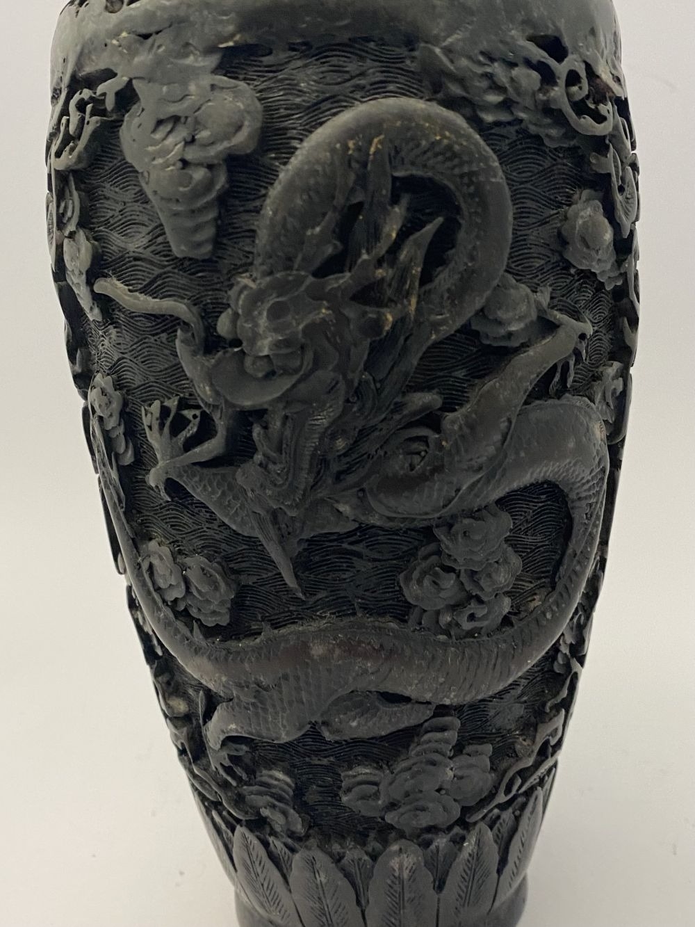 A CHINESE CARVED BLACK CINNABAR LACQUER VASE, the body decorated with incised dragon and smoke motif to front and reverse, surrounded by scrolls, with palmettos to base. Character marks to underside base. Dimensions: 24.5cm high approx.