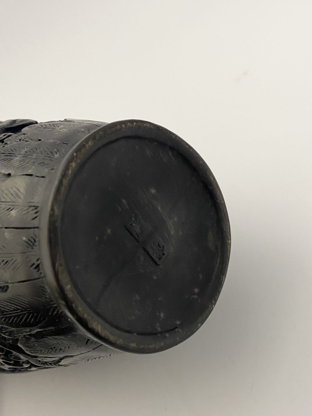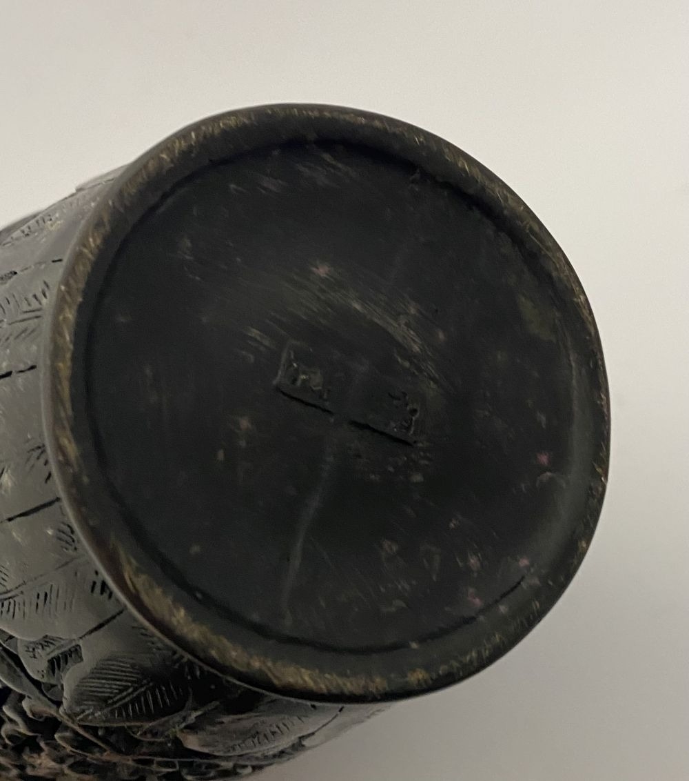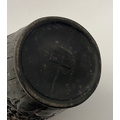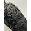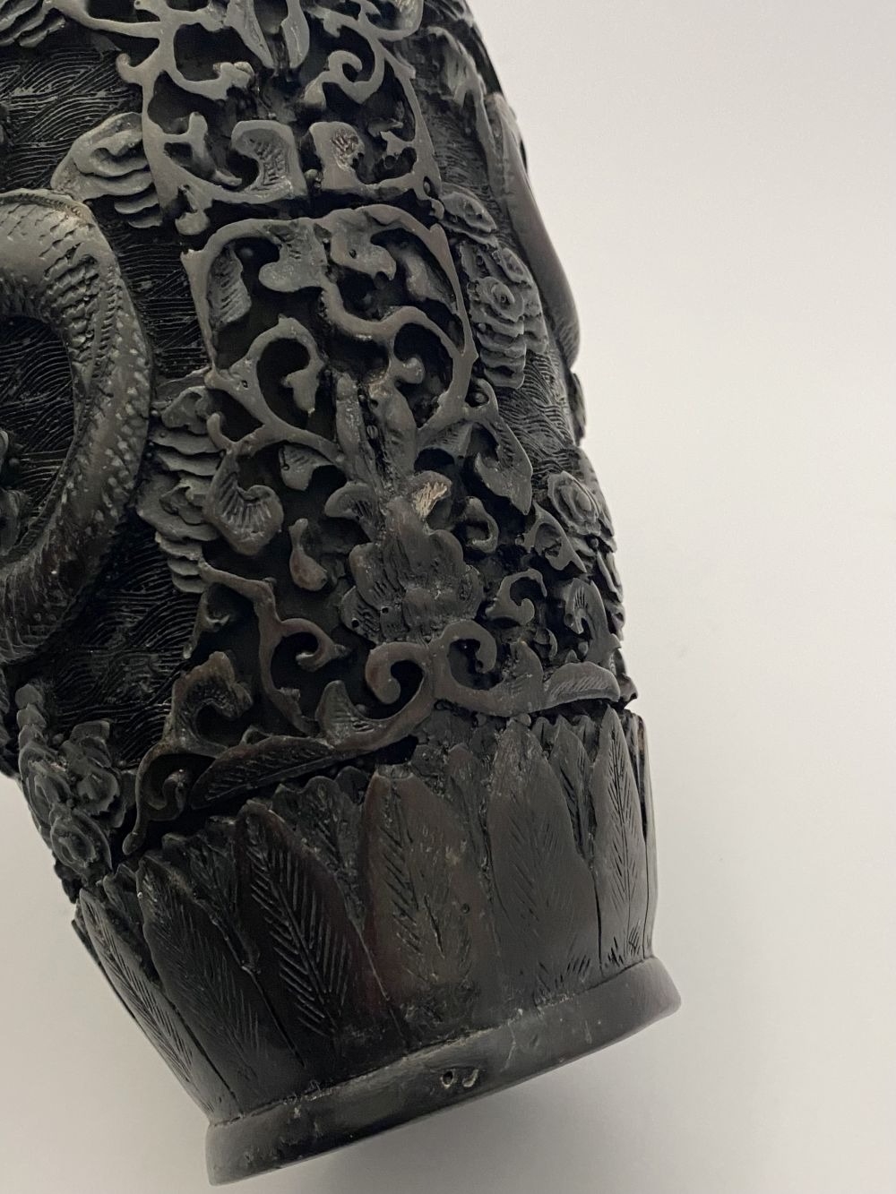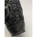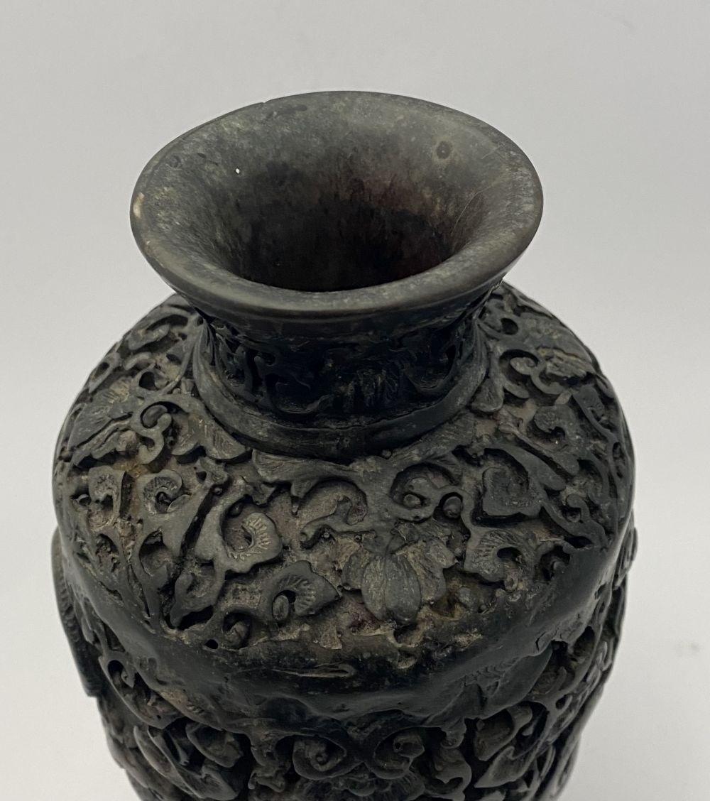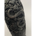 A CHINESE CARVED BLACK CINNABAR LACQUER VASE, the body decorated with incised dragon and smoke motif to front and reverse, surrounded by scrolls, with palmettos to base. Character marks to underside base. Dimensions: 24.5cm high approx.