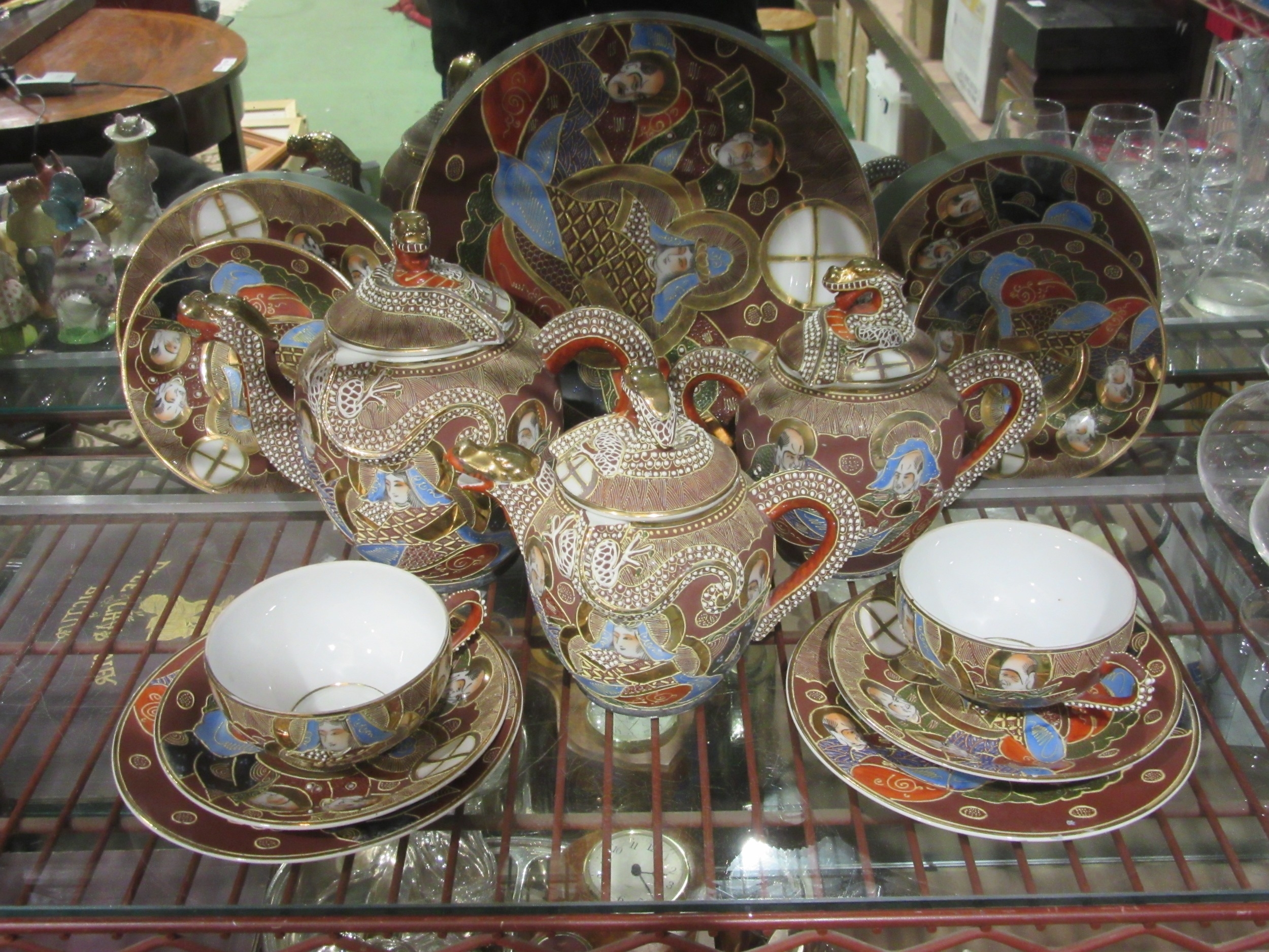 A part Japanese tea-set with Geisha girl to interior base, large plate, trios two teapots and a covered sugar pot