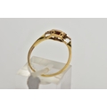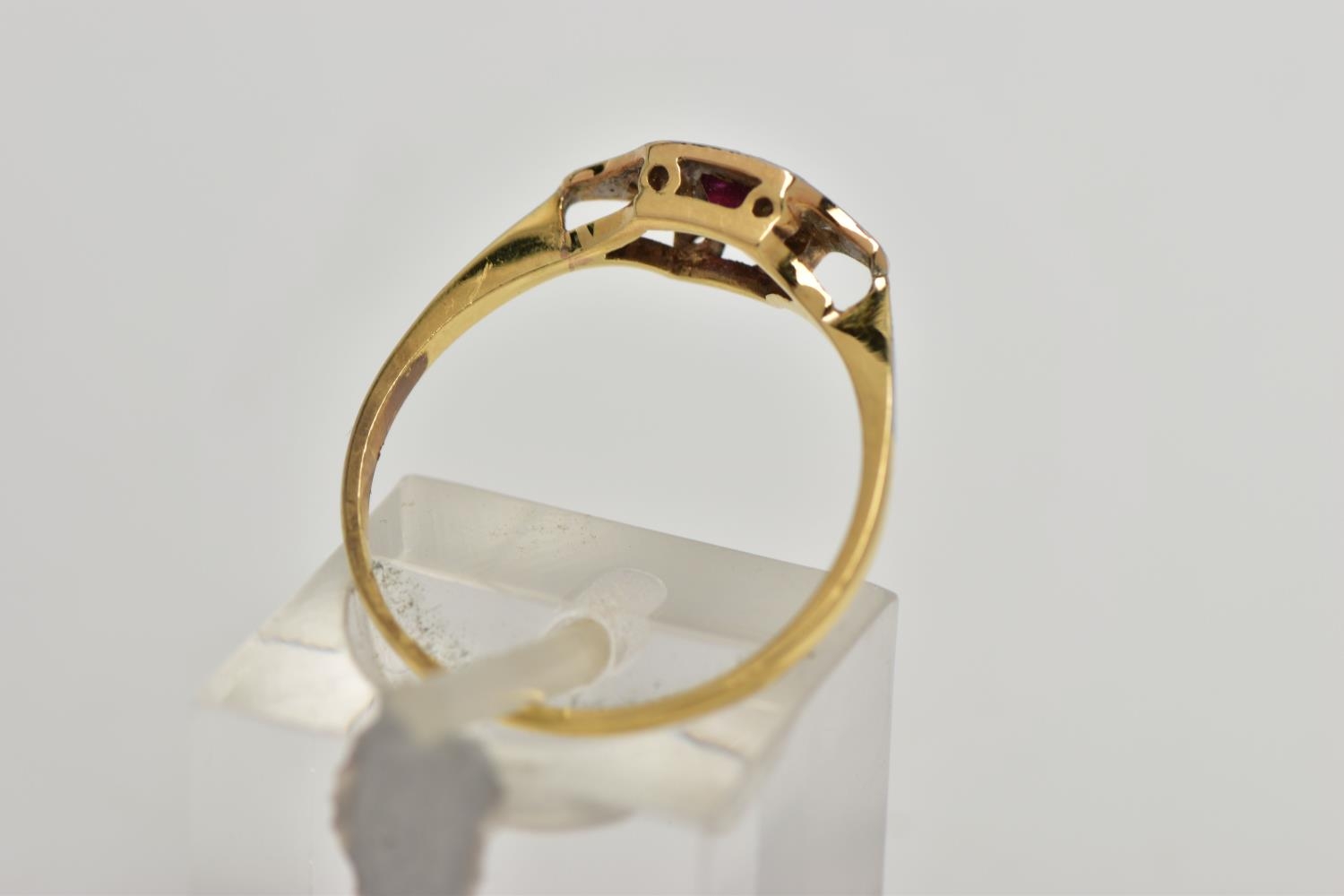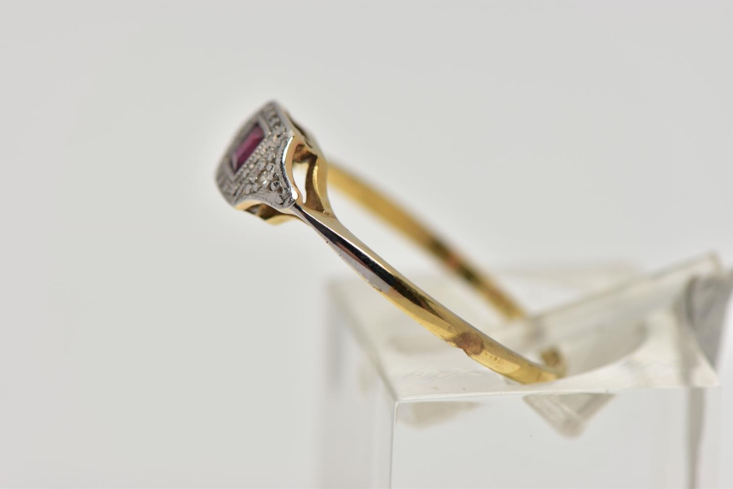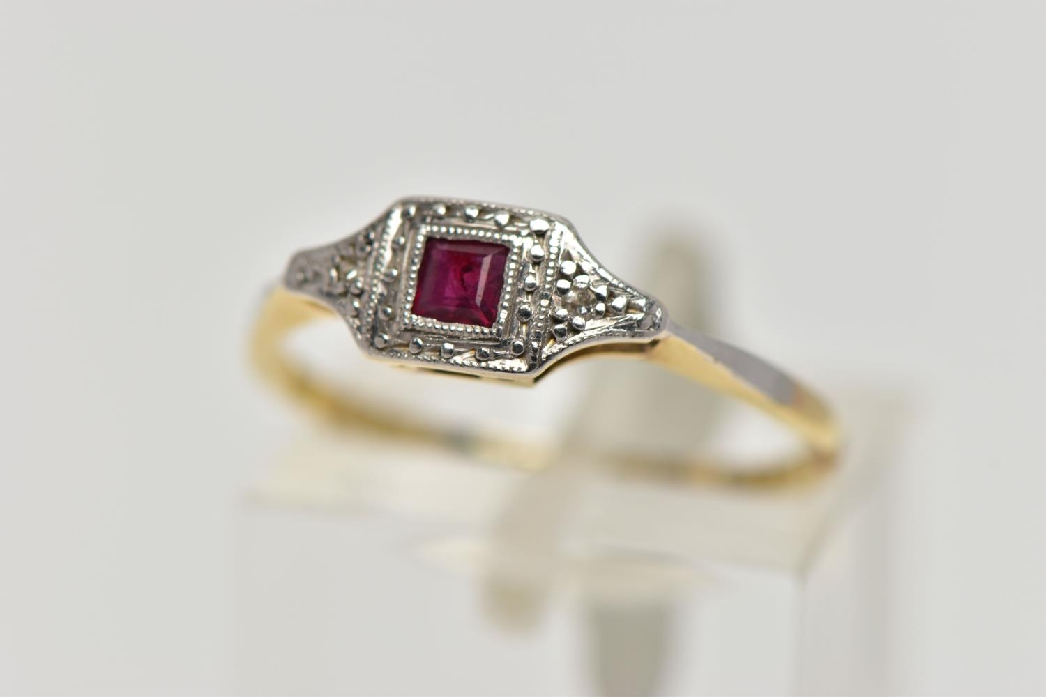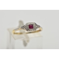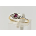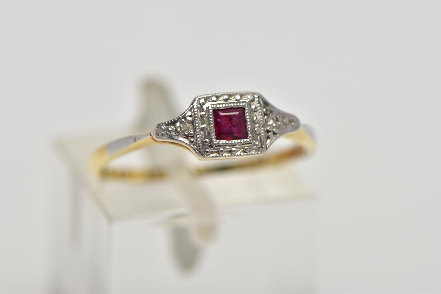 A YELLOW METAL RUBY AND DIAMOND RING, art deco style ring set with a square cut ruby, flanked with single cut diamond detail in a white metal mount, pinched shoulders leading onto a polished yellow metal band, stamped 18ct & Pt, ring size N, approximate gross weight 1.7 grams (condition report: general light wear, stones intact)