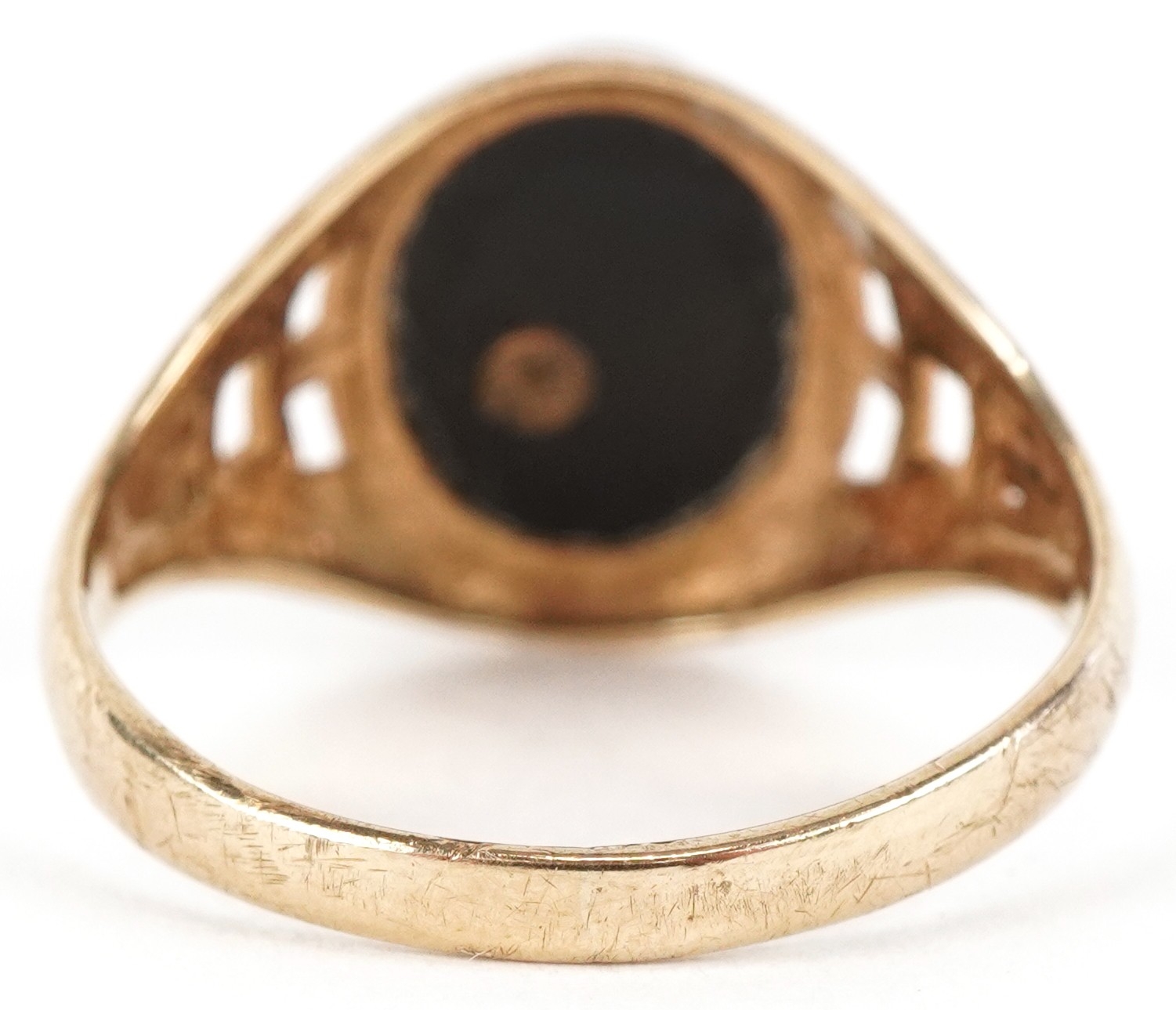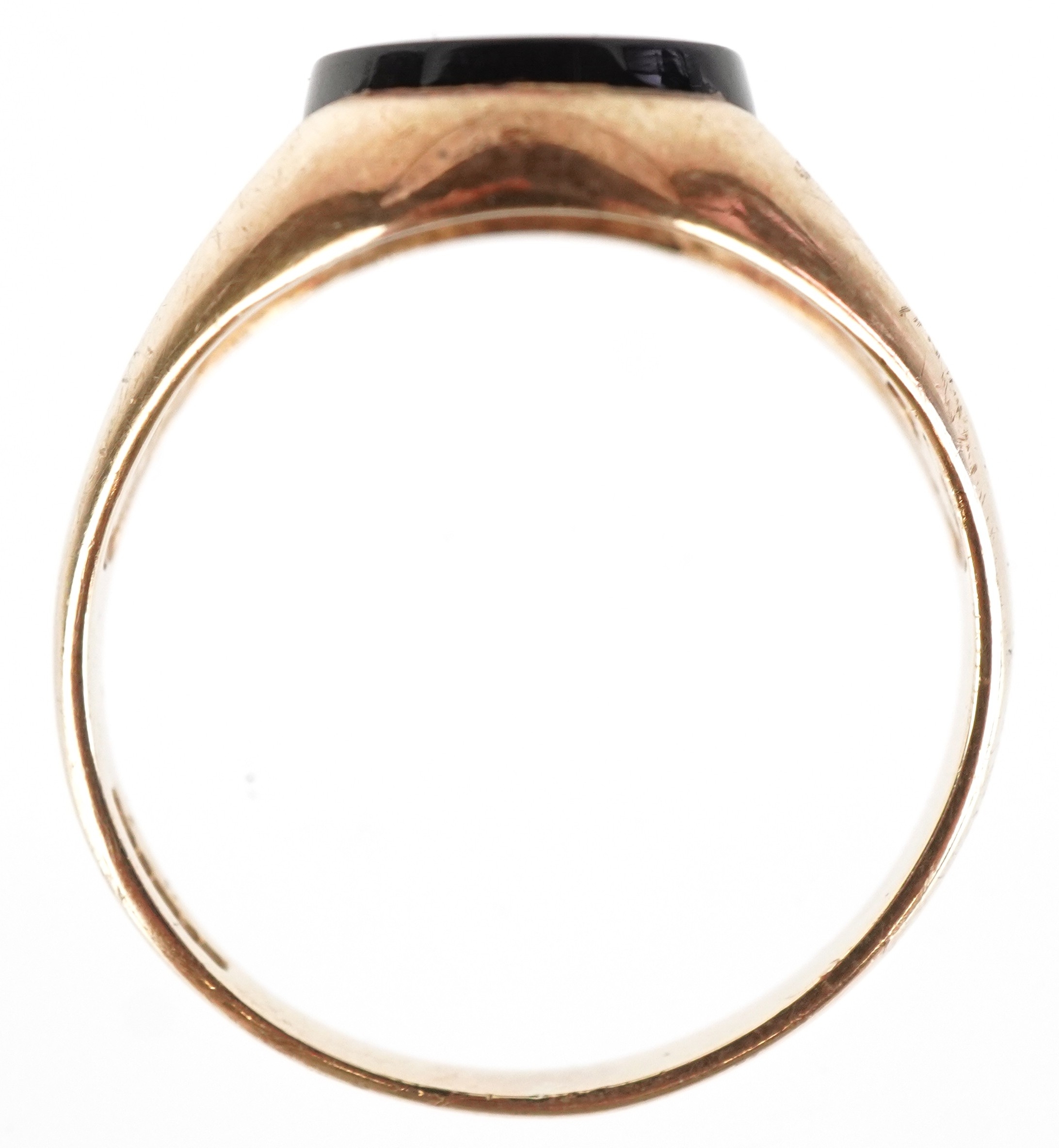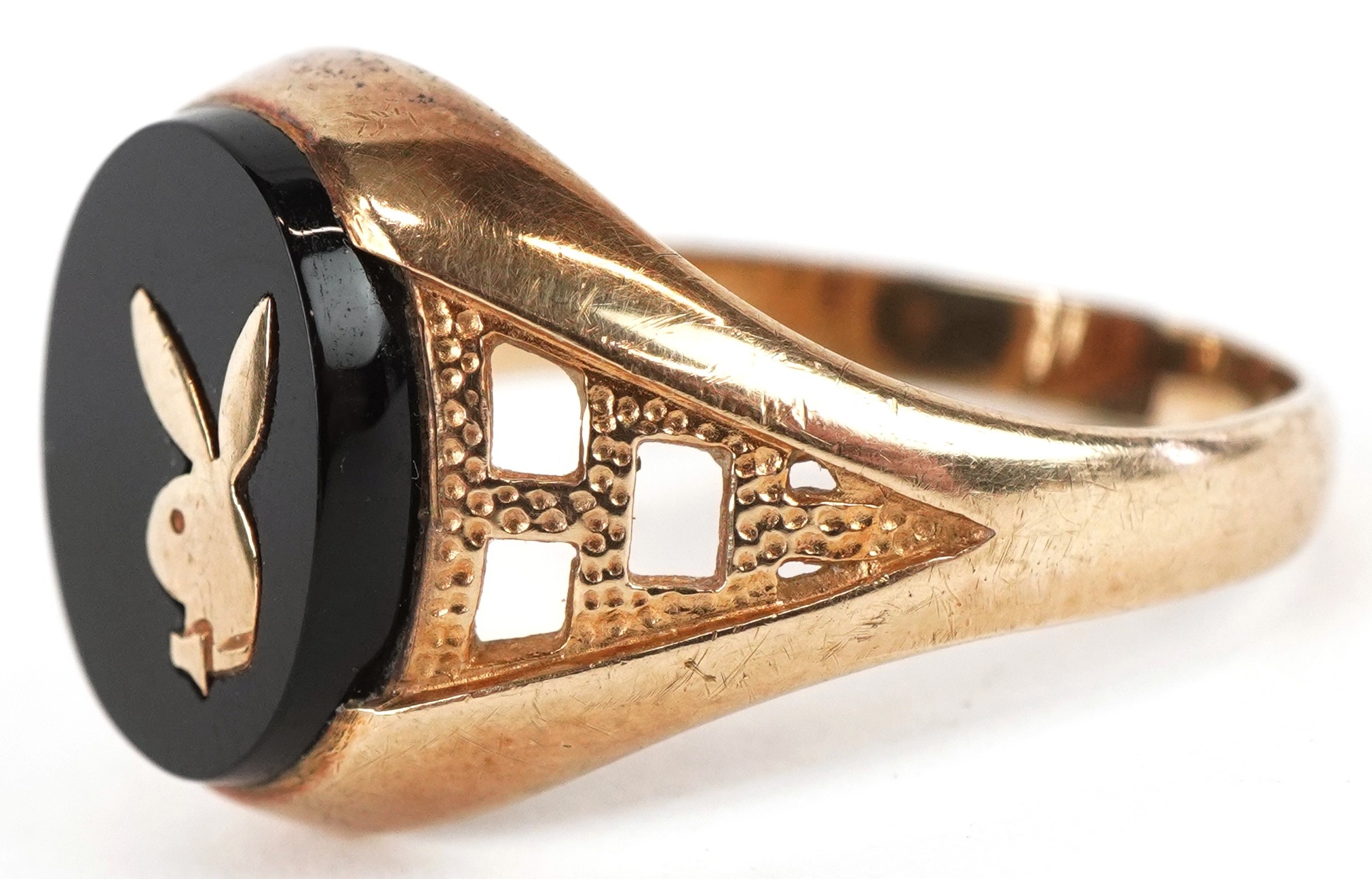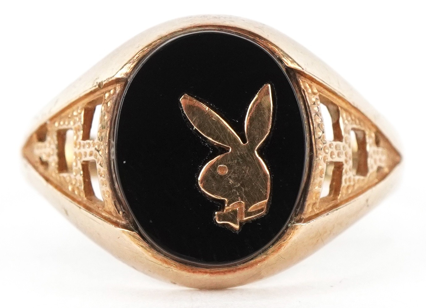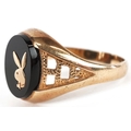 A 9ct gold onyx Playboy Bunny signet ring, size R/S, 3.2g.