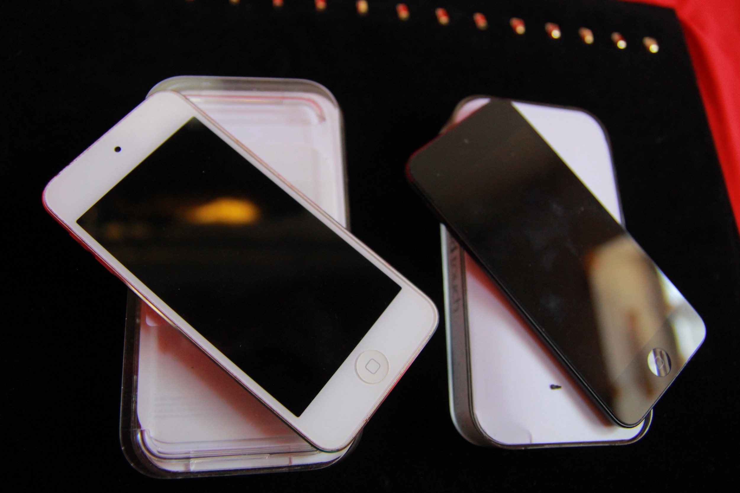 A pair of iPod Touch 128Gb model A1574s, one grey, the other white, both in original packaging with matching serial numbers, both with unused earphones. In working order (vendor wiped data, battery life not tested)