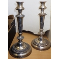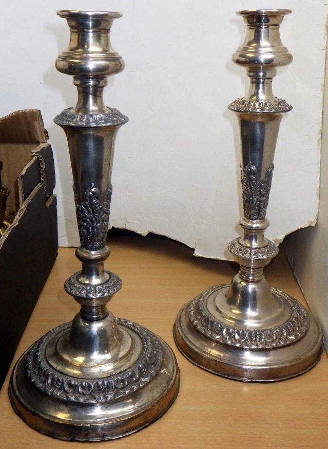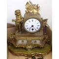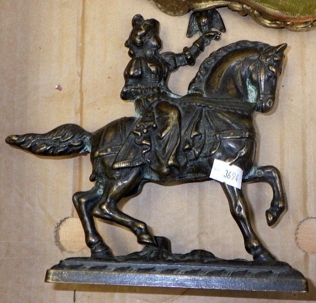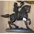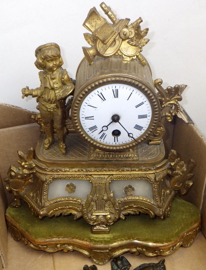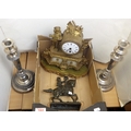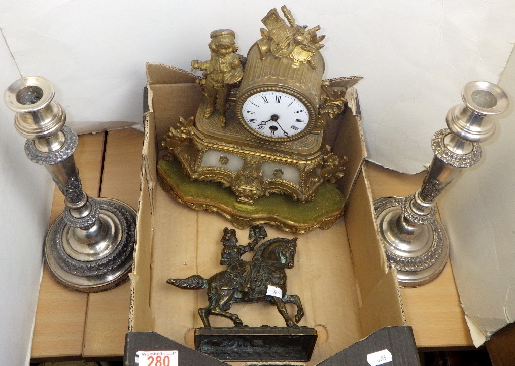 A pair of silver plated candlesticks, figural clock and a cast figure of a falconer on horseback AF