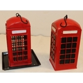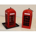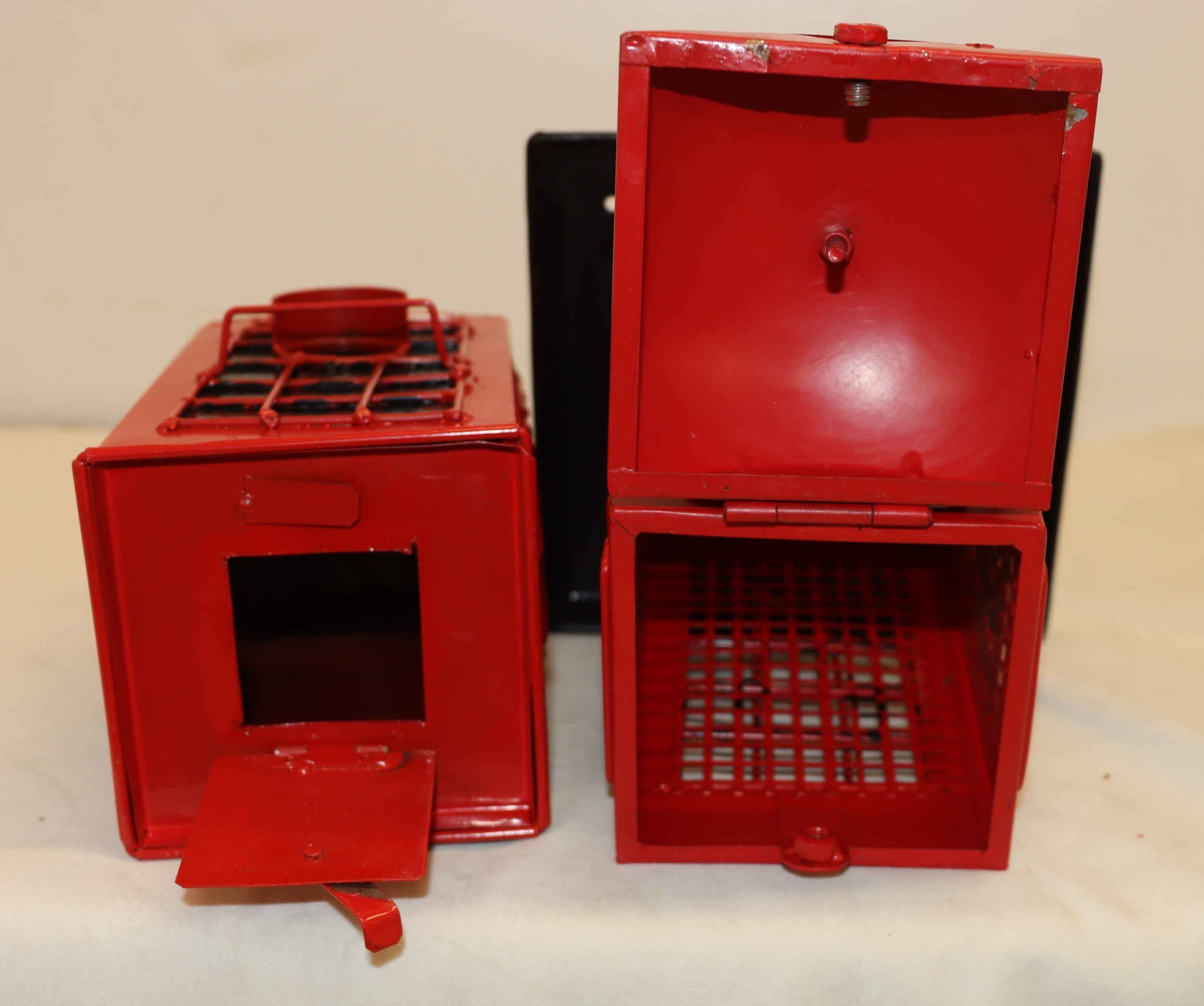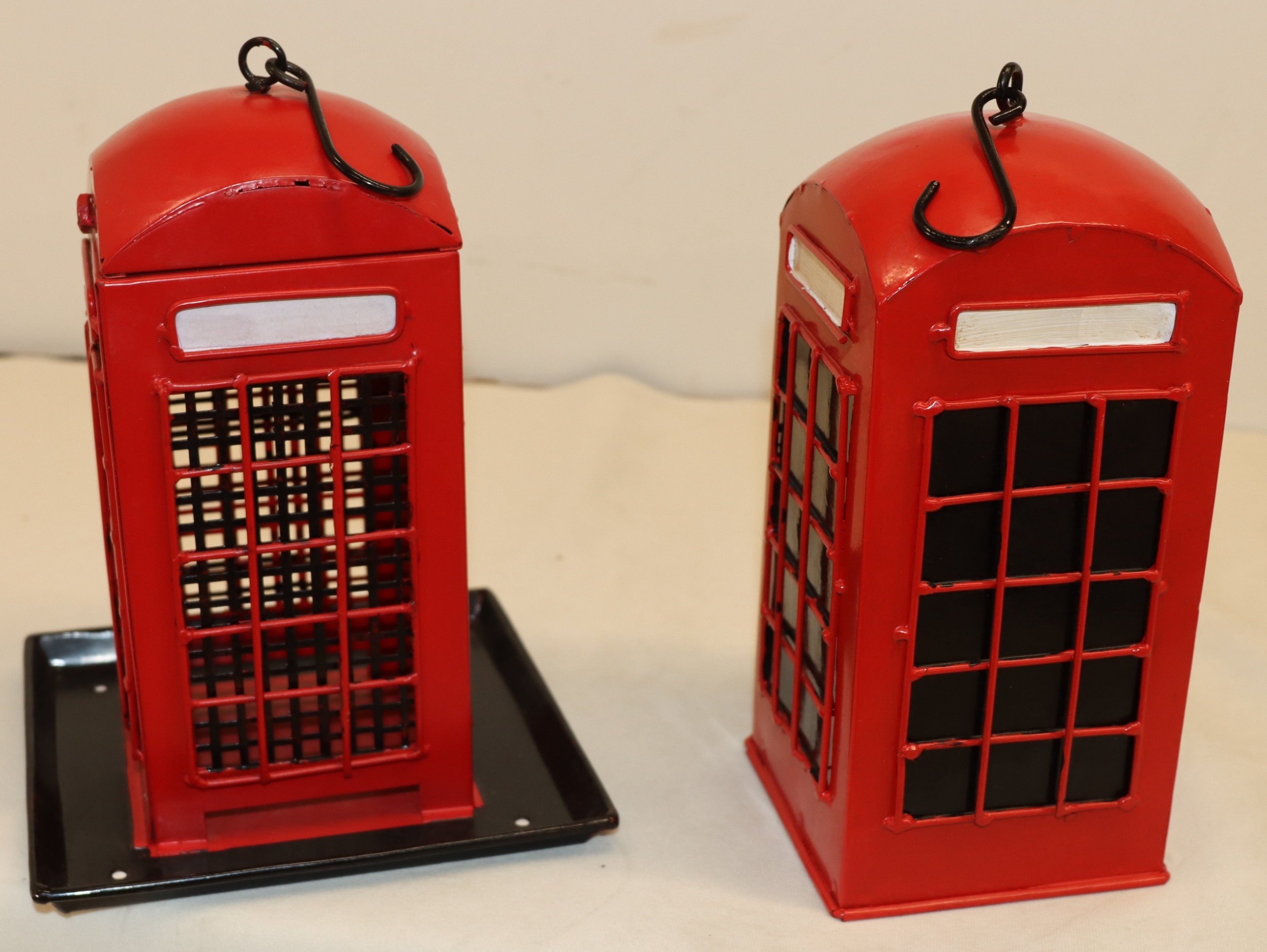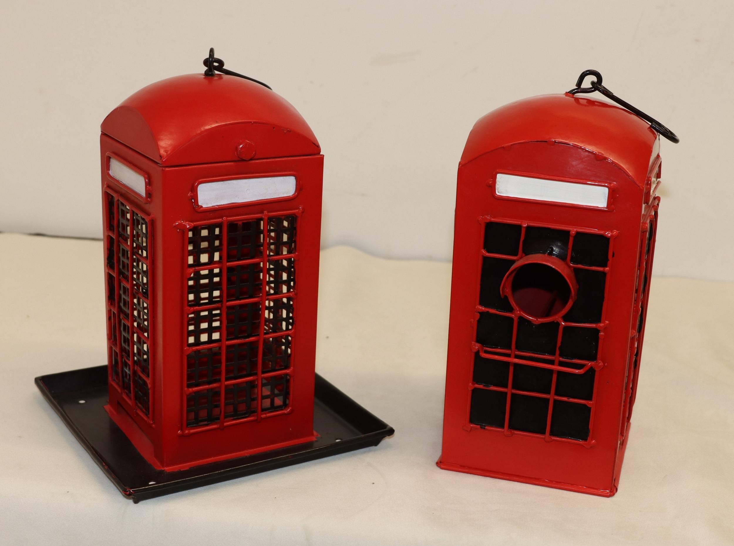 A red letterbox bird nesting box, 26cm high and a similar bird feeder 26cm high.