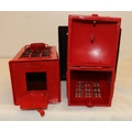 A red letterbox bird nesting box, 26cm high and a similar bi...