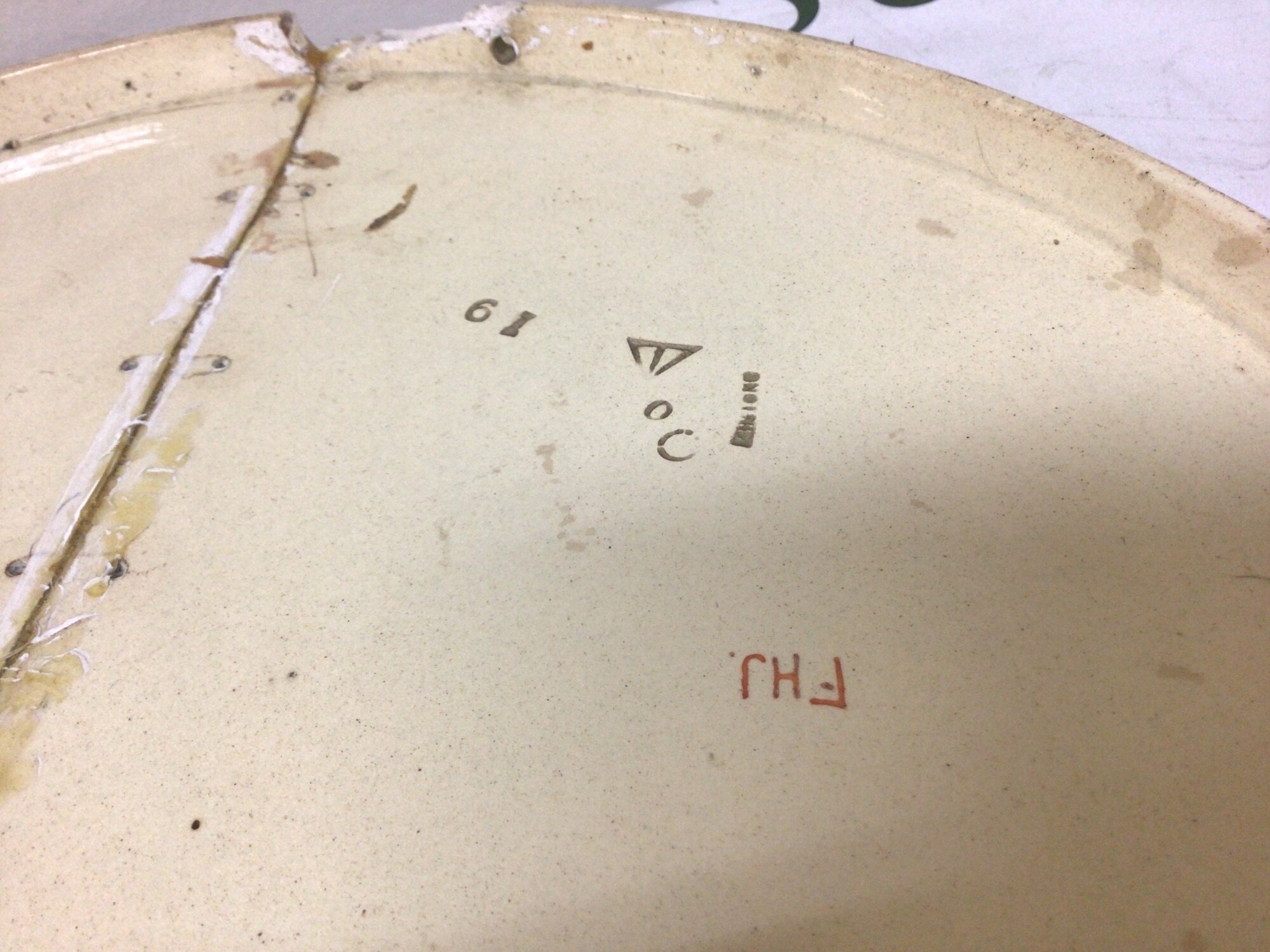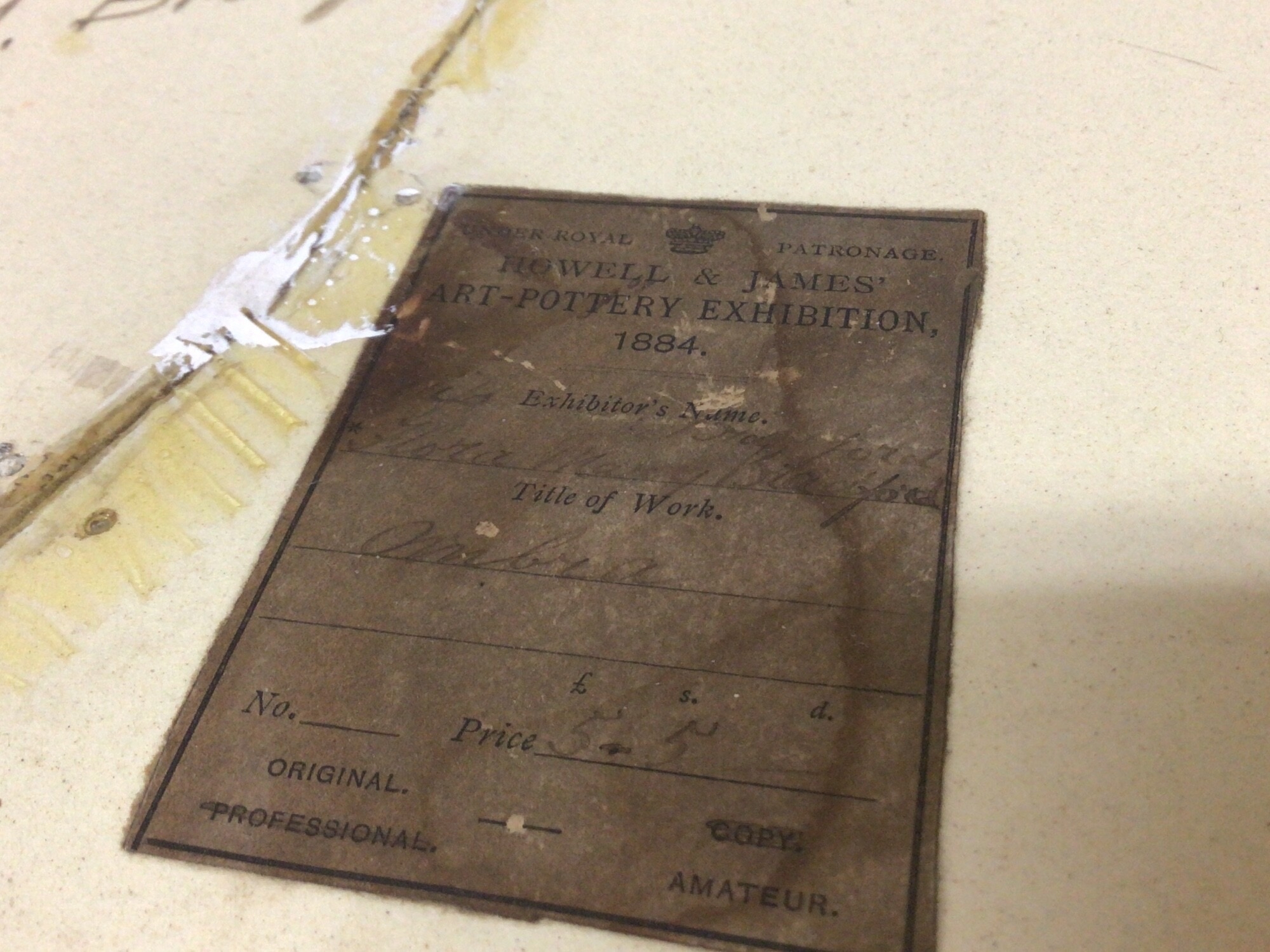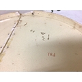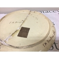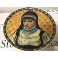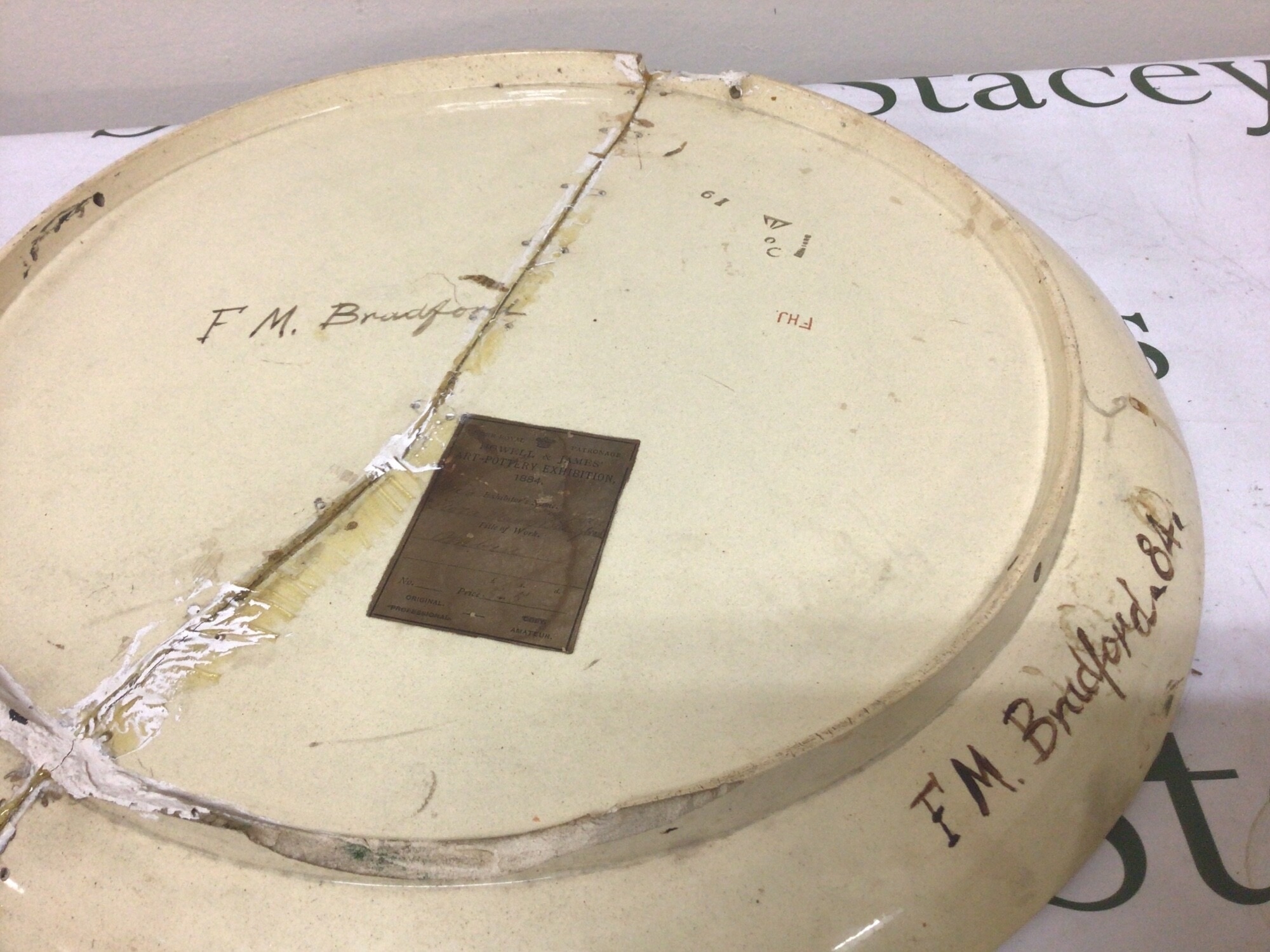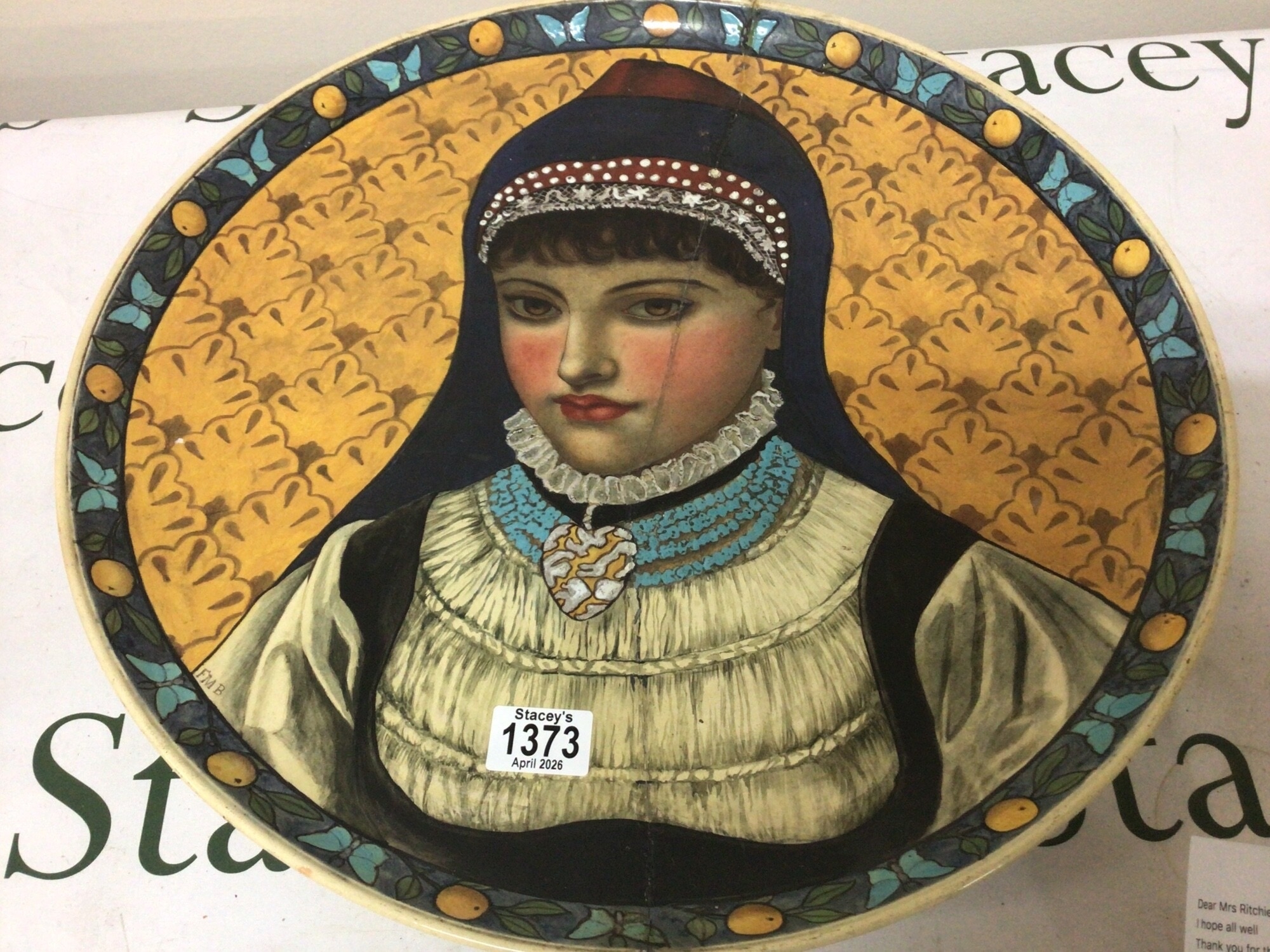 A 19th century hand painted large ceramic wall plaque portrait of a young girl in traditional dress the reverse with signature and impressed marks and Exhibition labels. (damaged) diameter 48cm