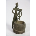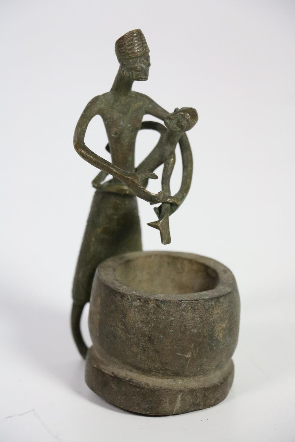 A late 18th Century / early 19th Century African bronze Figure, of a mother and child (possibly Ethiopian), with engraved design, the mother with child in arms, with wooden bowl attached, approx. 12 cms (5") high. (1)
