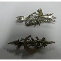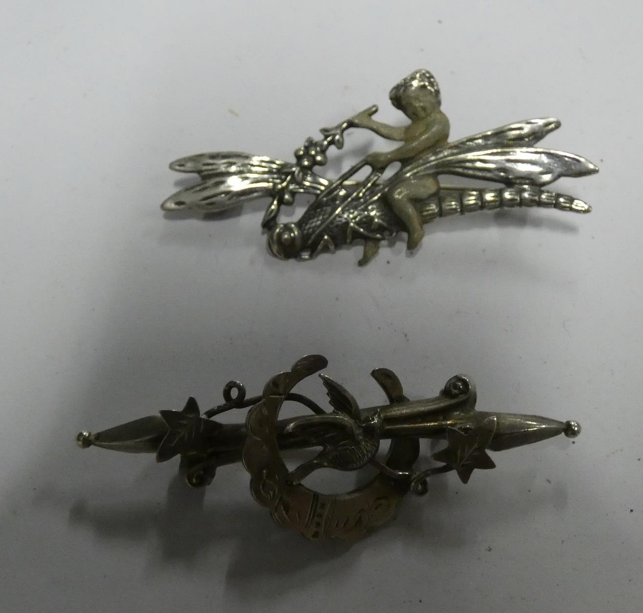 Two silver sweetheart brooches.