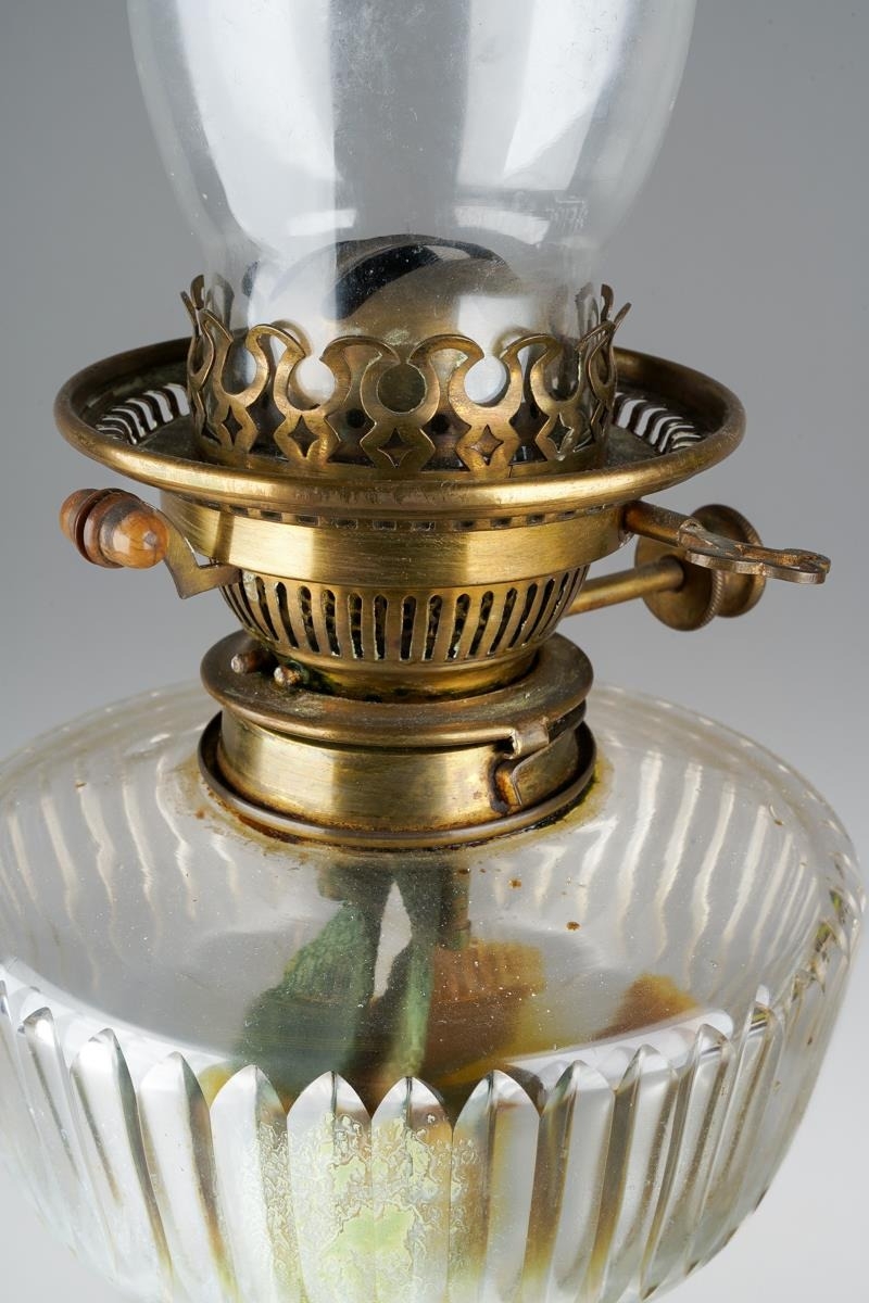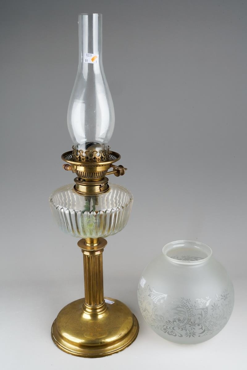 Dents to brass base, split to stepped section at base of column, reservoir in good condition but interior is stained