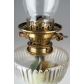 A late 19th Century Benson & Co Hinks Patent oil lamp with glass funnel, reservoir and shade on a brass column base, height excluding chimney and shade approx 41cm [1]