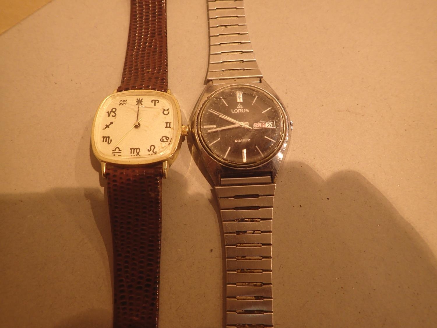 Lorus quartz gents steel cased wristwatch with day/date aperture and a ladies watch with hieroglyphic dial. Neither working. P&P Group 1 (£14+VAT for the first lot and £1+VAT for subsequent lots)
