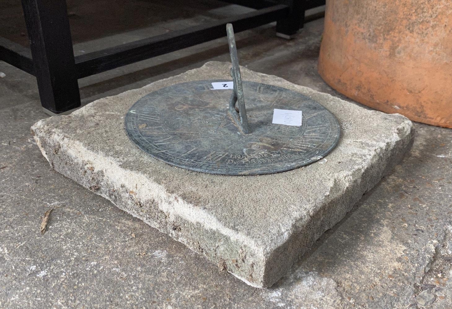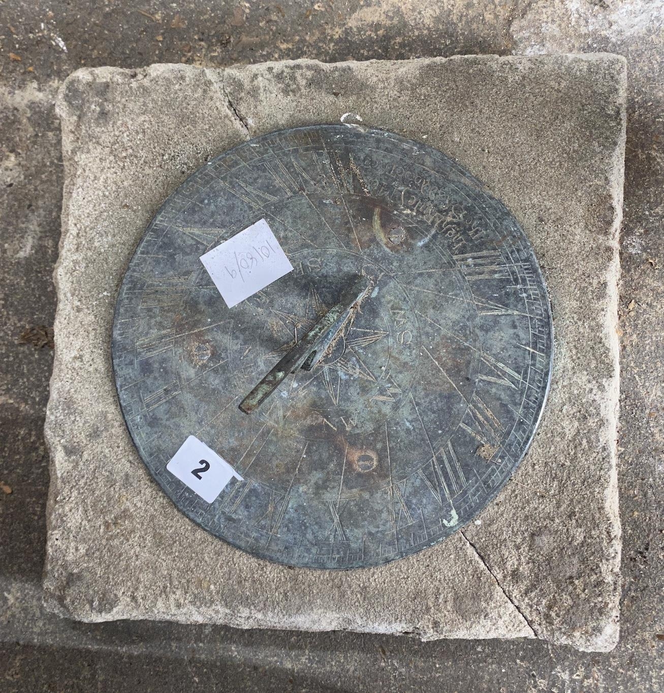 A circular metal and reconstituted stone sun dial, width 30cm