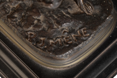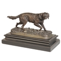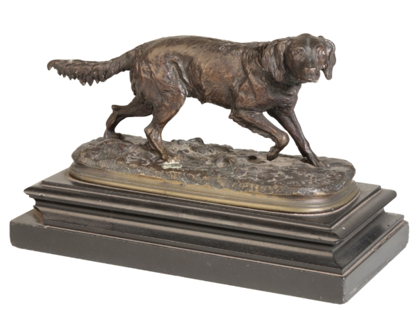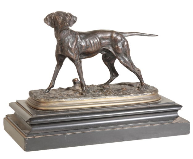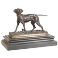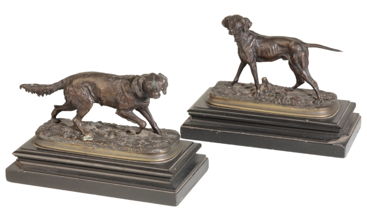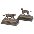 AFTER PIERRE-JULES MENE, (1810 - 1879), A PAIR OF PATINATED BRONZE MODELS OF A SETTER AND A POINTER,, circa 1880, both inscribed in the maquette to the naturally cast bases 'P.J. MENE', on rectangular marmo nero Belgio socles; the former 15cm high, the latter 18cm high overall