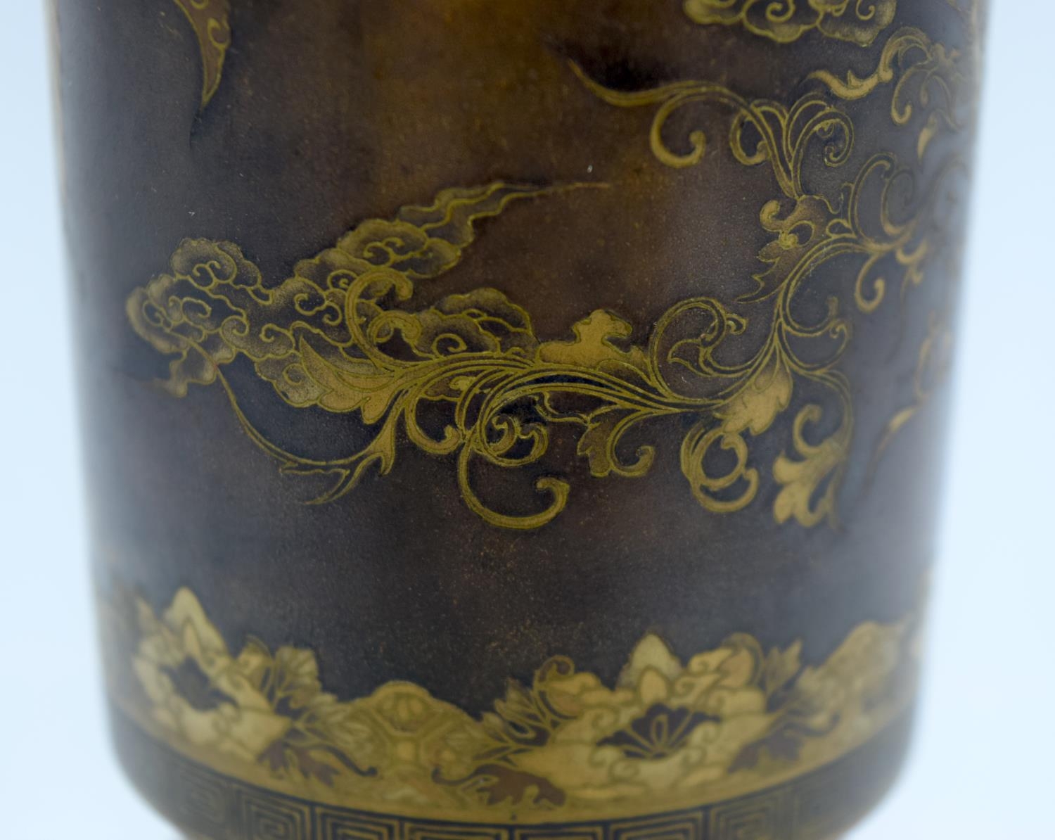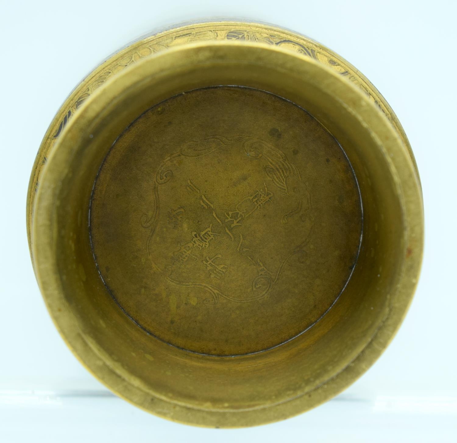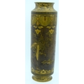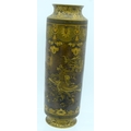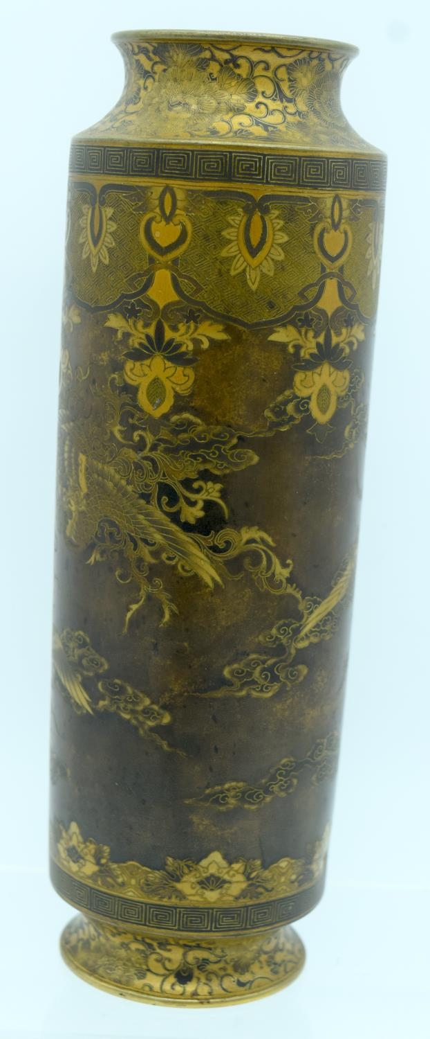 A VERY RARE 19TH CENTURY JAPANESE MEIJI PERIOD CYLINDRICAL BRONZE VASE by Takeuchi Sei (Takeuchi Chibei) with patent number, wonderfully decorated with birds in flight, under a banding of foliage and motifs. 22 cm high. Note: See a very rare porcelain vase by Chibei sold Christies New York, 18th of April 2018, Lot 92.