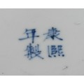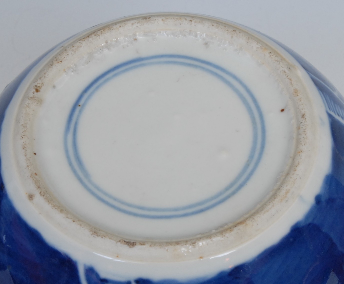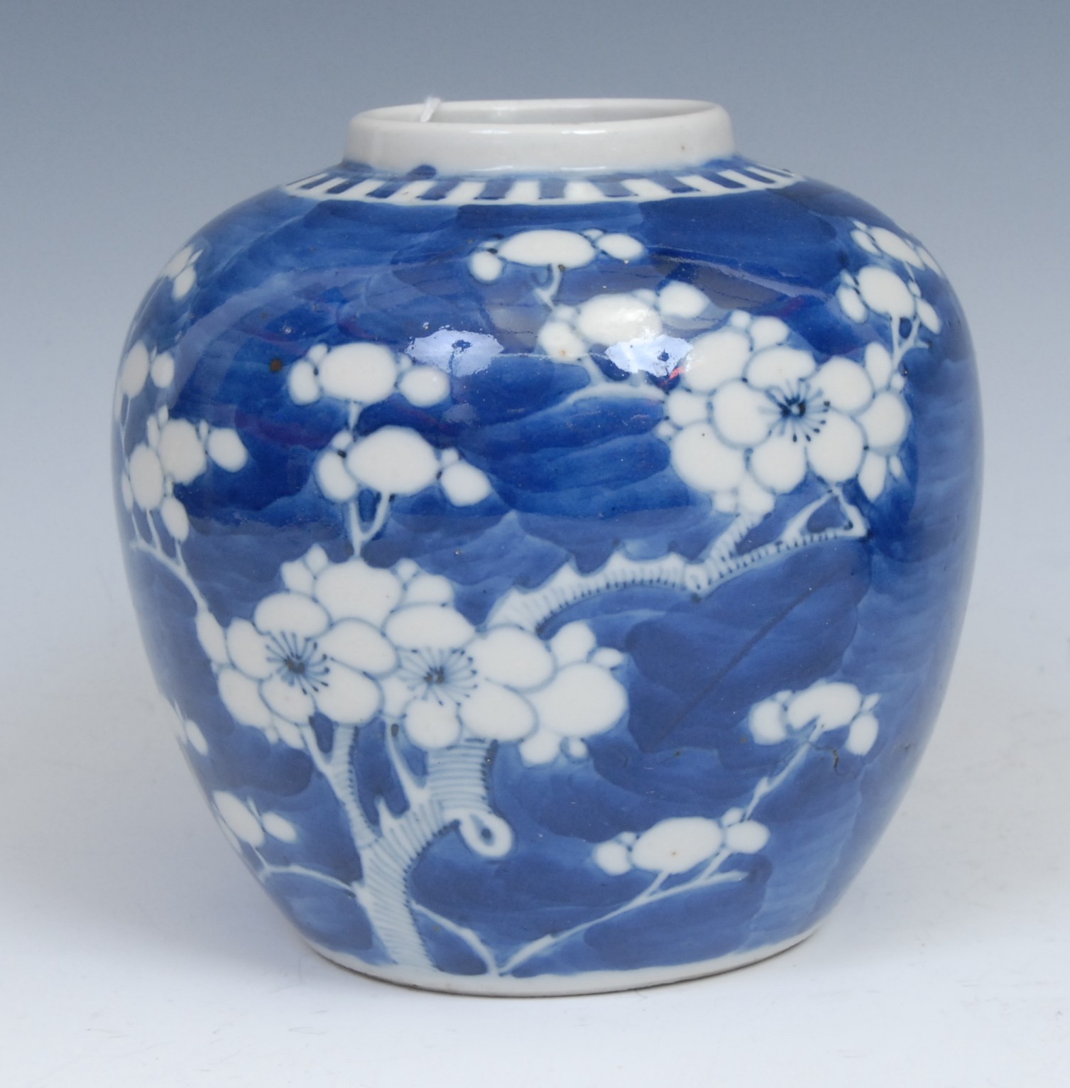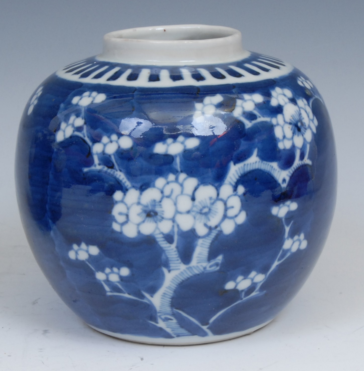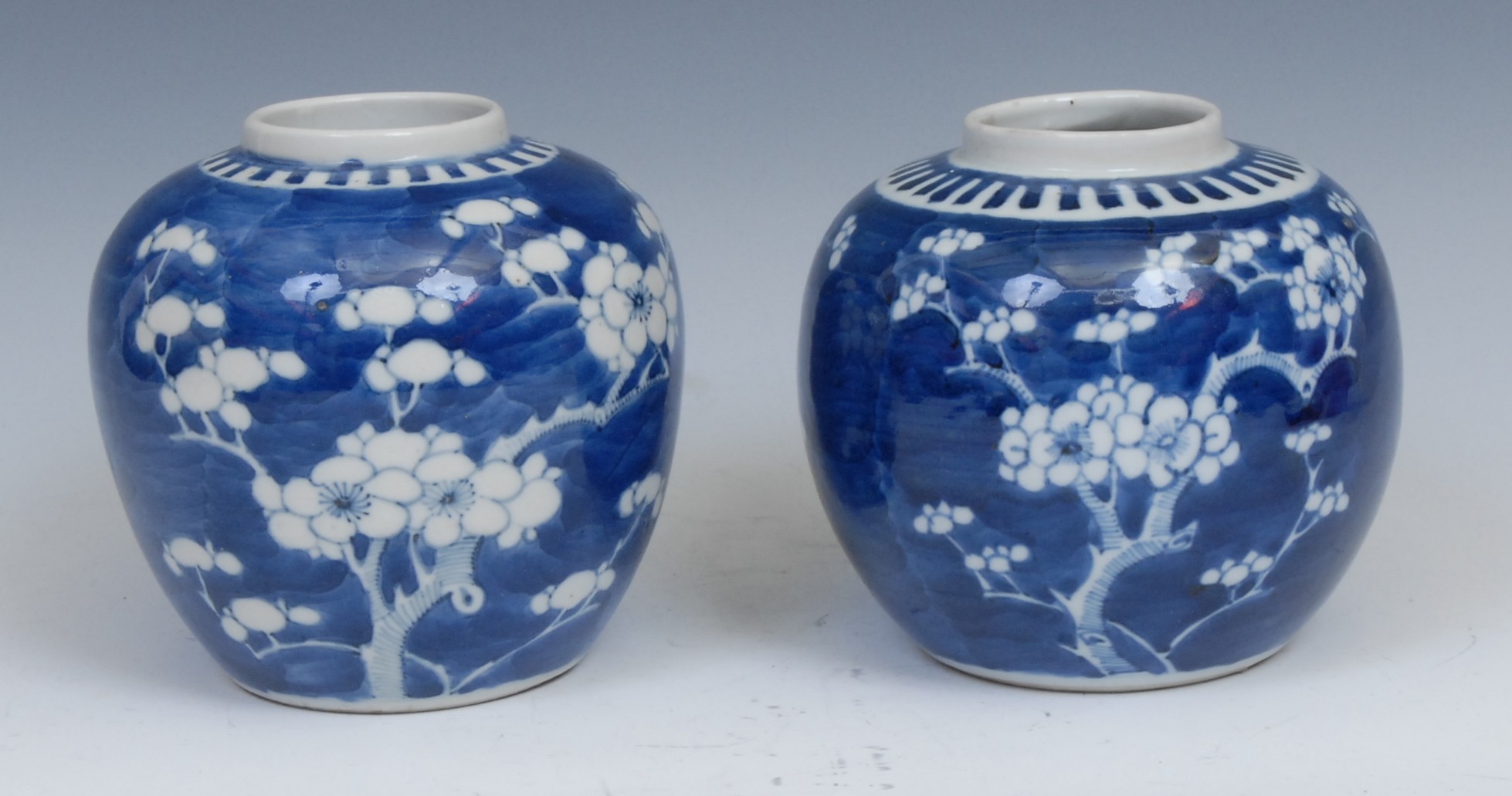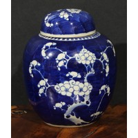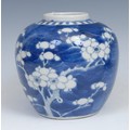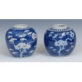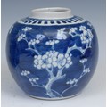 A Chinese ovoid ginger jar, painted in tones of underglaze blue with blossoming prunus on a ground of cracked ice, 13cm high, four character mark, 19th century; another, similar, double circle mark (2)