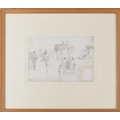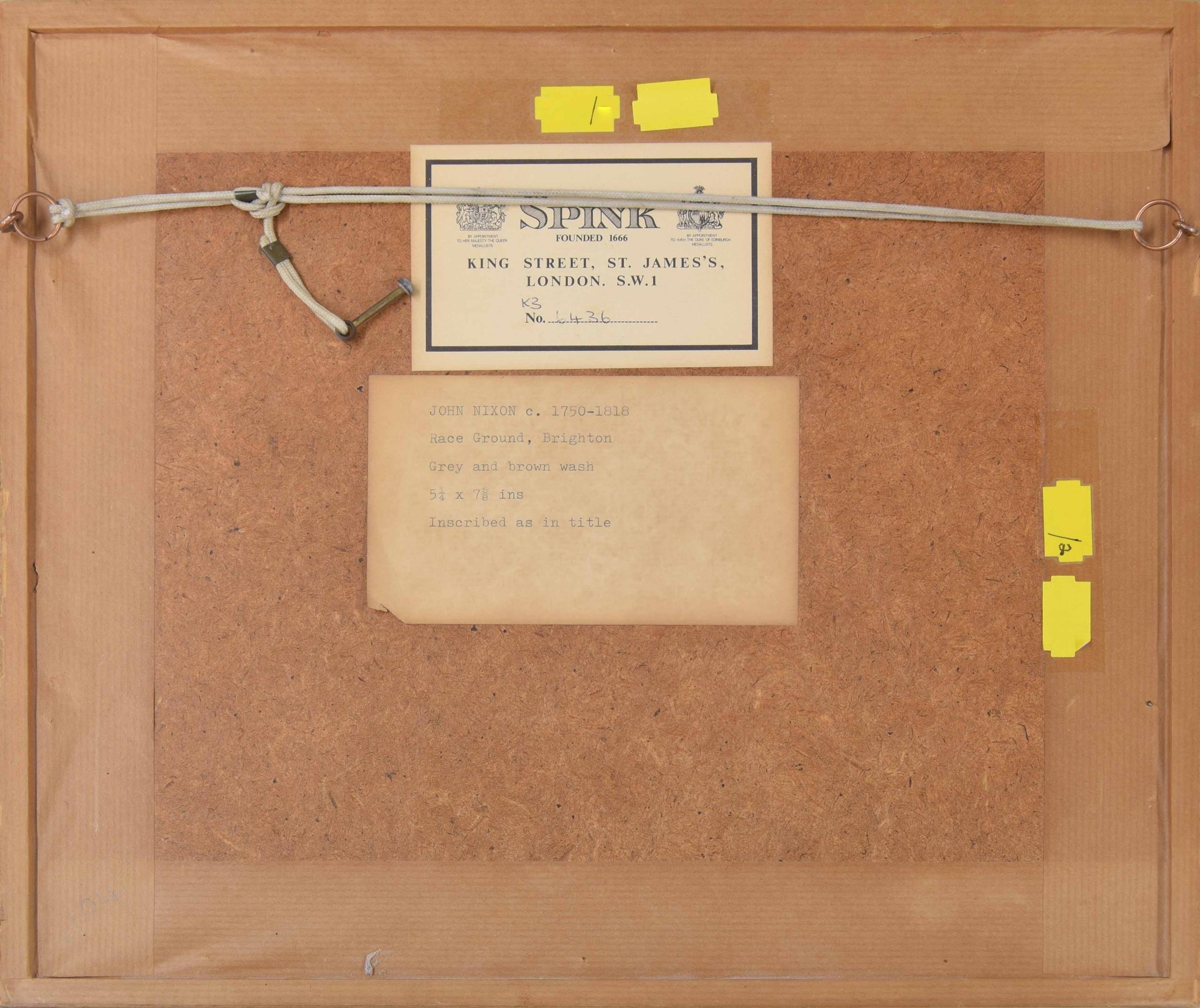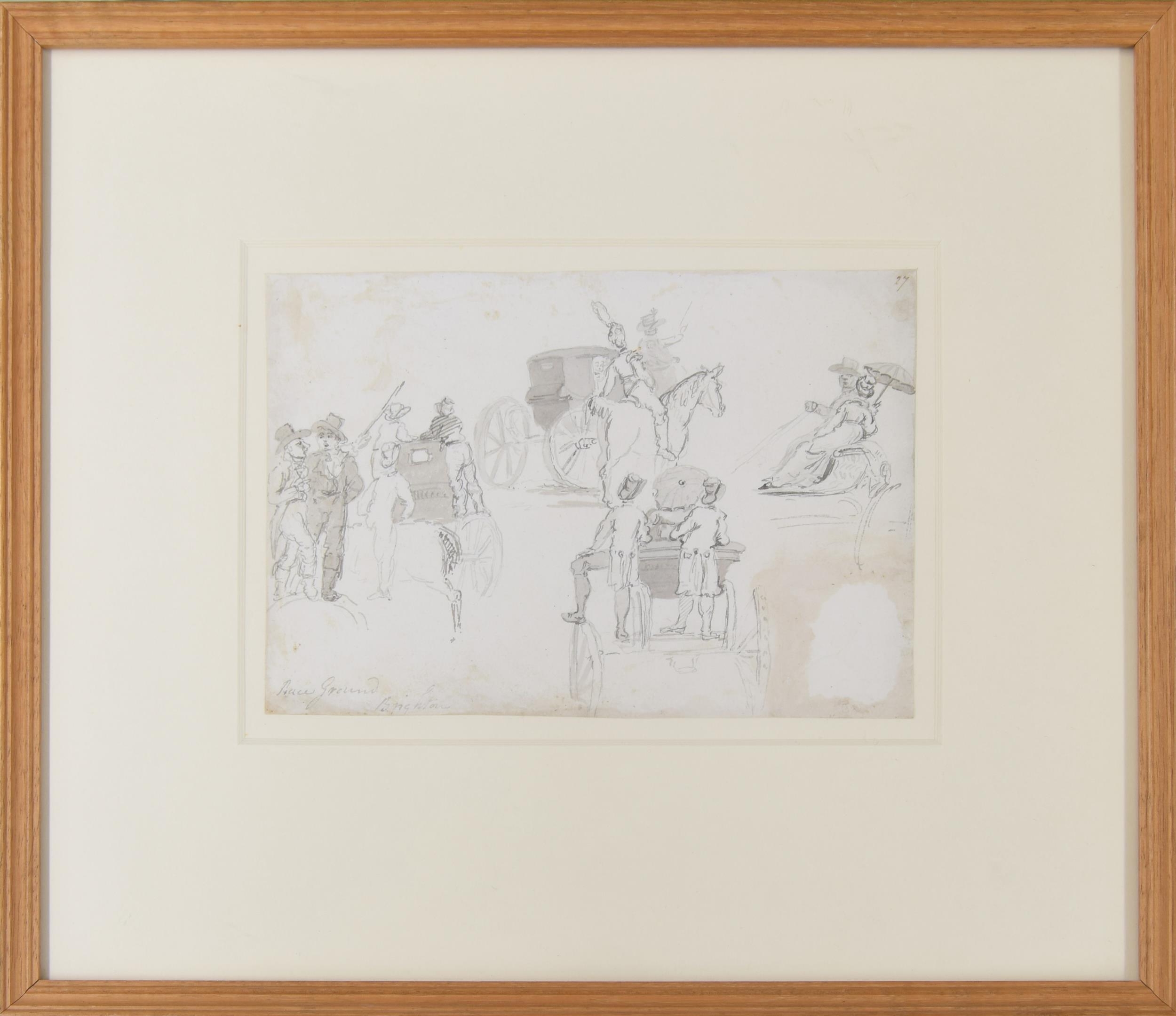 John Nixon (1759-1818) - "Race Ground, Brighton" series of sketches on one sheet, depicting figures, horses and carriages, described and numbered 27 also inscribed on an exhibition label verso, pencil, grey and brown wash, 5..25" x 7.5"