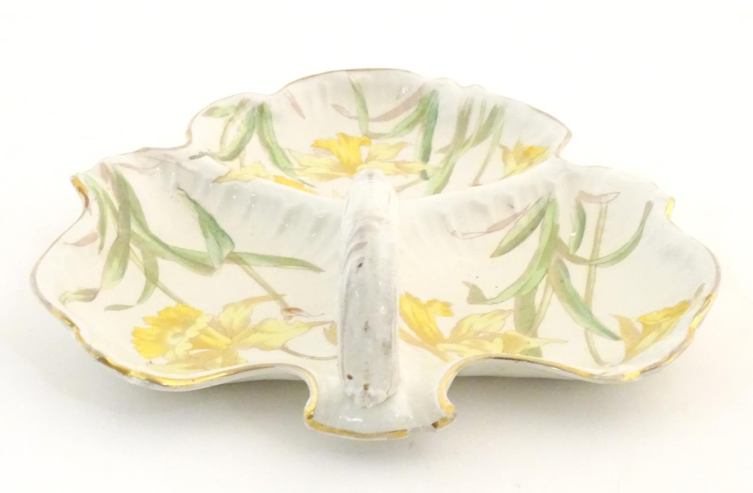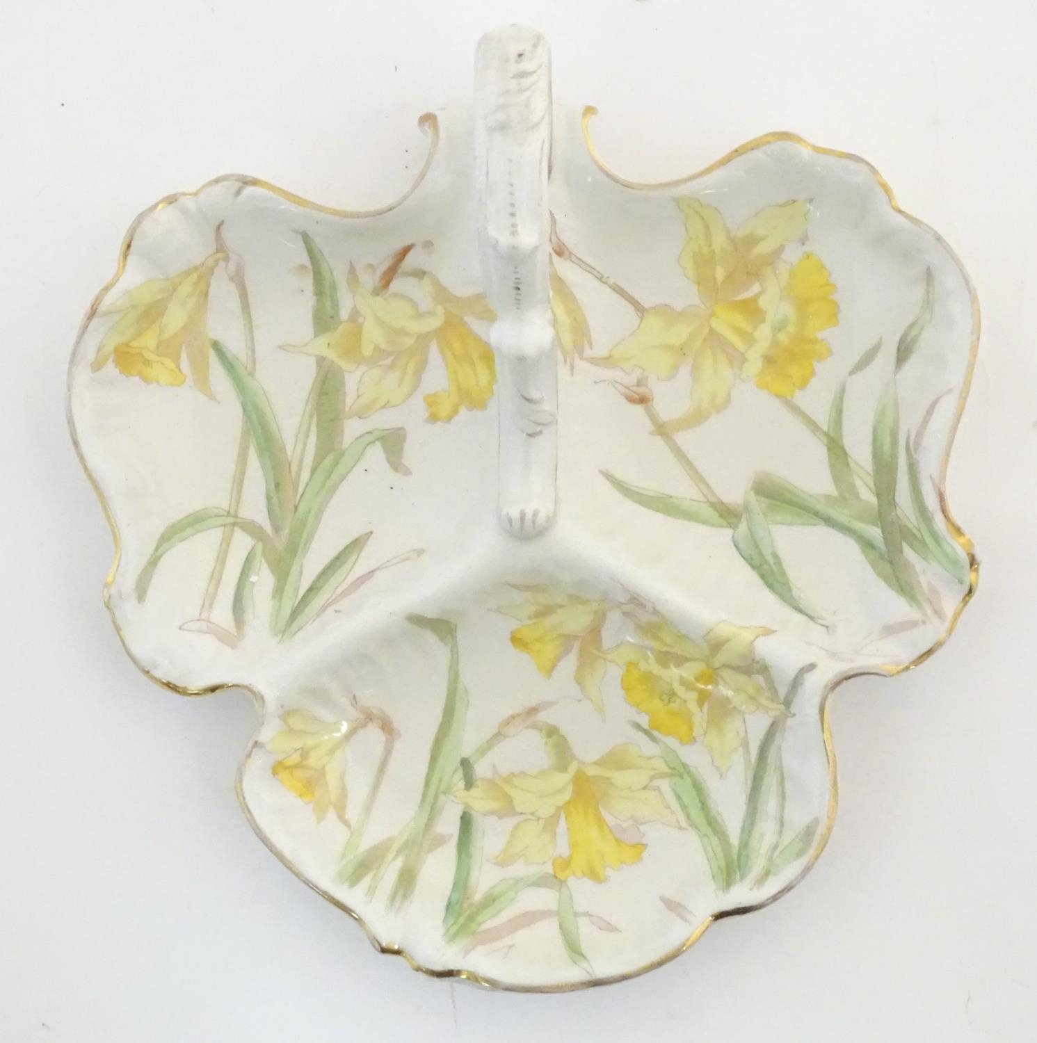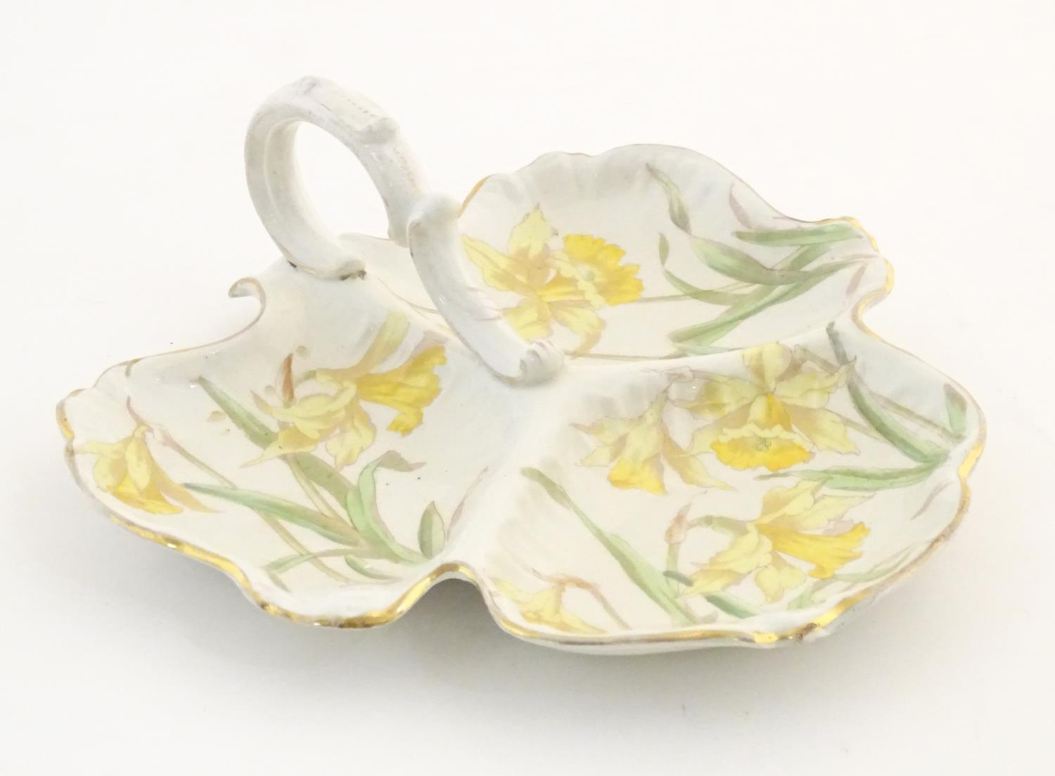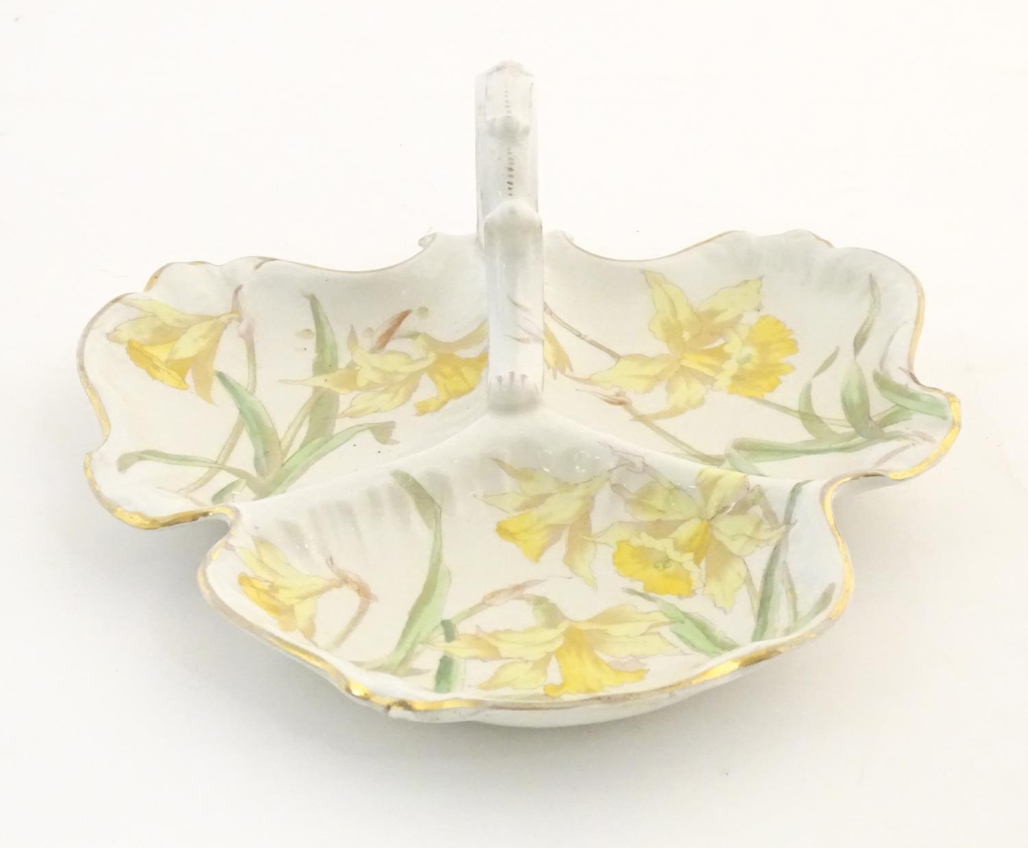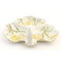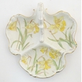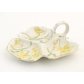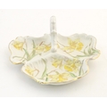 A three sectional leaf shaped plate with central handle and daffodil detail. Marked under. Approx. 11"