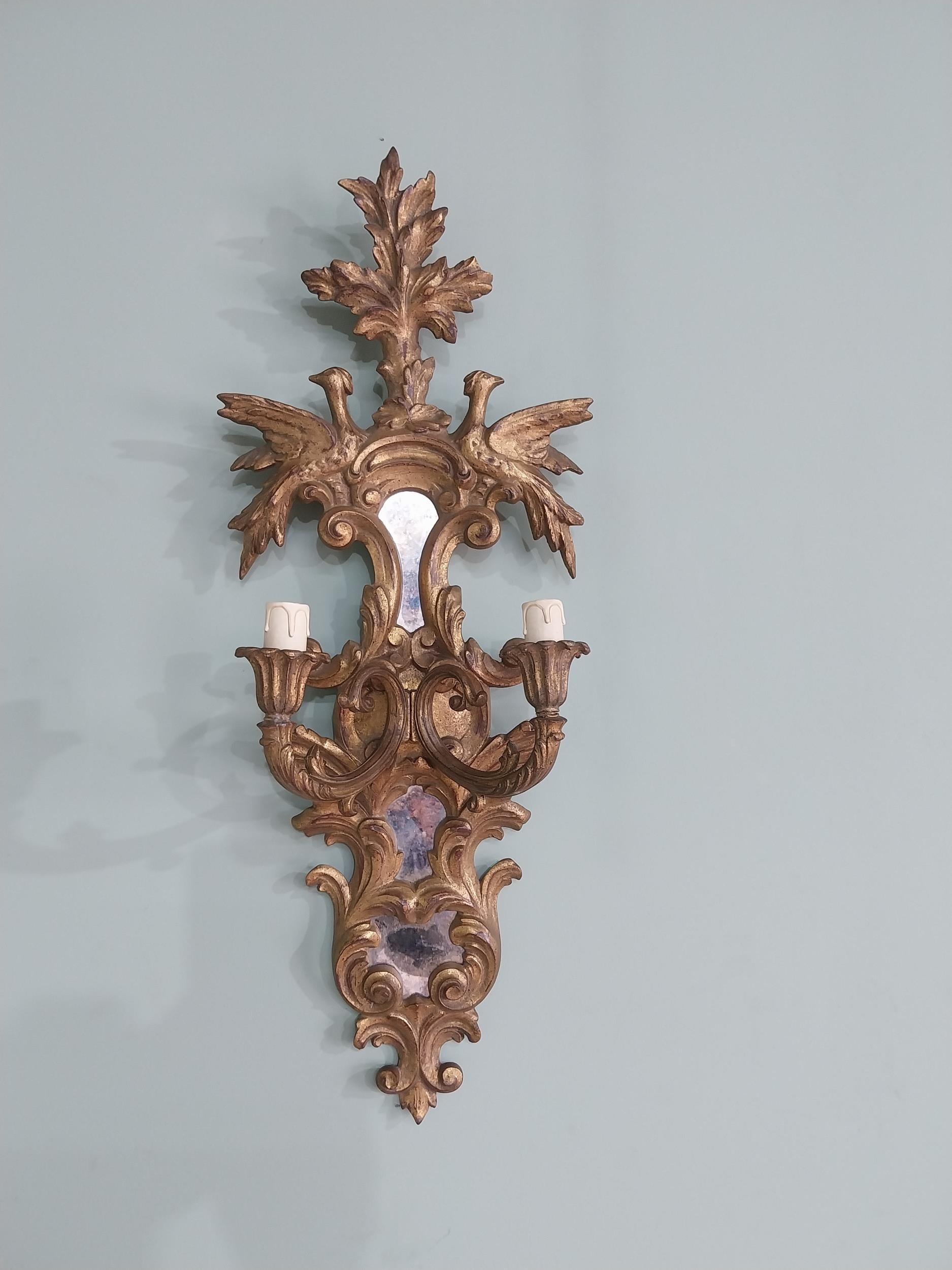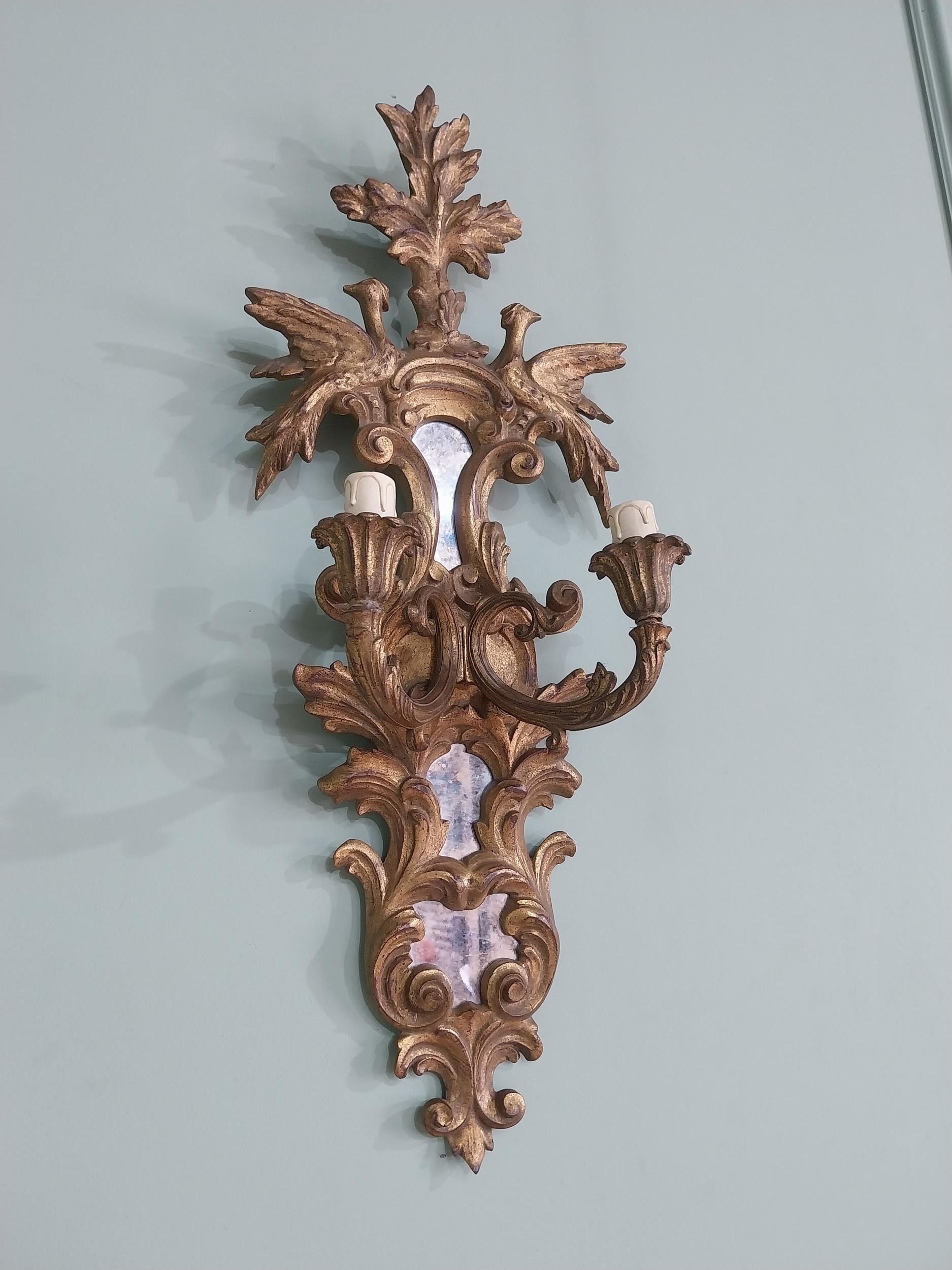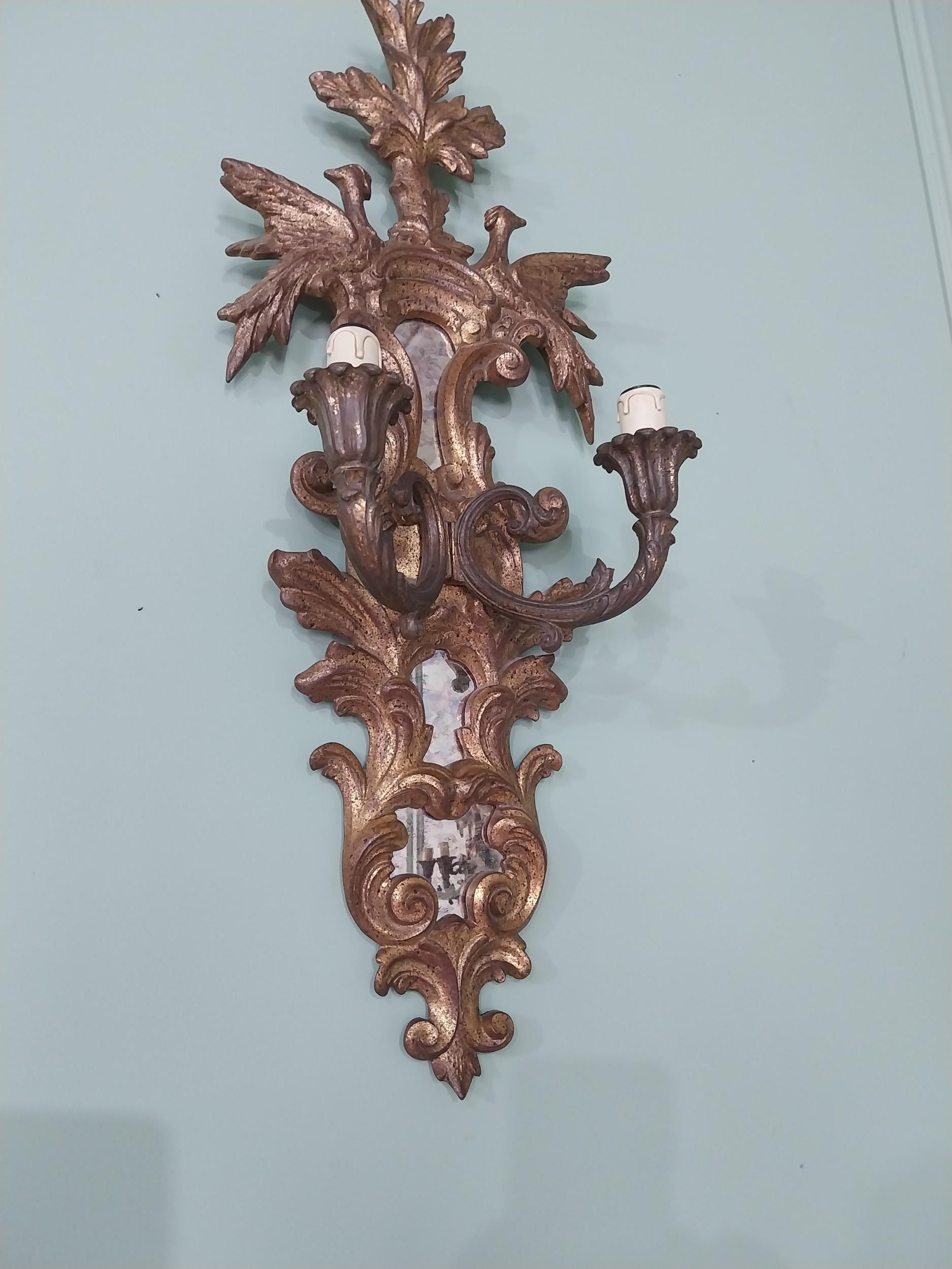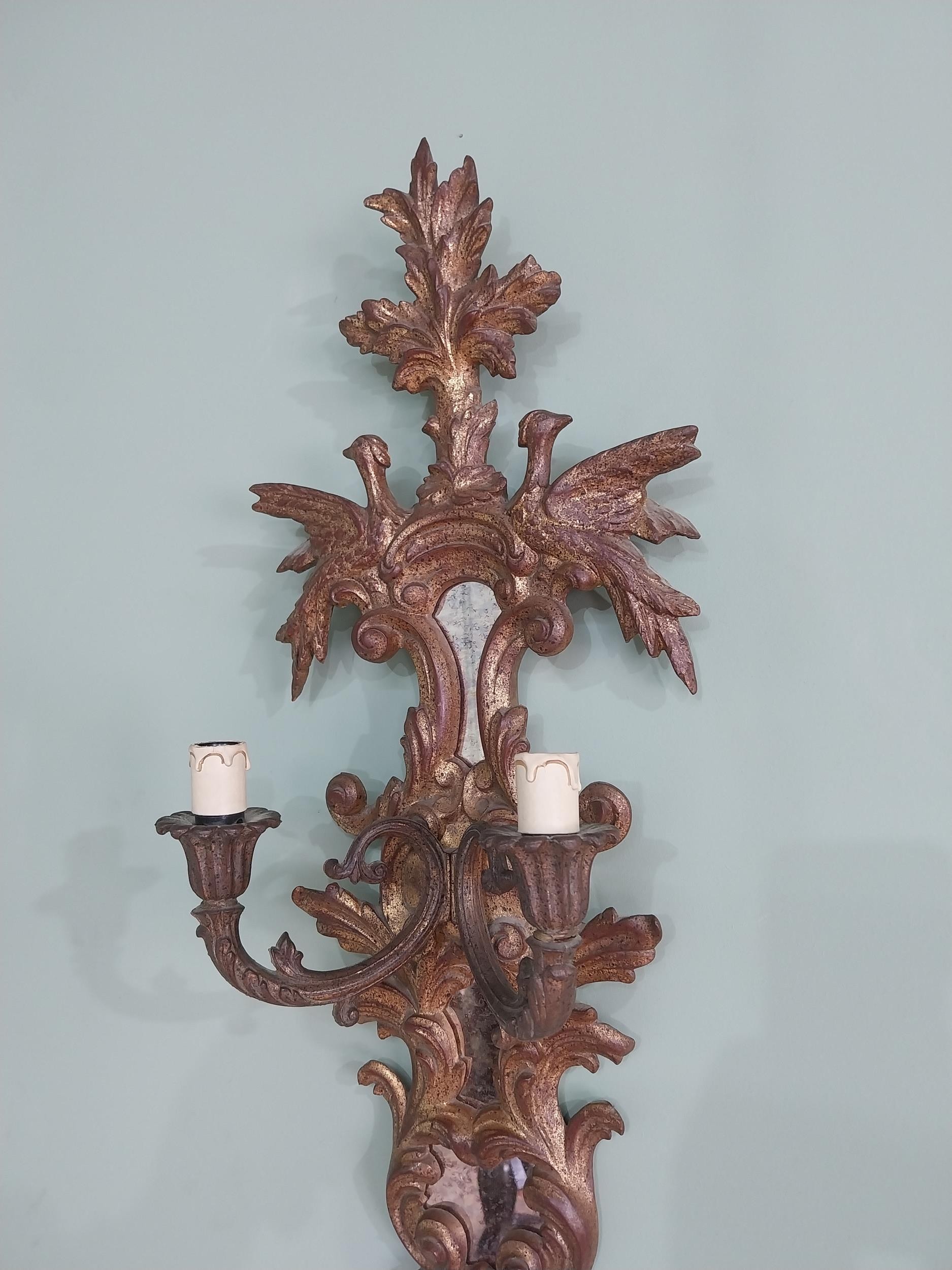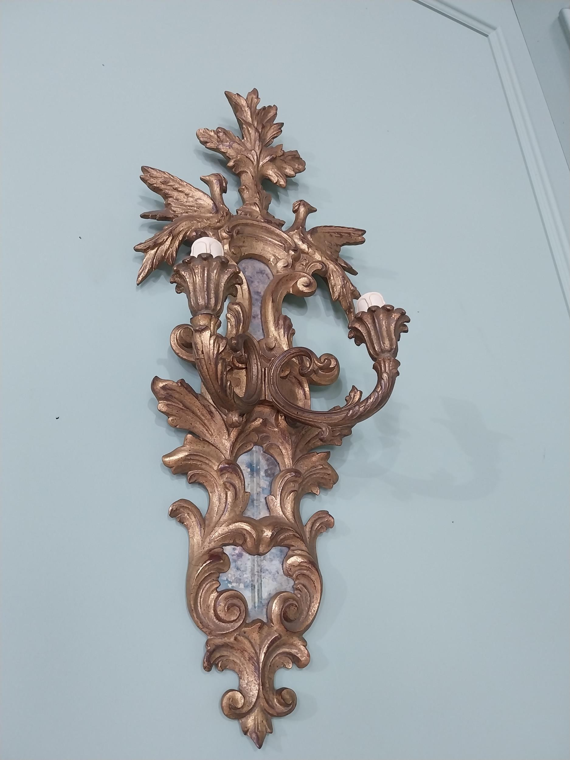 Pair of good quality giltwood and mirrored wall sconces decorated with Hoho birds and double wall light in the Rococo style {70 cm H x 25 cm W x 13 cm D}.