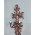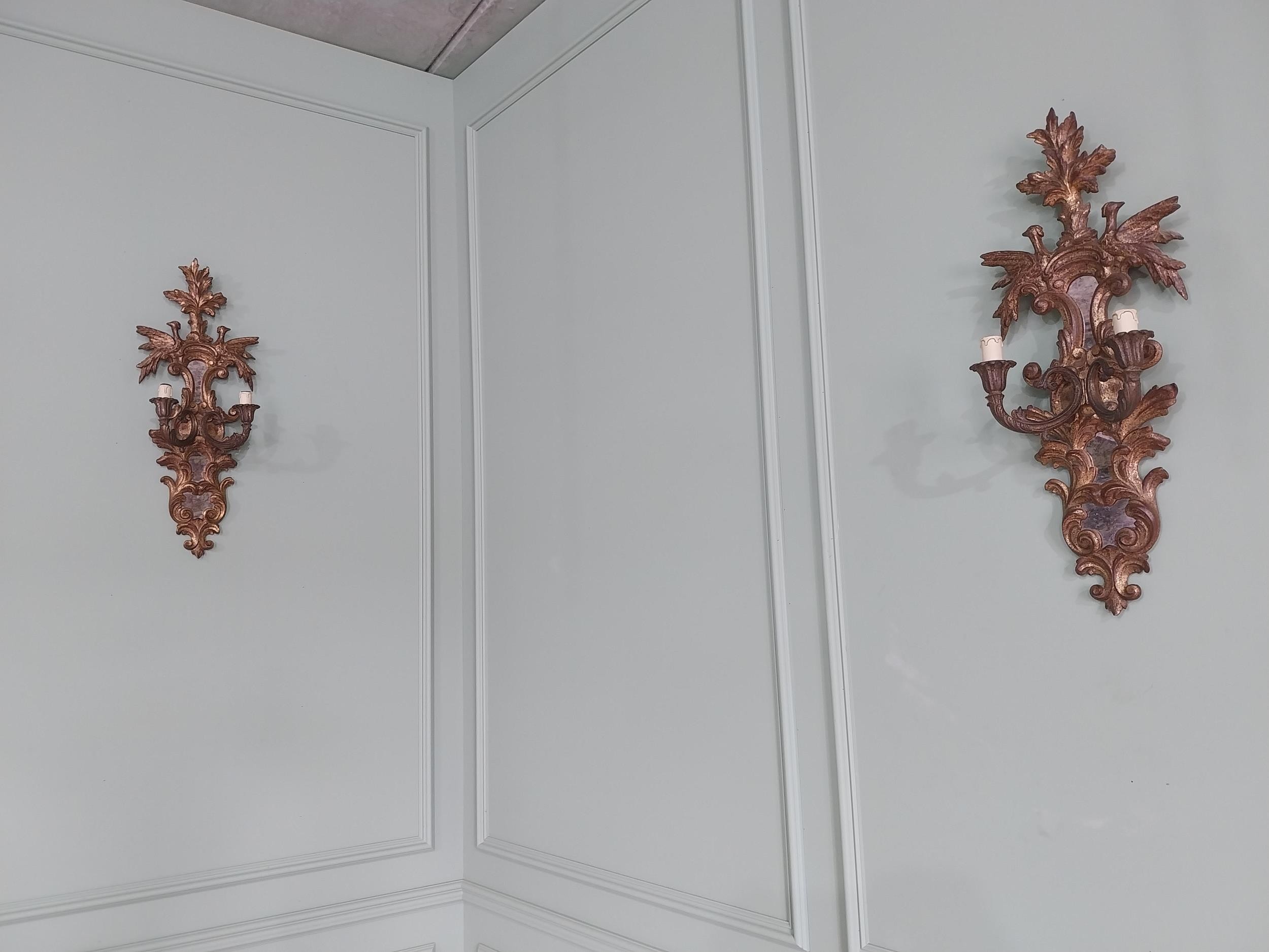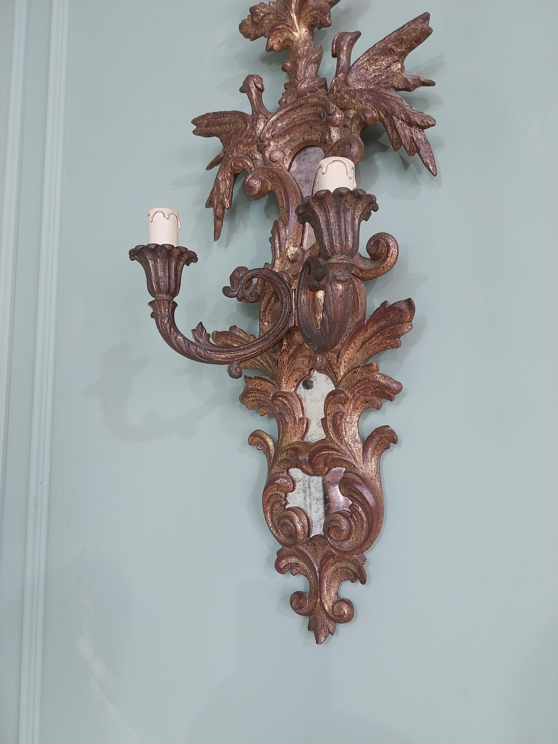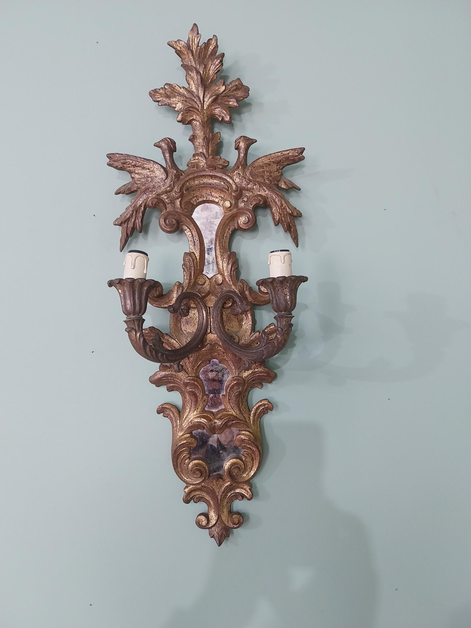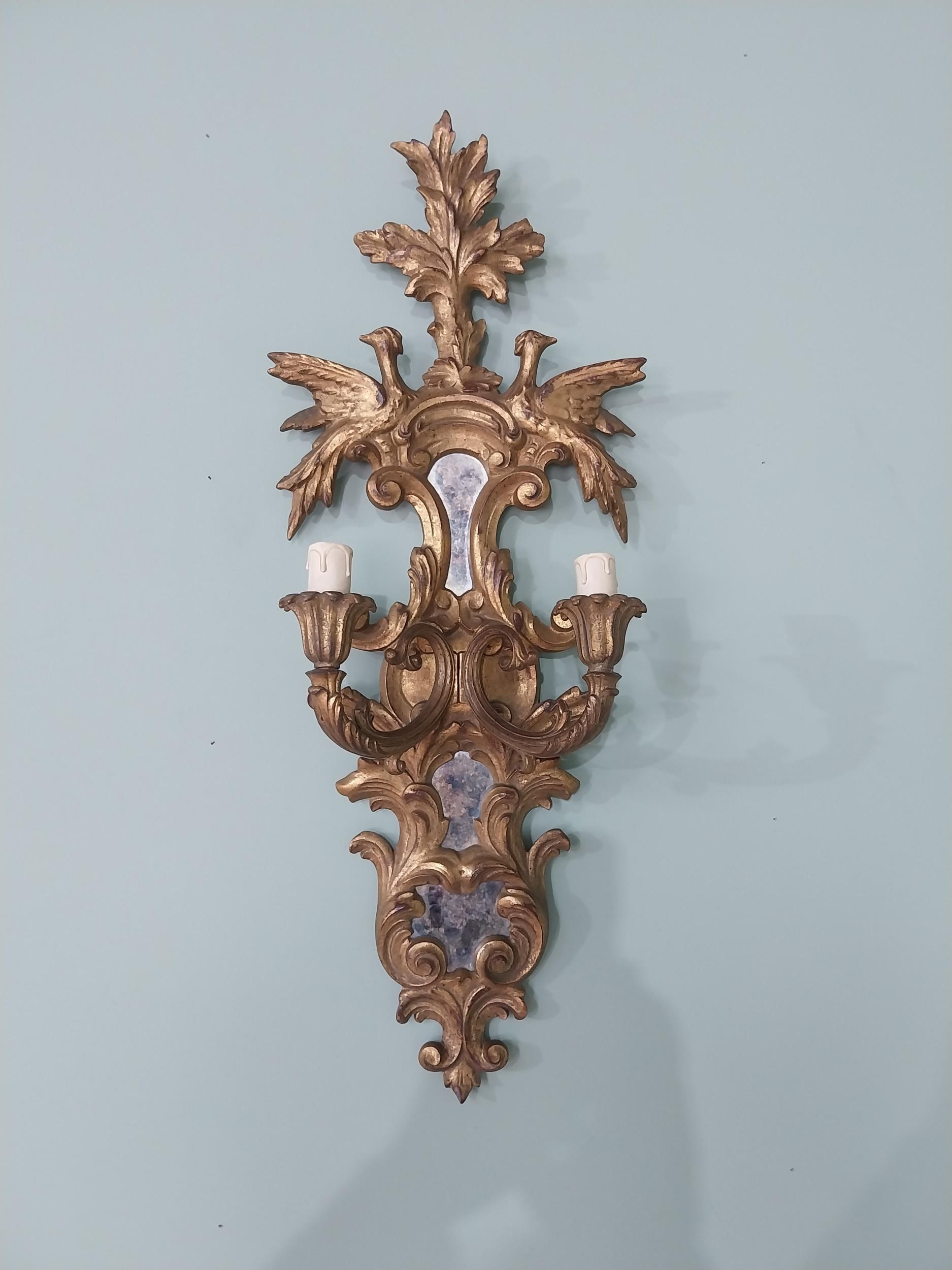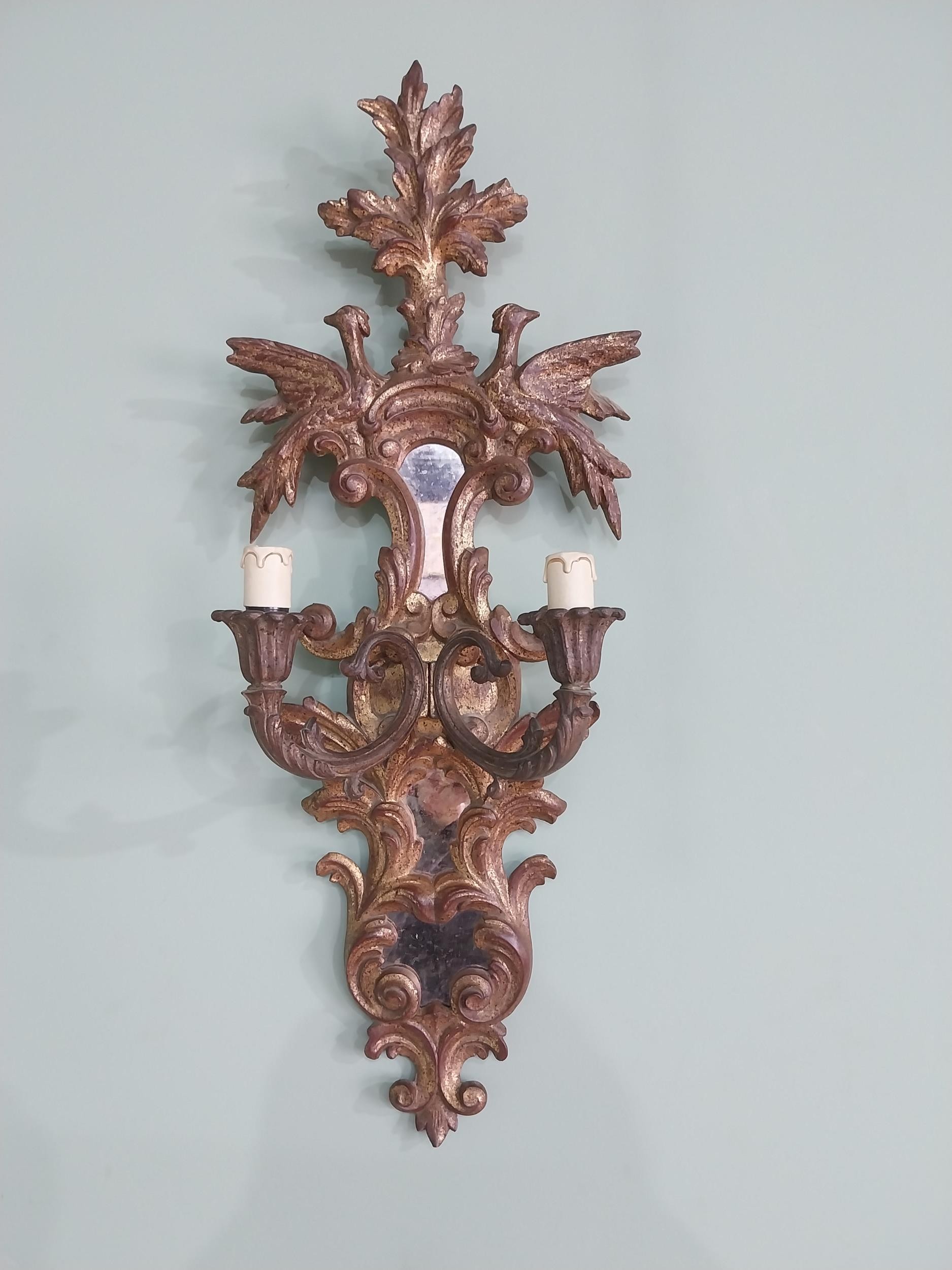 Pair of good quality giltwood and mirrored wall sconces decorated with Hoho birds and double wall light in the Rococo style {70 cm H x 25 cm W x 13 cm D}.