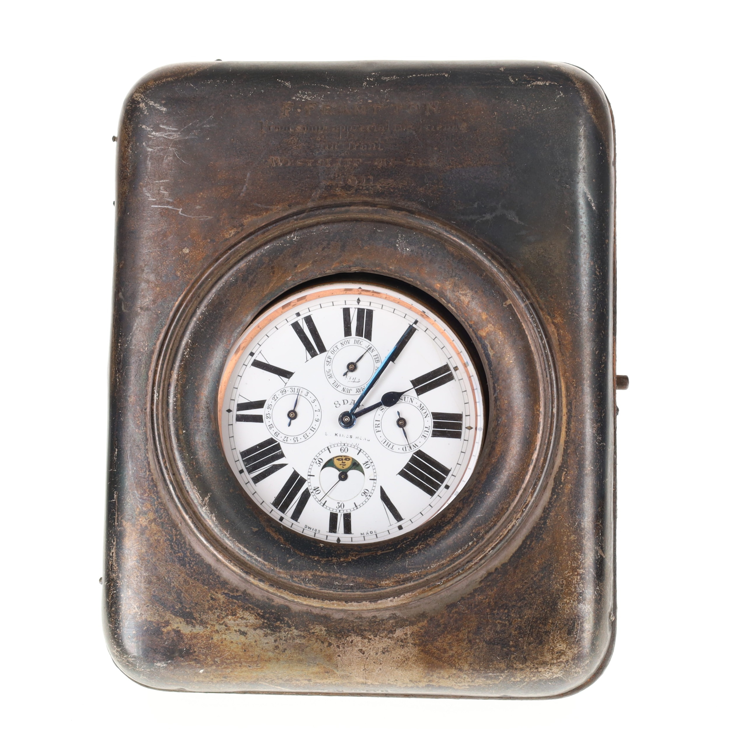 Vintage Jumbo 8 Days Triple Calendar Moonphase Pocket Watch. Hand wind pin set triple calendar moonphase movement, unsigned. Case is made from base metal, mantle case is made from leather, wood and silver cap on the front with engraved message. Glass crystal. White enamel dial with enlarged Roman numerals. Date, month and day sub dials at 9, 12 and 3 o'clock respectively. Seconds sub dial and moonphase and 6 o'clock. Watch is in full working order.