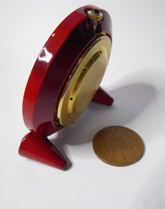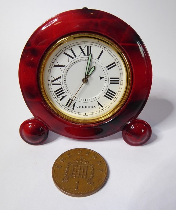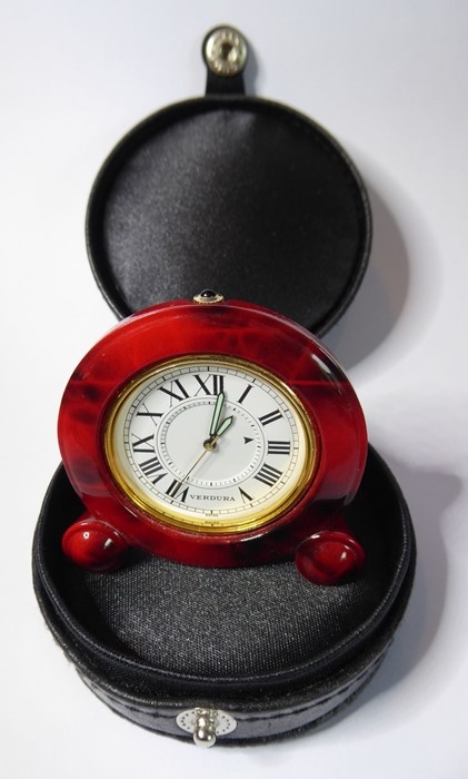 A Verdura miniature travel clock; red-and-brown faux-marble case surrounding a gold insert and white-enamel dial with Roman numerals and signed Verdura to the 6 o'clock position, the dial with centre independently operated alarm mechanism hand, presentation inscription verso dated 30.6.01