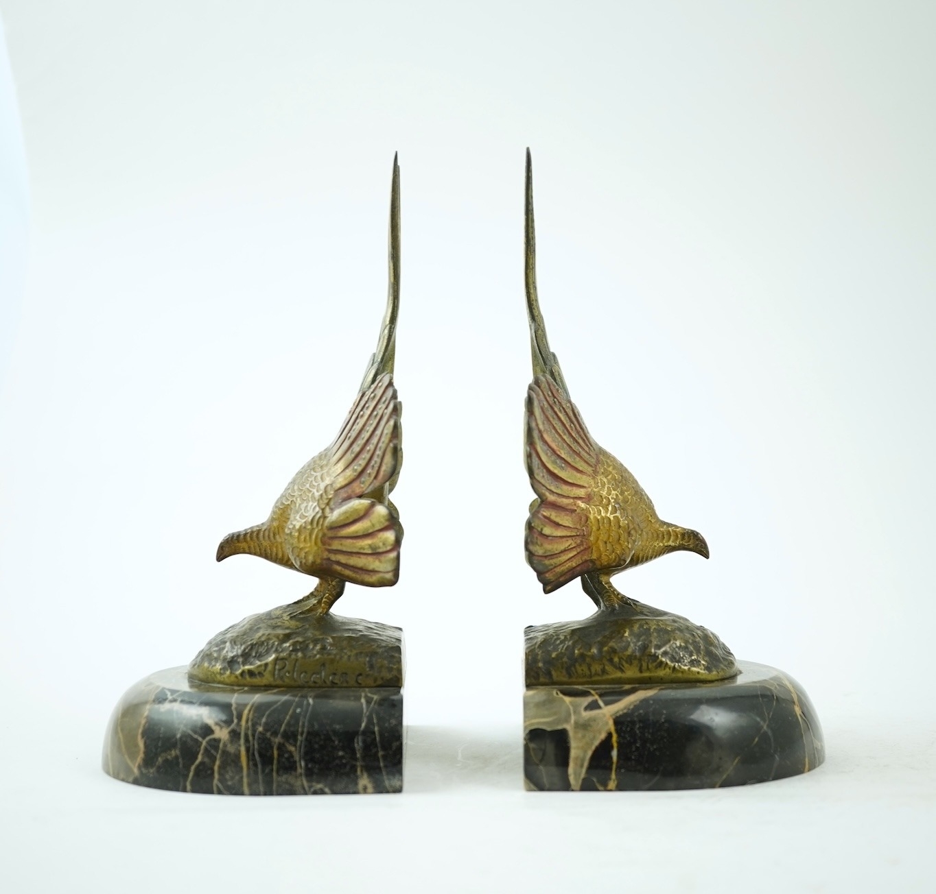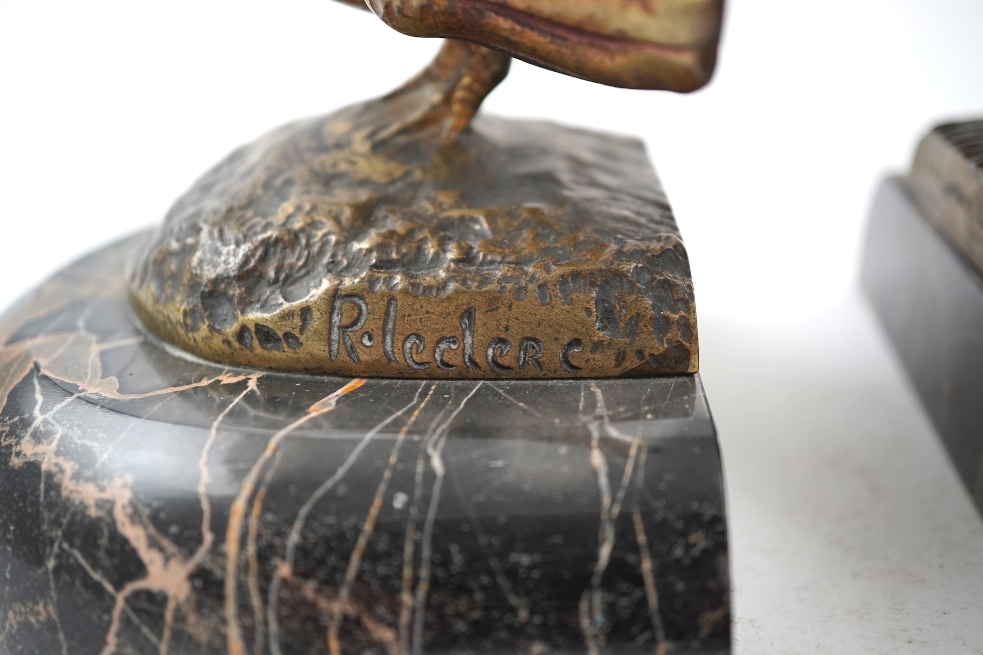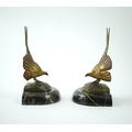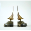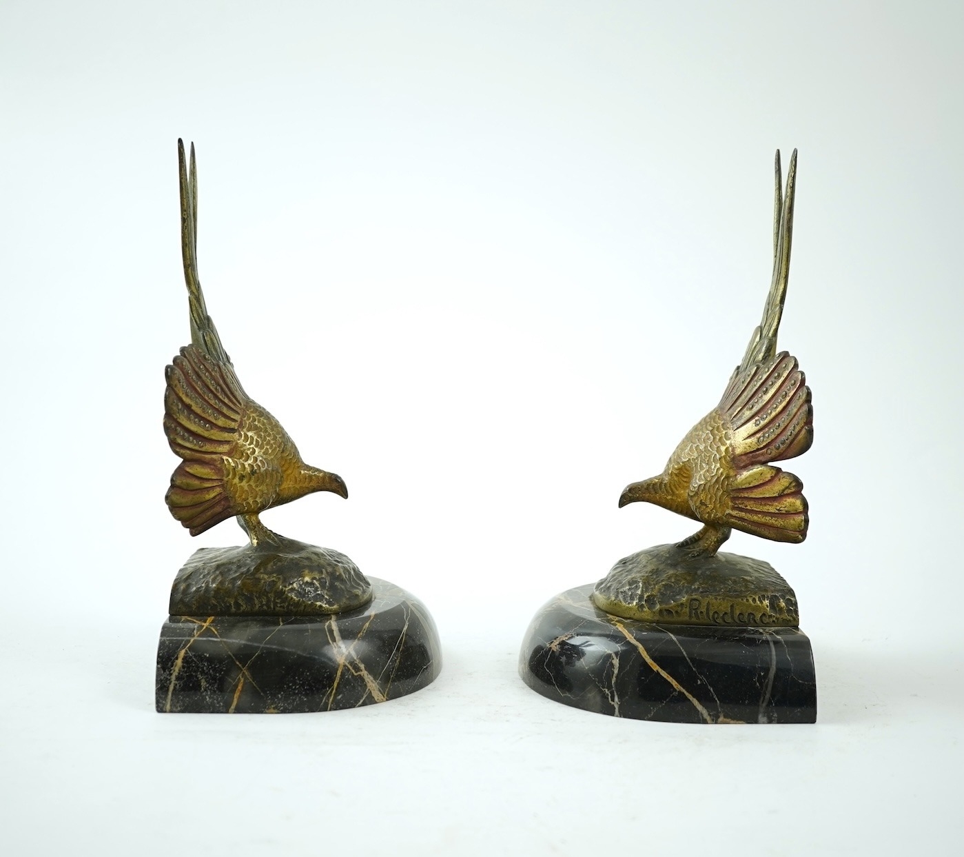 A pair of bronze peacock bookends, with remains of coloured pigments, marble plinths, signed R. Leclerc, 20cm