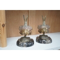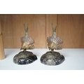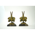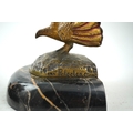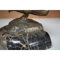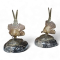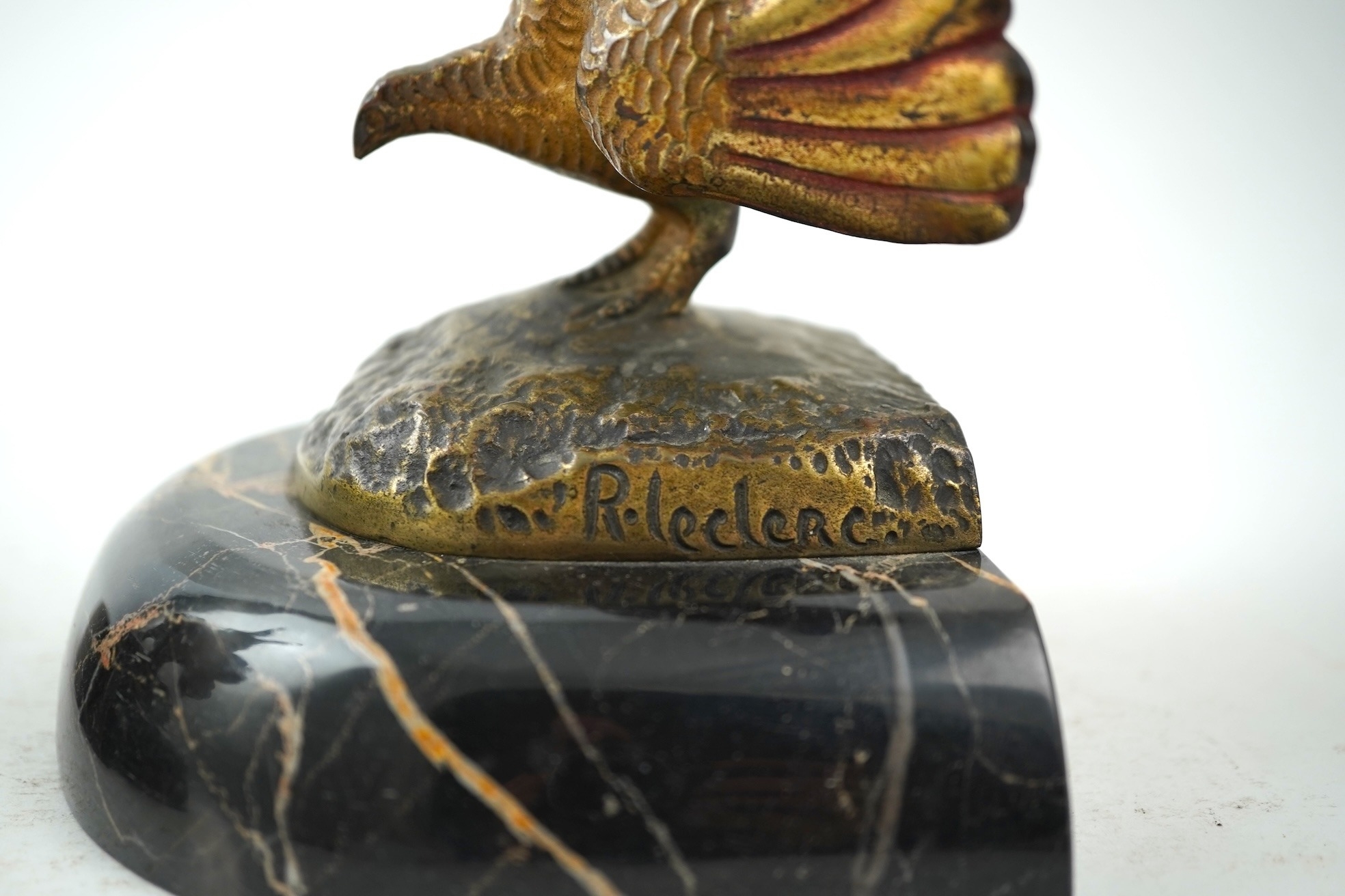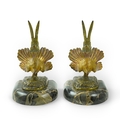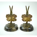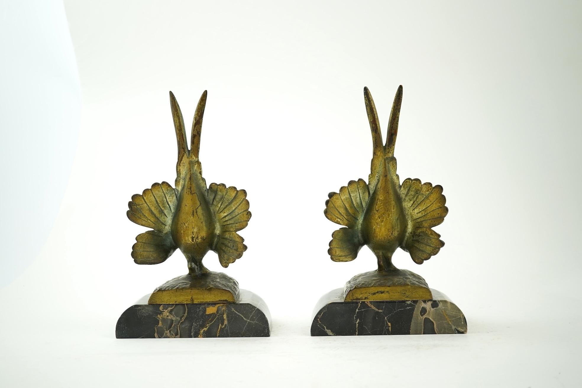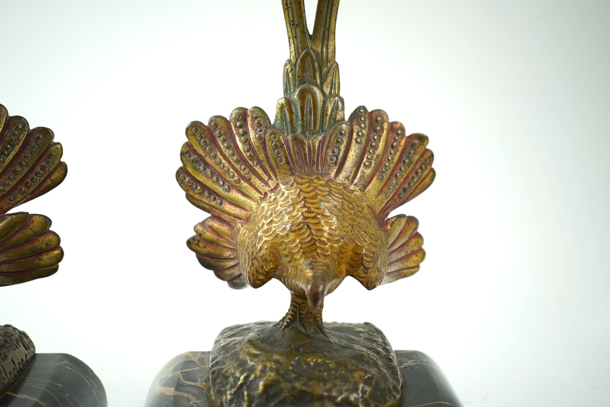 A pair of bronze peacock bookends, with remains of coloured pigments, marble plinths, signed R. Leclerc, 20cm