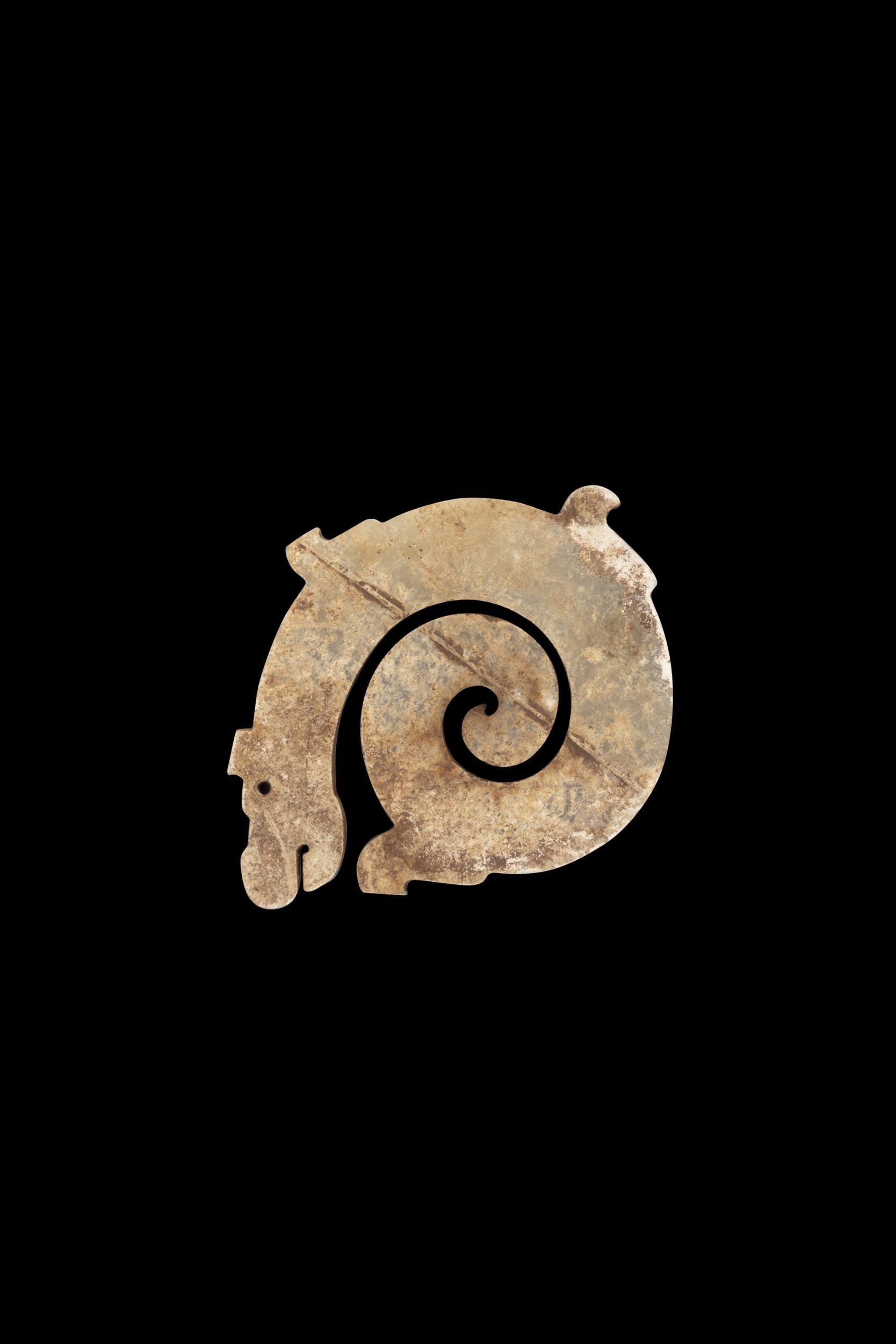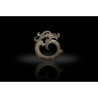 A CALCIFIED CELADON JADE DRAGON PENDANT ???? ???? China, Han style H. 8.1cm