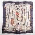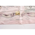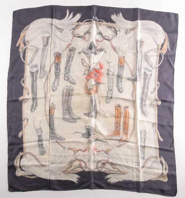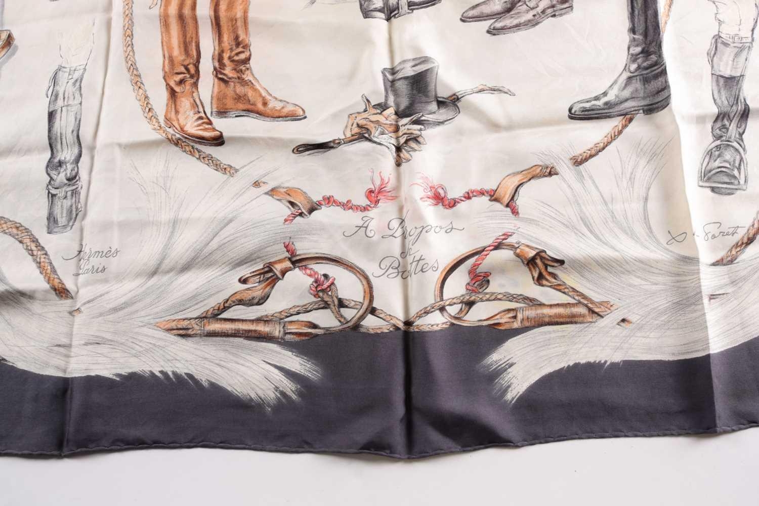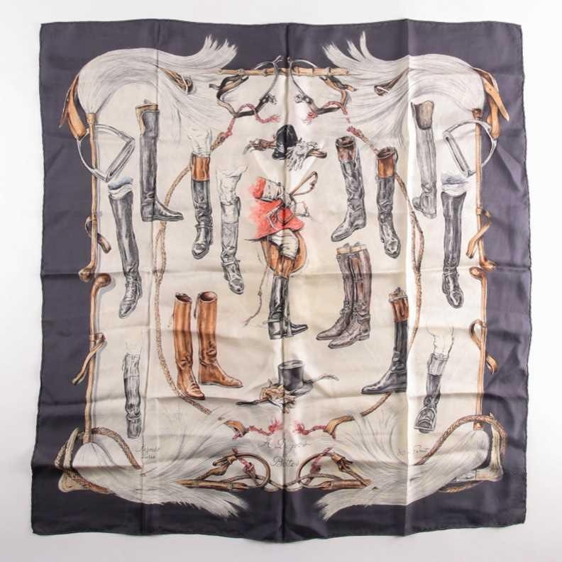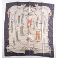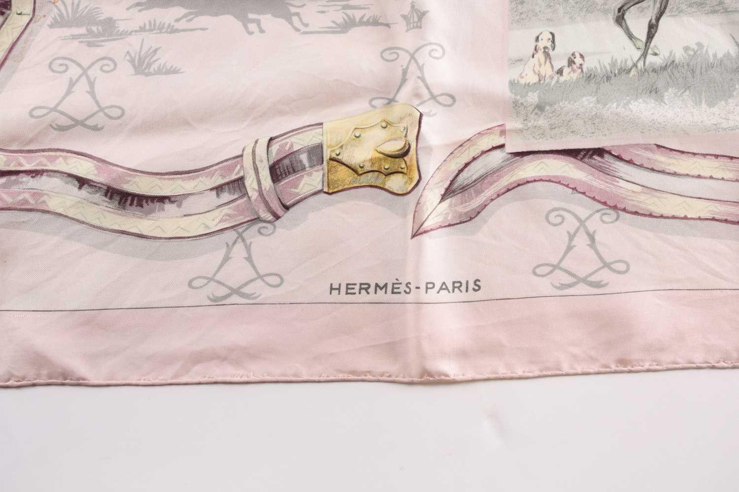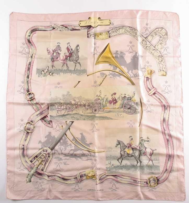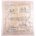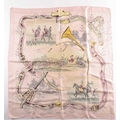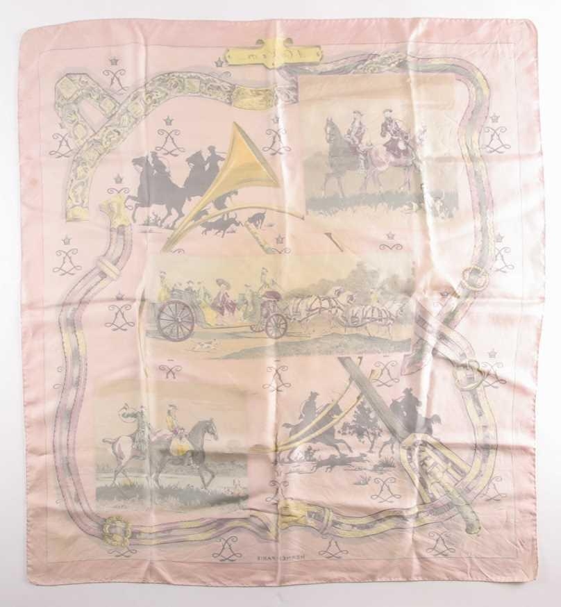 A Hermes silk square scarf printed with coaching scenes on a pink ground, together with another "A Propos de Bottes" pattern Hermes silk scarf designed by by Xavier de Poret (2)