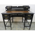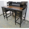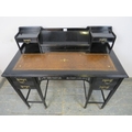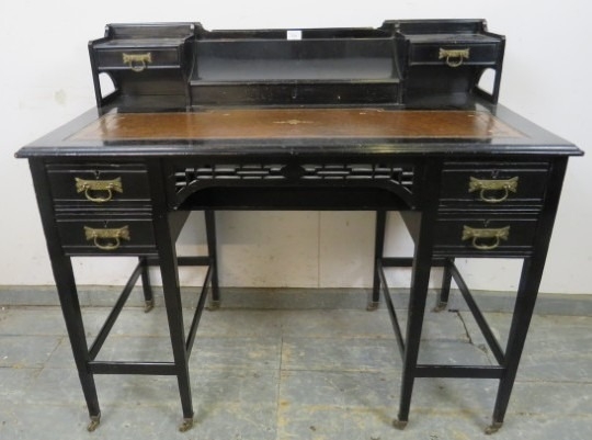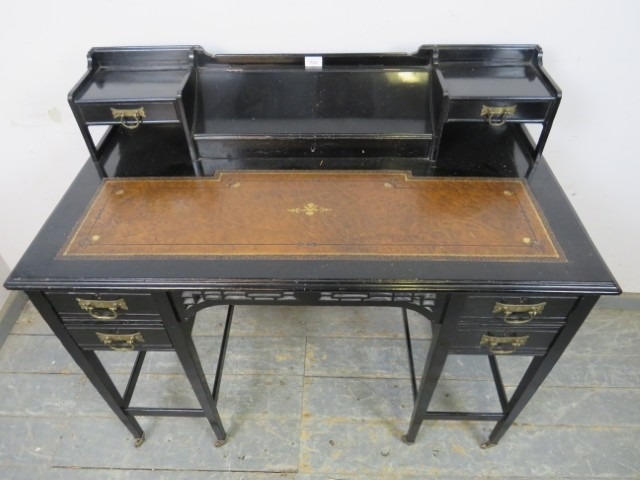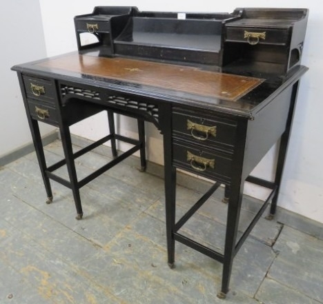 A late 19th Century Aesthetic Movement ebonised Ladies Desk standing on tapered legs with two drawers either side. The top has brown tooled leather finish below two drawers and a central stationery rack. H94cm x W107cm x D57cm approx.