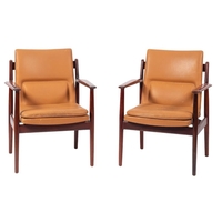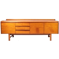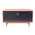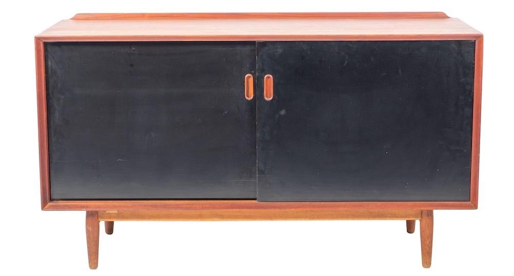 A teak sideboard, by Sibast Furniture, circa 1960s; with maker's plaque; the top with raised back, above two ebonised sliding doors, on short tapered oak legs; 79cm high, 137cm wide, 50cm deep