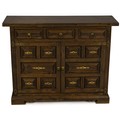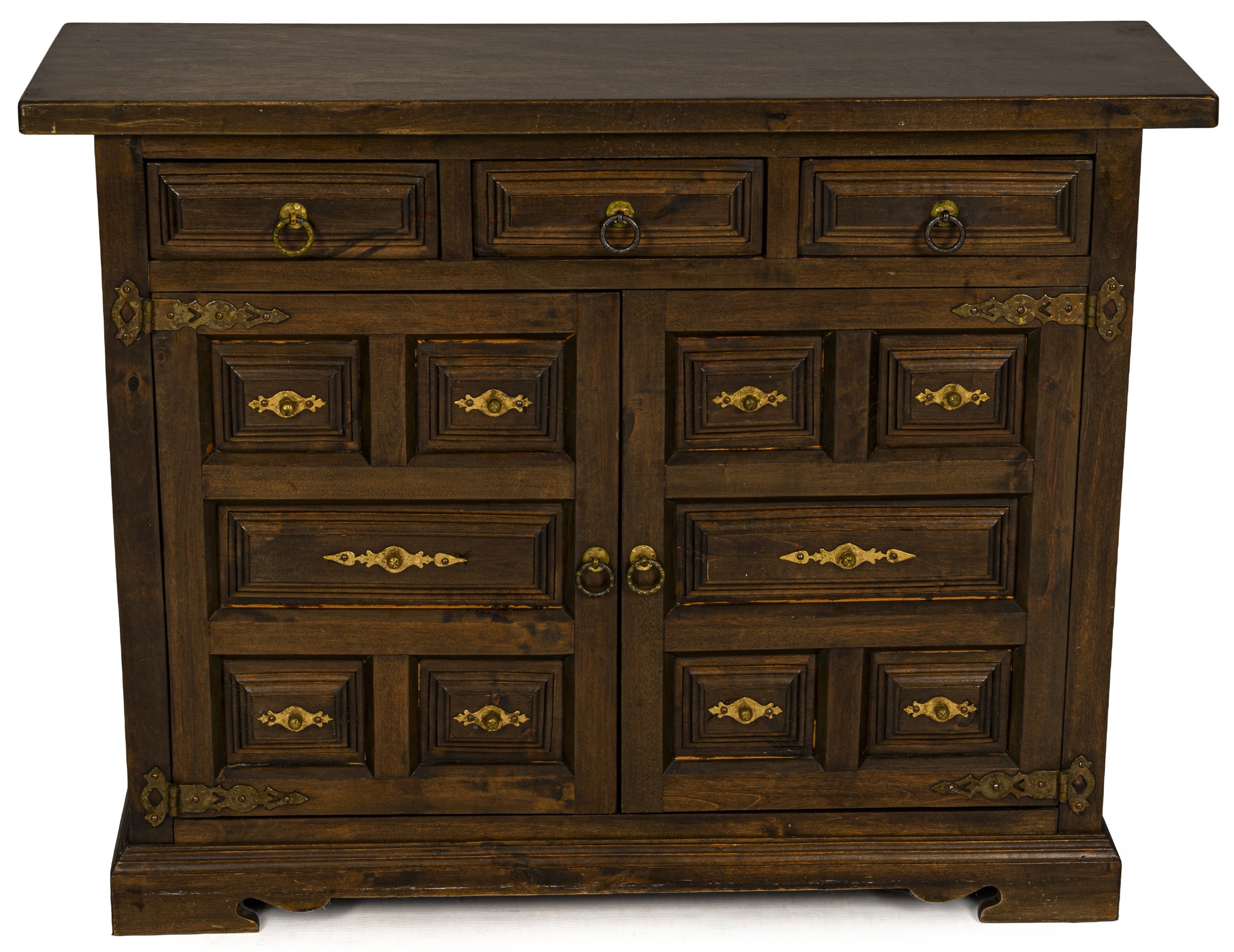 The rectangular top above three frieze drawers, a pair of paneled doors below mounted with a group of faux drawers, decorated with moulded panel fronts, ornate brass escutcheons, and ring handles, on a plinth base with bracket feet