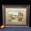 An original oil on board, titled 'Trout Inn, Godstown, Upper Thames'. Signed E. P. , dated 1921. Shows beautiful roman style bridge over a tranquil waterway. Mm: 52 cm x 62 cm.