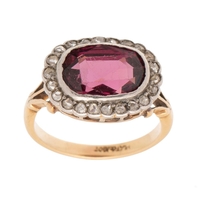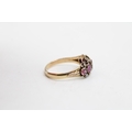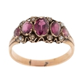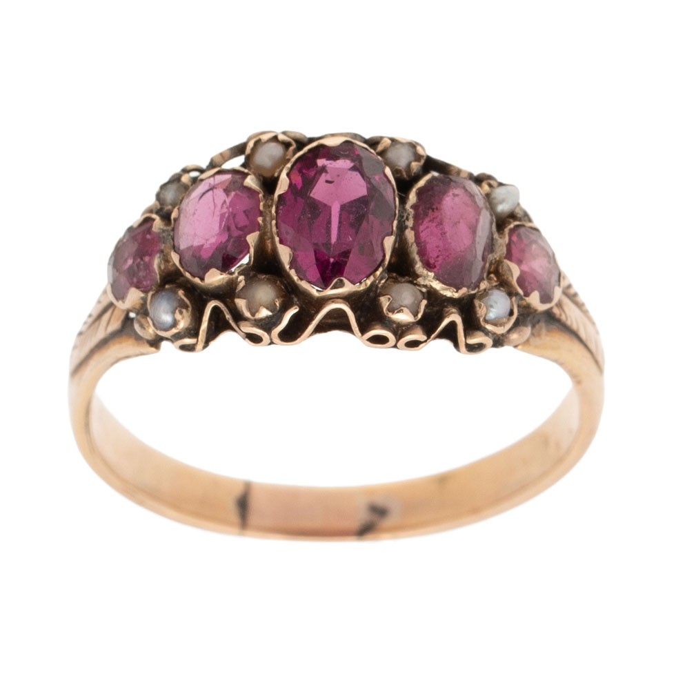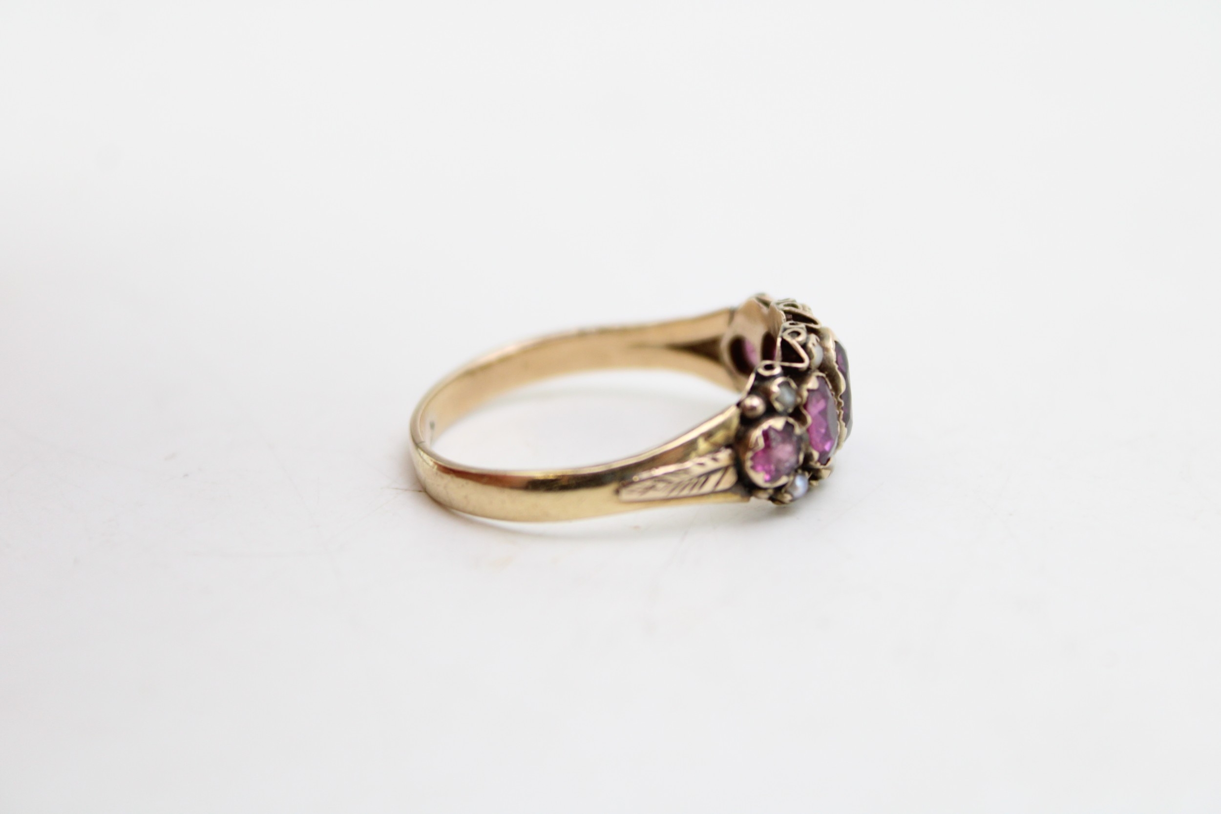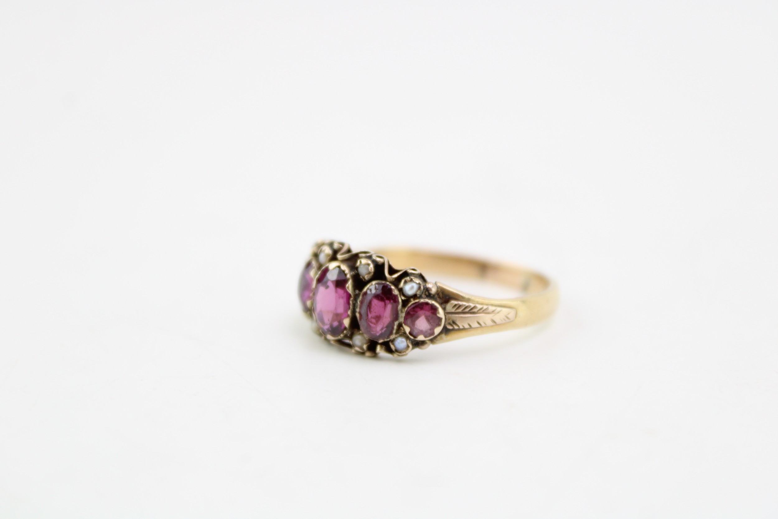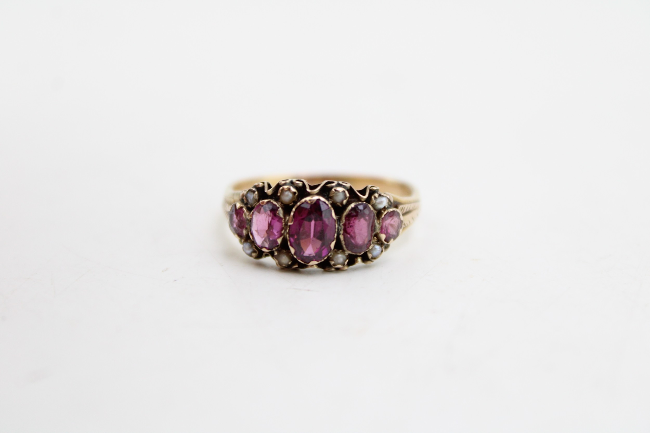 A Victorian, 15ct gold, amethyst five stone ring the oval amethysts accentuated with seed pearls in between, engraved foliate detail to the shoulders, ring size P, marks totally worn but testing as 15ct gold, total weight 2.6g.