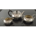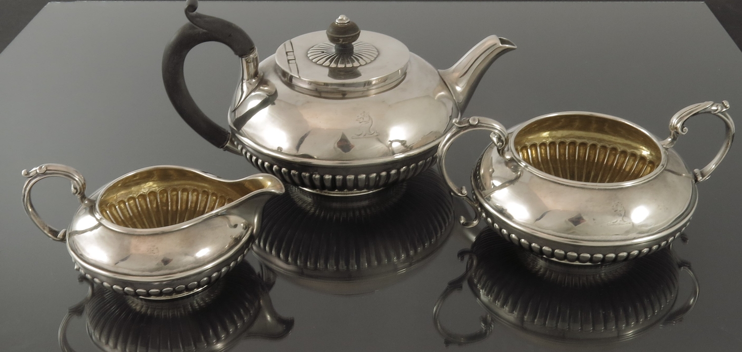 A George IV and Victorian silver three piece tea set, Richard Sibley I, London 1826 and 1839, squat ovoid form, half reeded, with scroll handles, ebonised handle and finial to the teapot, retailer stamp to all pieces Makepeace, London, 24.5cm long, 37.37ozt (3)