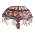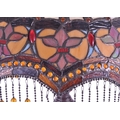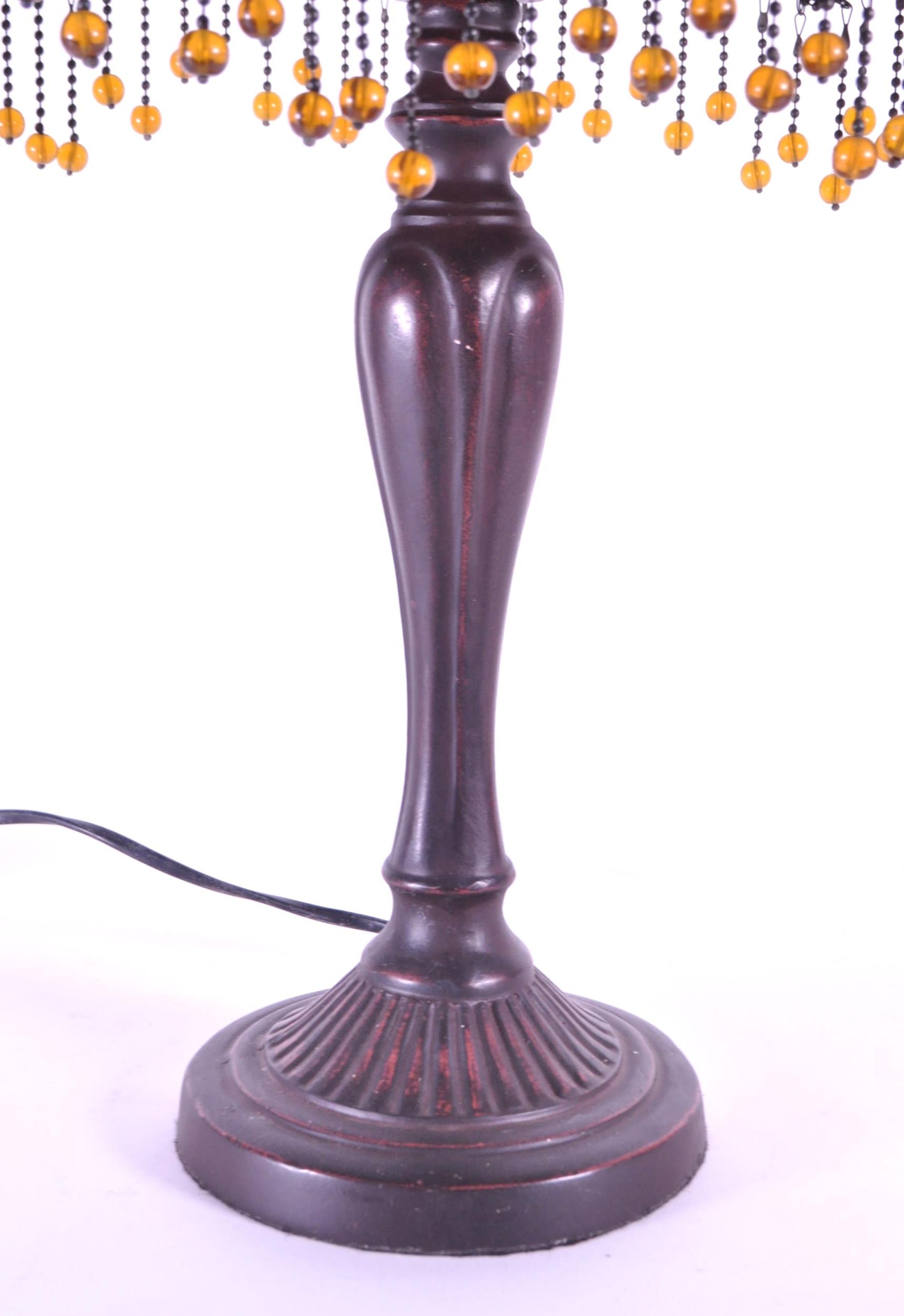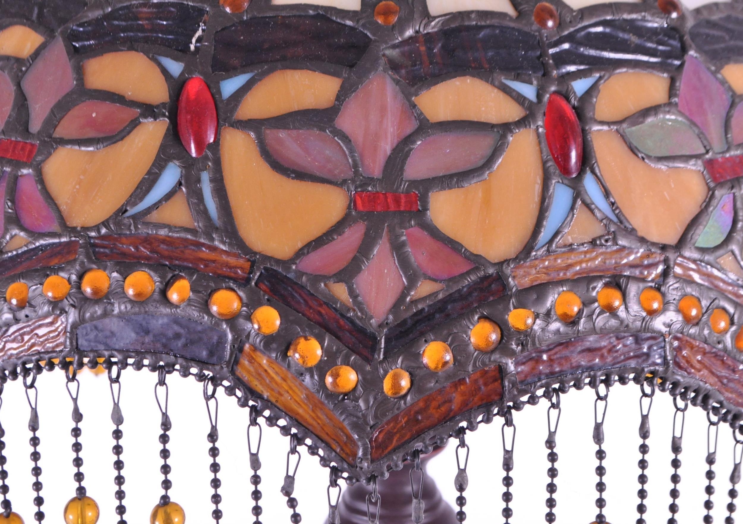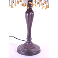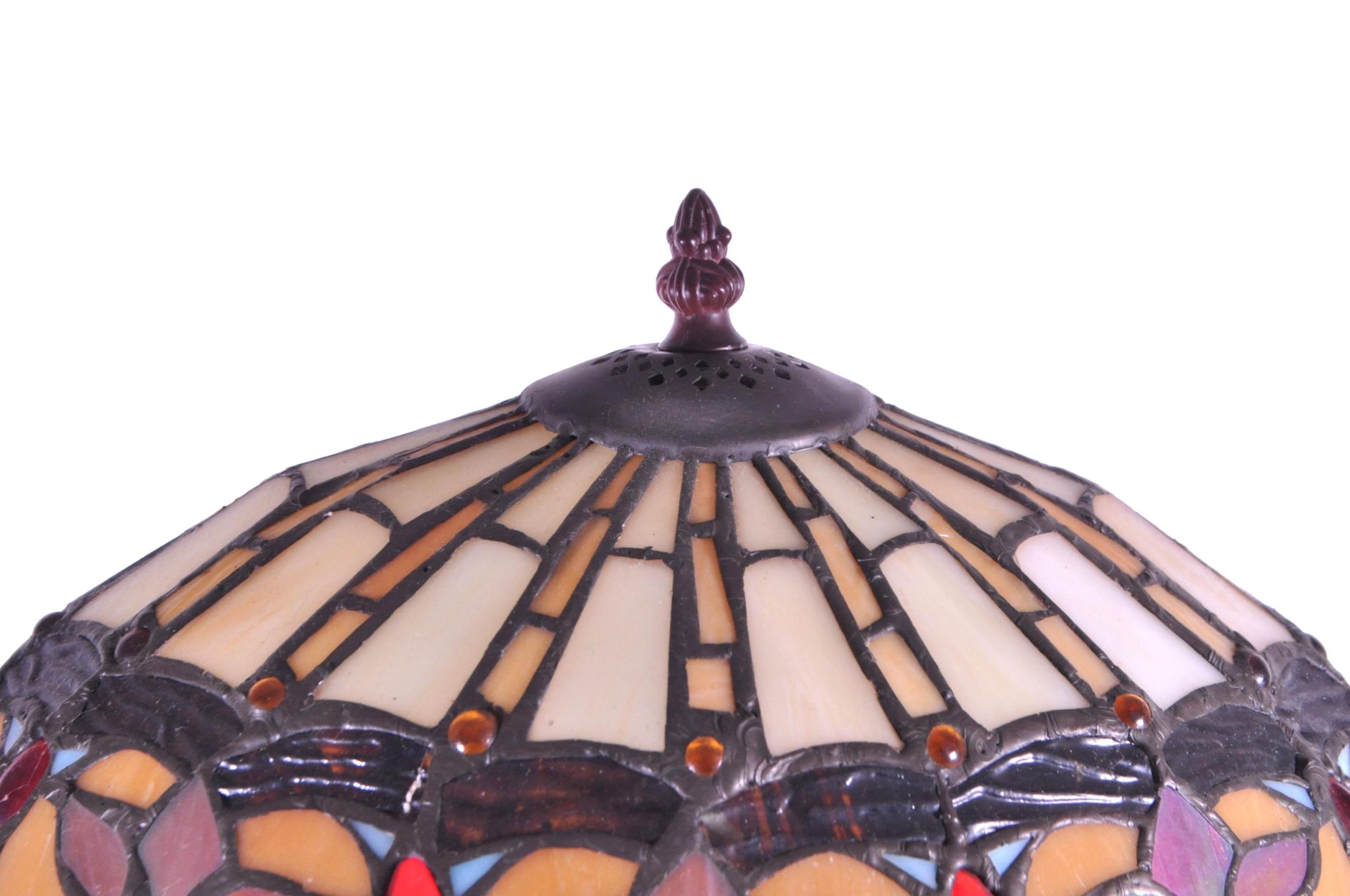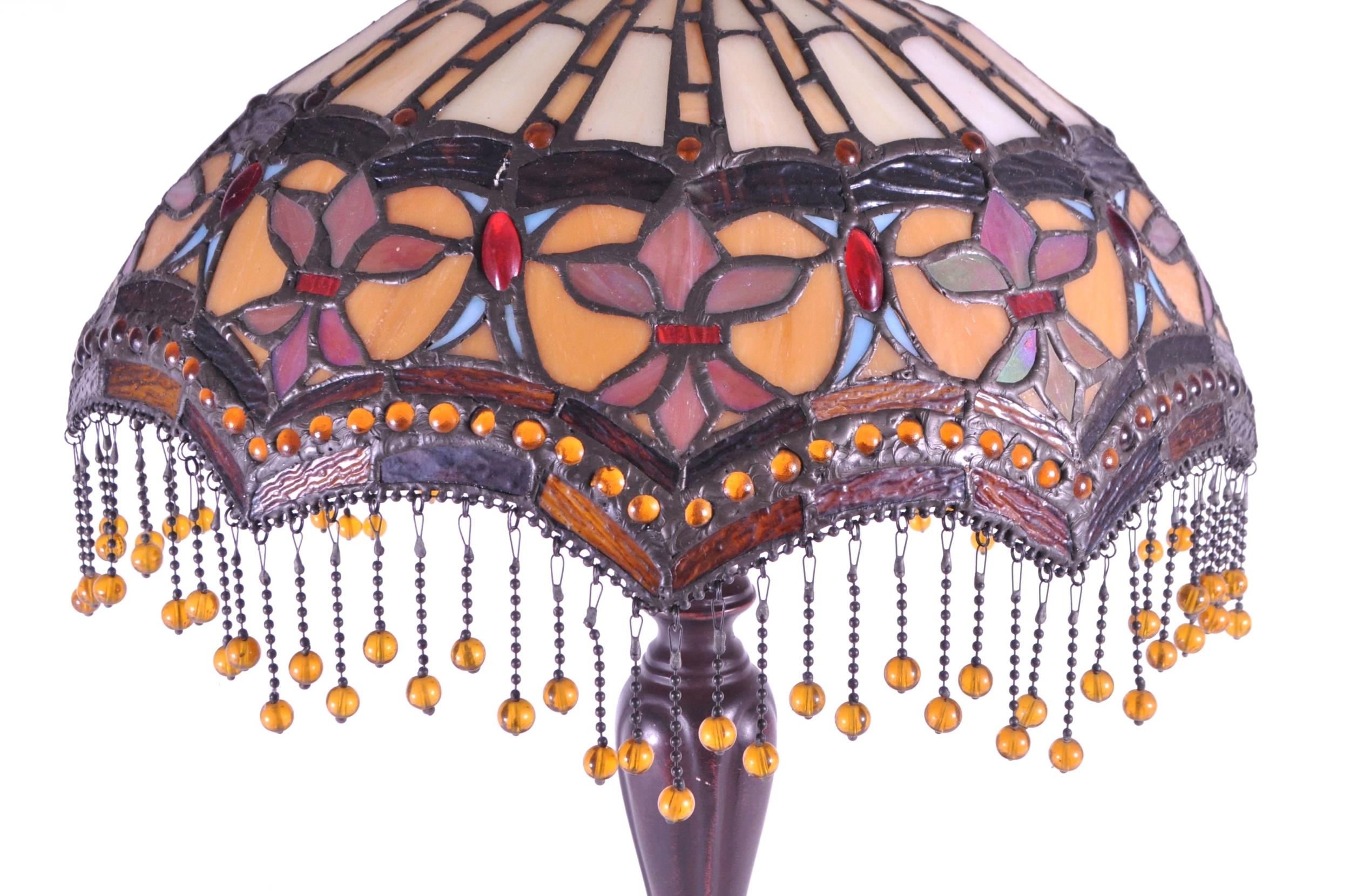 A 20th century Tiffany style table lamp. The lamp featuring a plinth style base with fluted gadrooned central column. Having an oval polychrome leaded glass shade, with cabochons and beaded tassels. Finial to top. Measuring approx. 53cm tall.