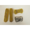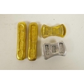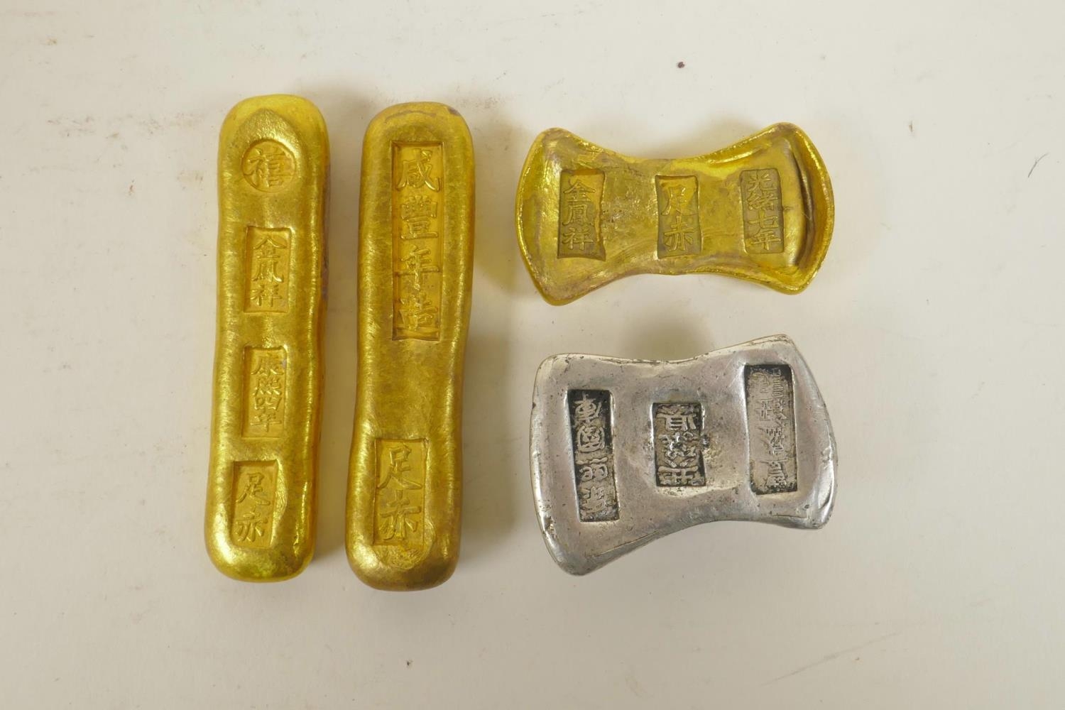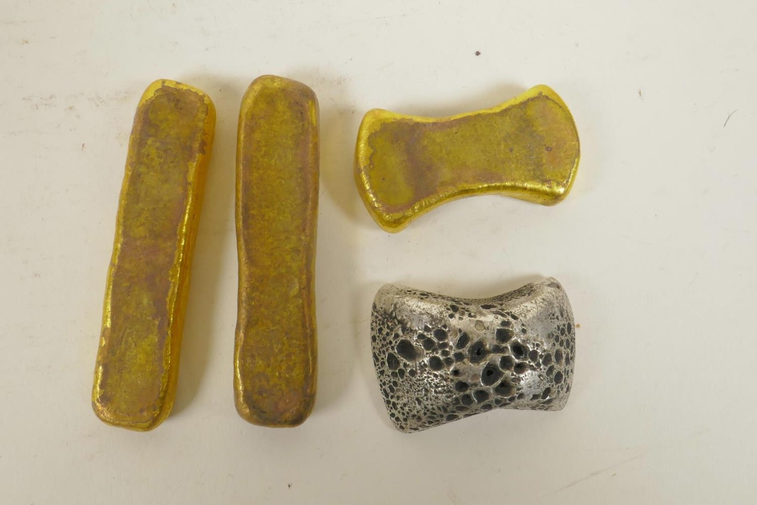 Three Chinese gilt metal trade tokens/ingots, and another in white metal, largest 3½" long