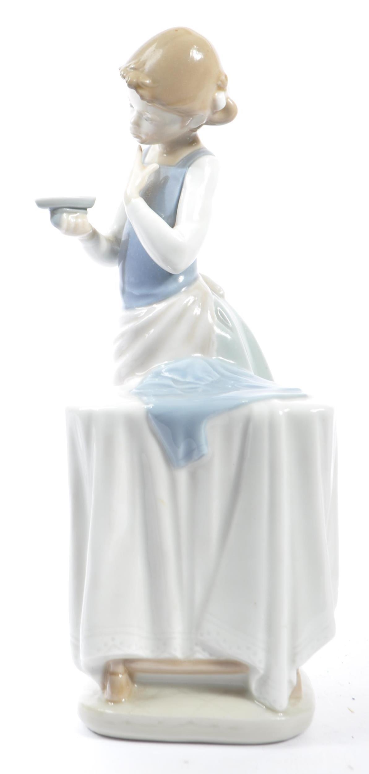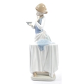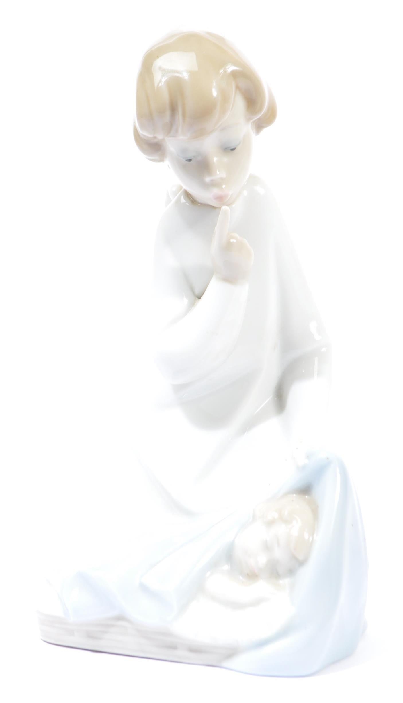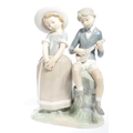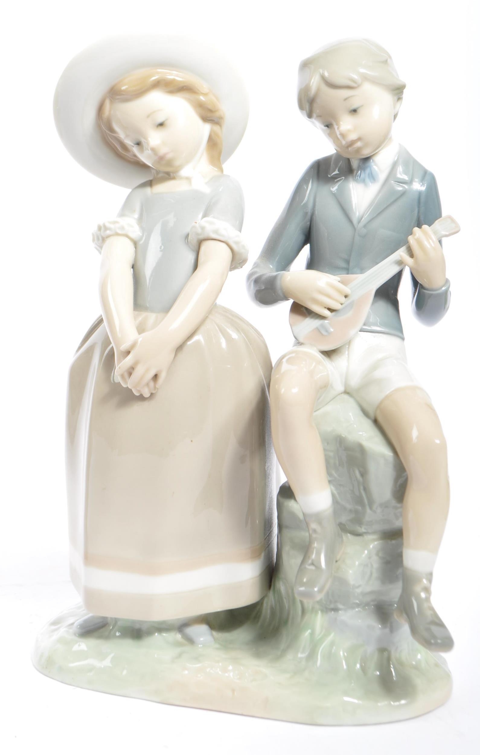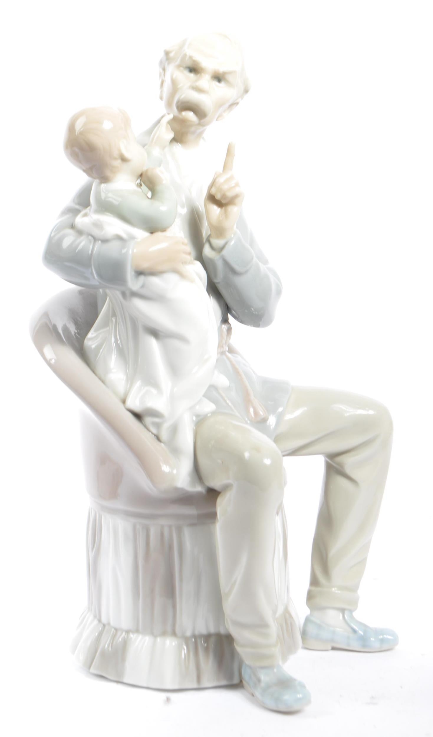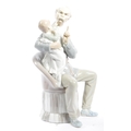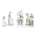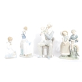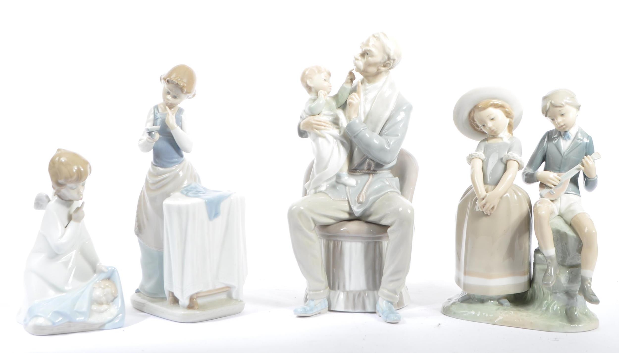 Lladro - An assortment of 20th century vintage Lladro Spanish porcelain figurines to include 4654 Grandfather Scolding Grandson, Guardian Angel with Baby 32, 4891 Girl Ironing and Girl and Boy with Mandolin. Measures 29cm tall.